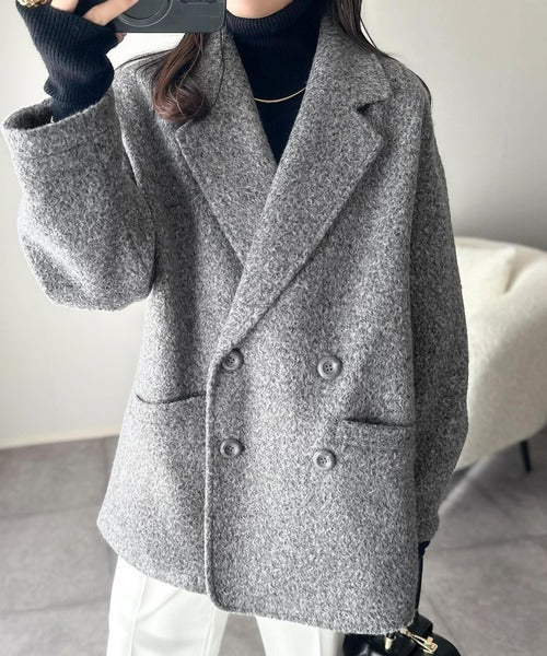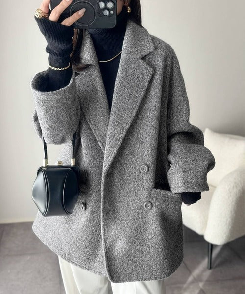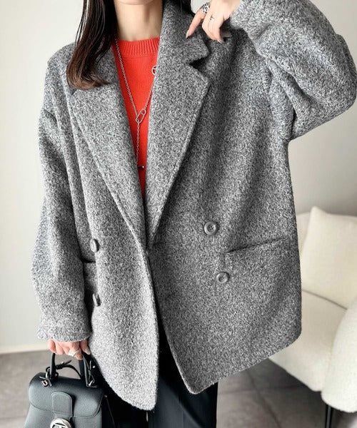 きちんと感のあるテーラードカラーに、ダブルボタンのデザインが大人っぽさをプラス。