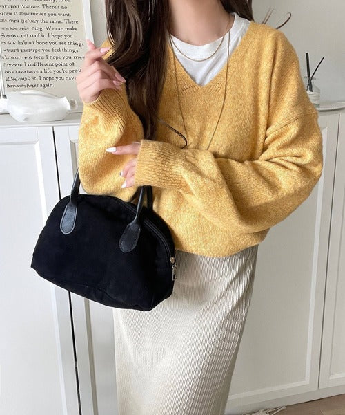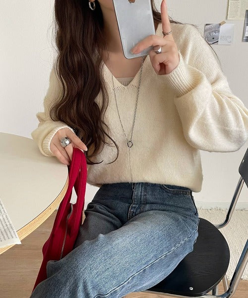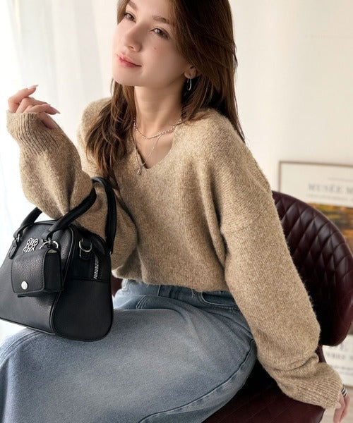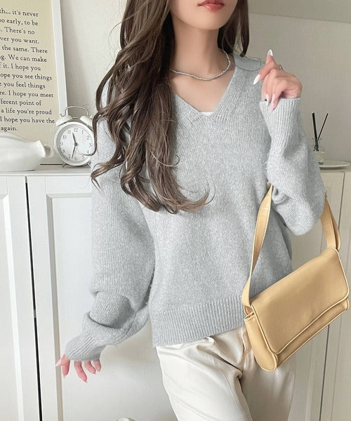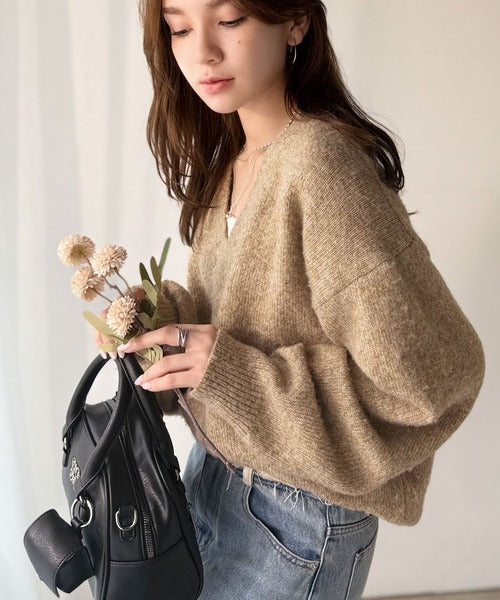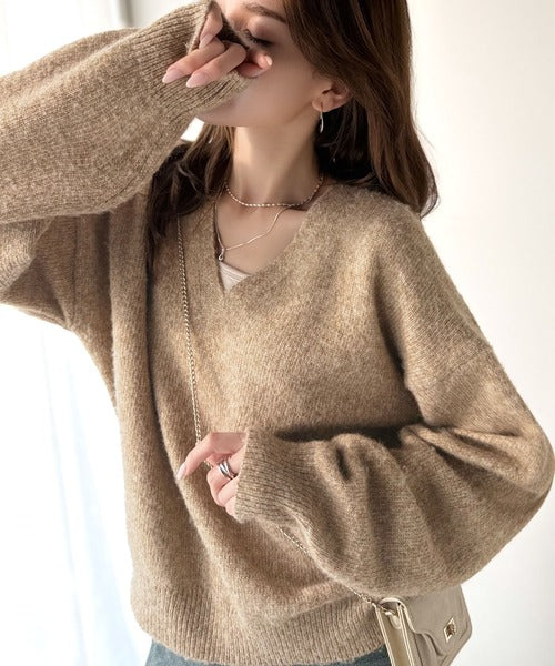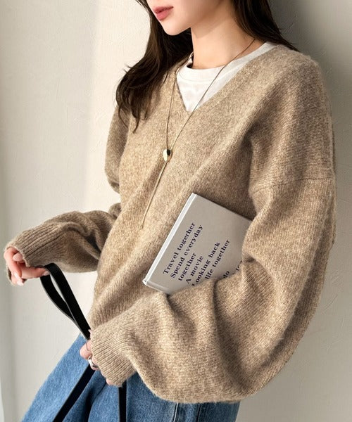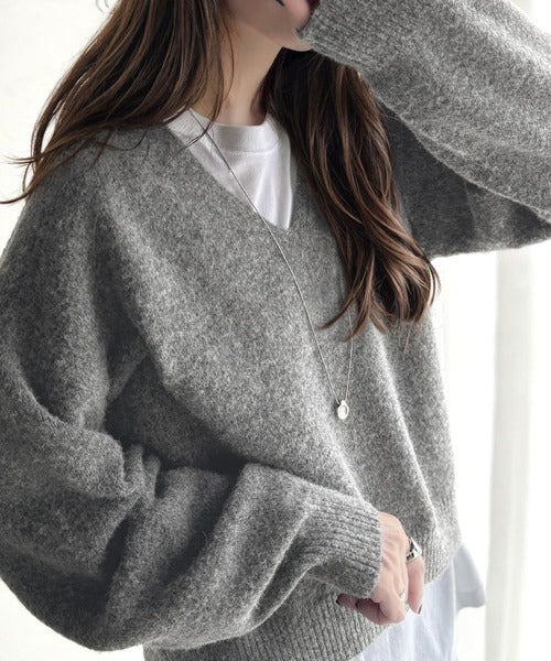 やわらかくふんわりとした質感が魅力の、メランジ調Vネックニットプルオーバー。