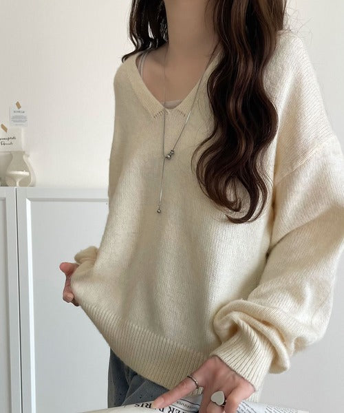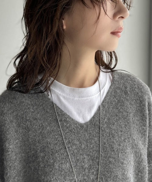 デコルテをきれいに見せるVネックで、大人のリラックススタイルにぴったりです。