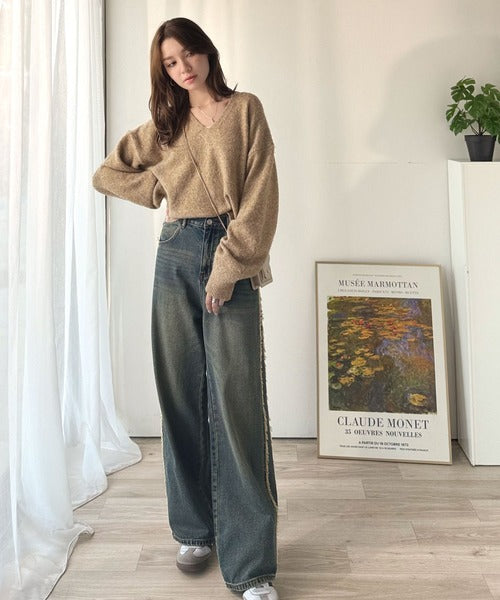 首元はすっきりと開いたVネックで、デコルテをきれいに見せつつ、抜け感のある大人な印象に。