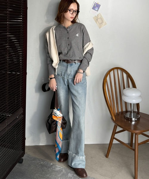 《Javaジャバコラボ》顔周りスッキリ&胸元刺繍で映える♪配色刺繍ヘンリーネックニット jv1240110