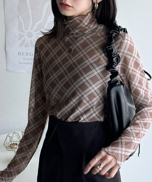 洗練された魅力を引き出す。チェックシアーハイネックメロウトップス(長袖) ce1010418