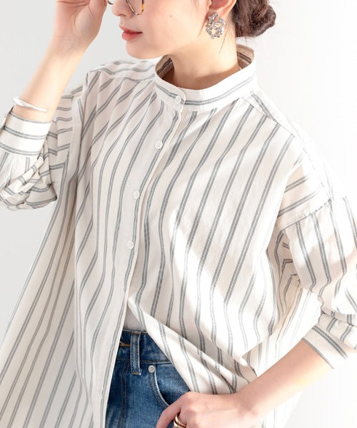 一枚で上級者見え。綿100%、バンドカラーストライプシャツ ce1020014