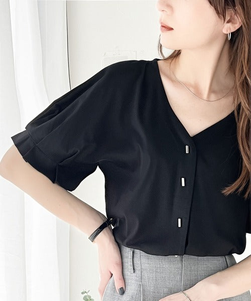 Vネックとボタンがすっきりとして上品でキレイめな印象に 。