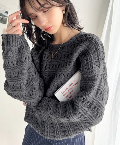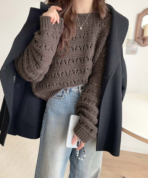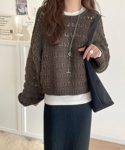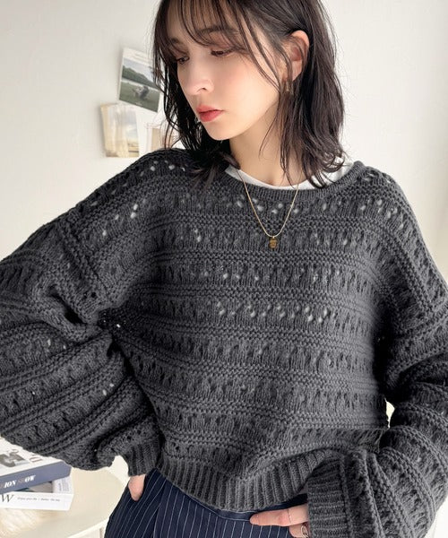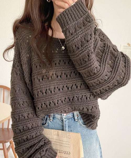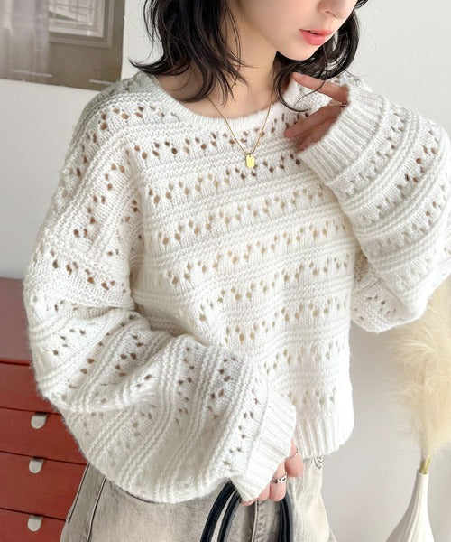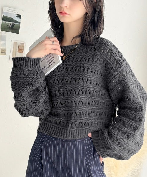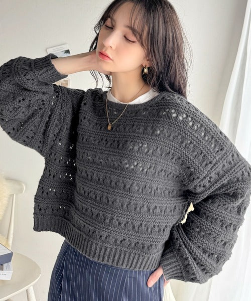 ふんわりとした可愛さを演出☆透かし編みショート丈ニット(長袖) ce1020192