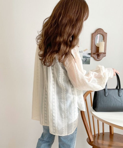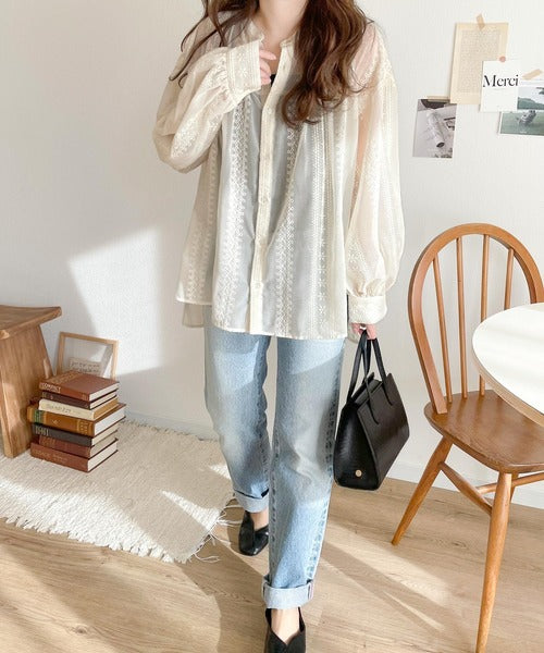 レトロな刺繍がさりげなくこなれた印象のシャツ。