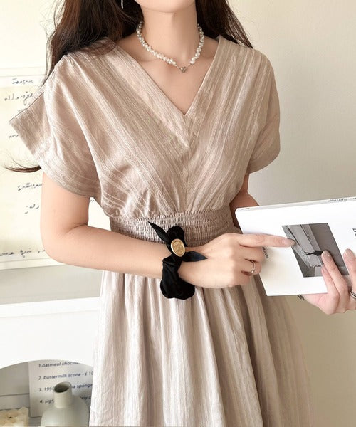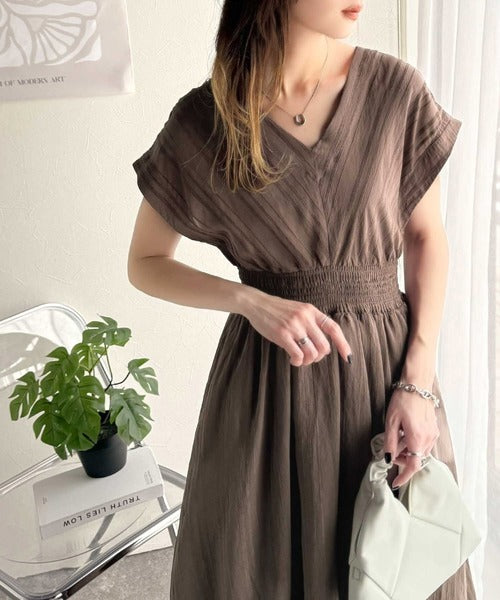 大人の抜け感エレガント。シアーストライプ素材ウエストシャーリングVネックロングワンピース ce1070133