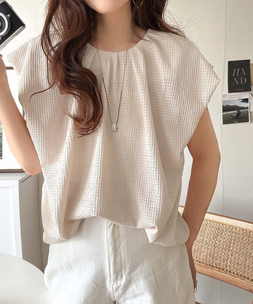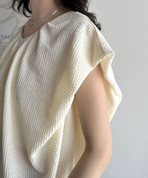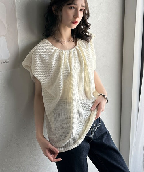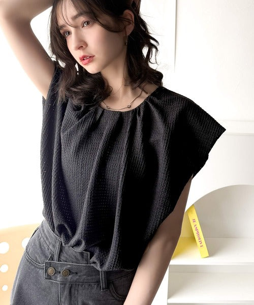 襟のタックデザインが立体感を生み出し、シンプルながらも動きが出るため、