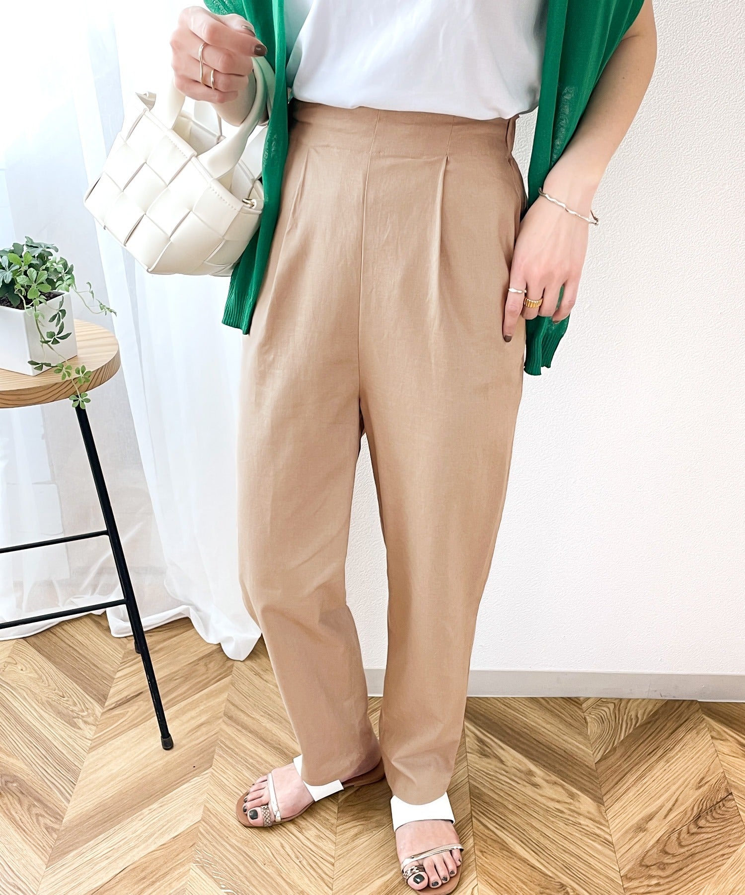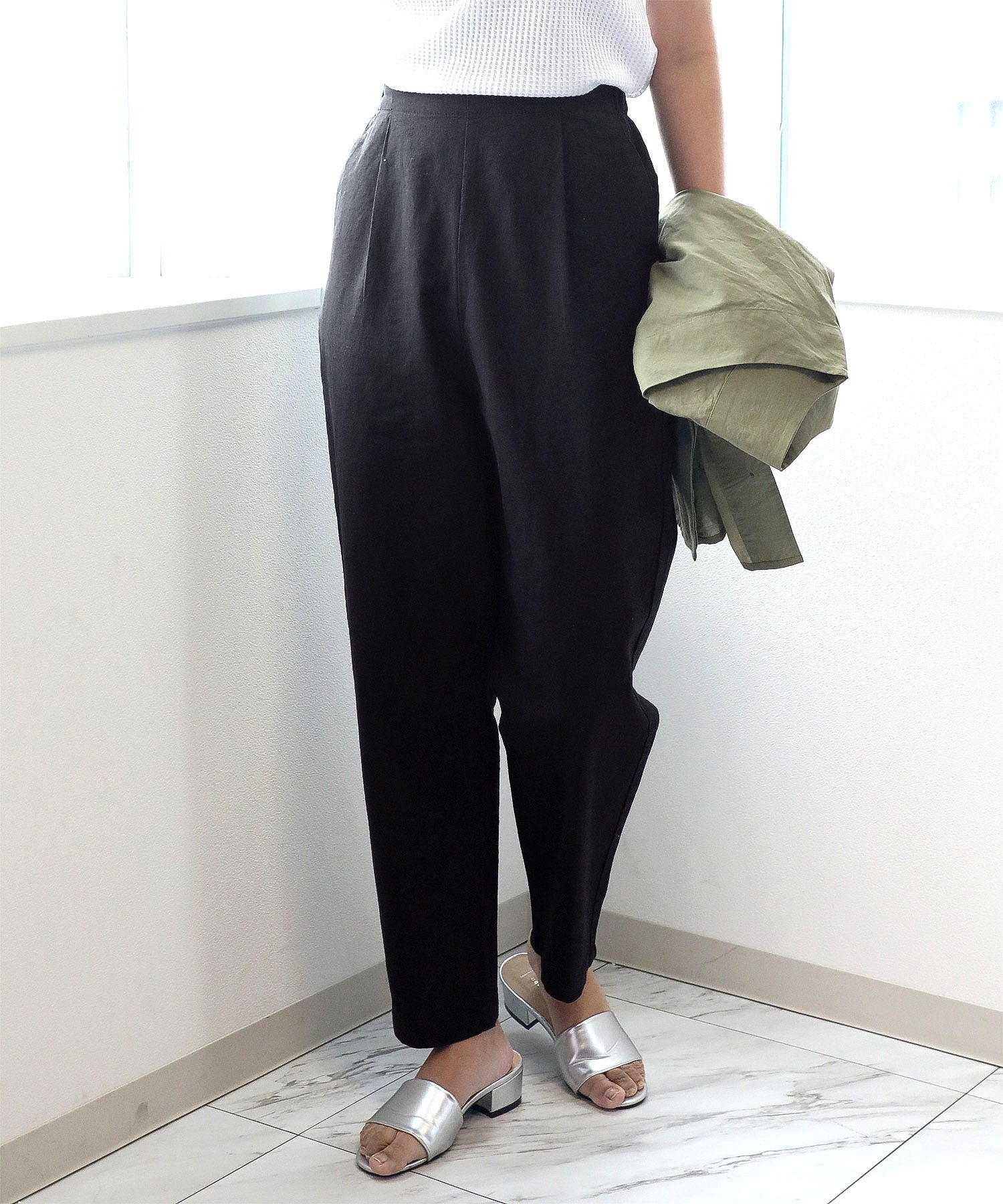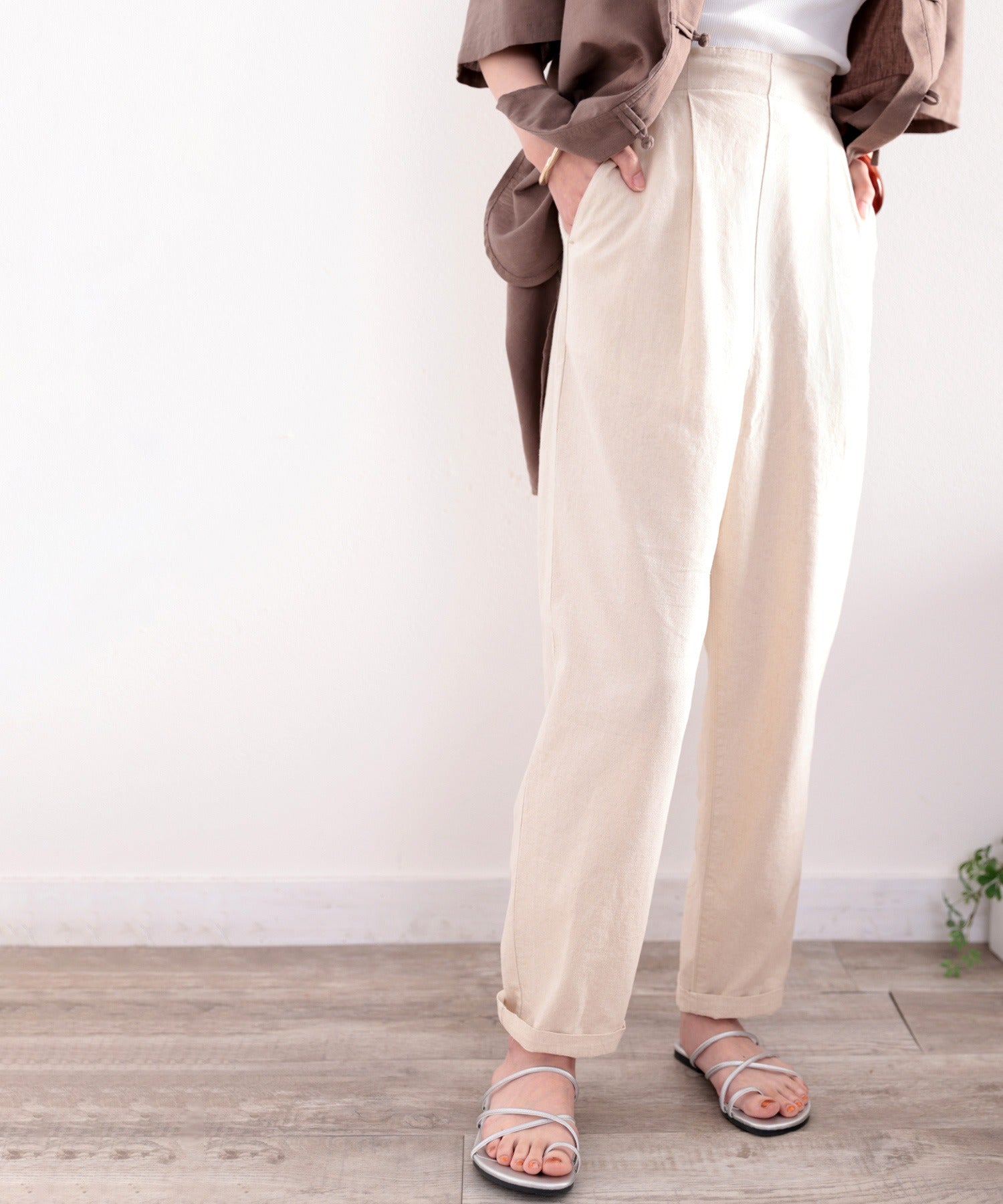 ナチュラルな風合いのリネンを使用したテーパードパンツ。