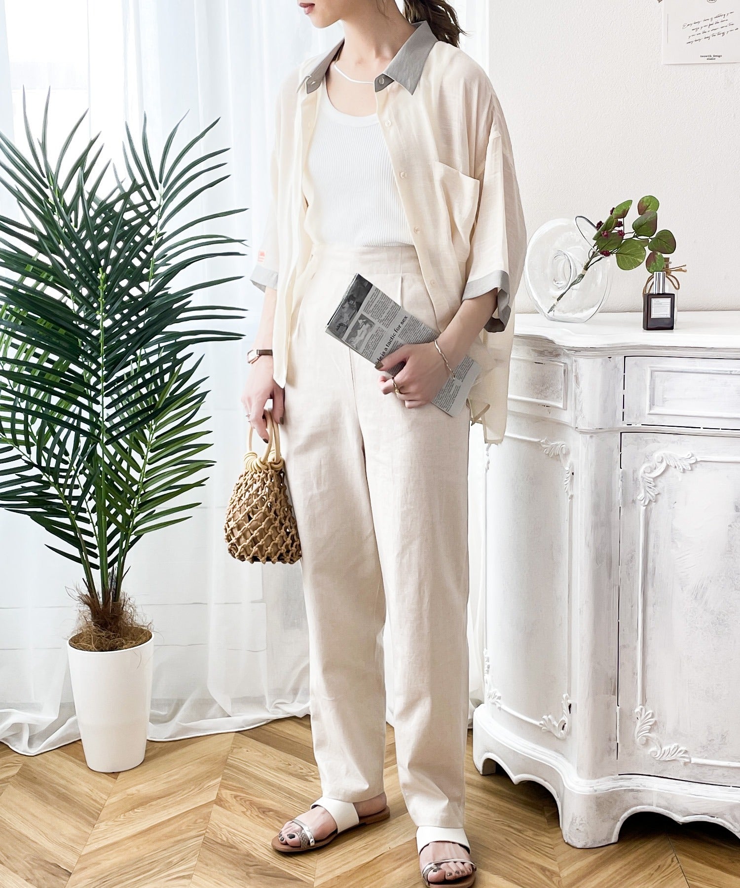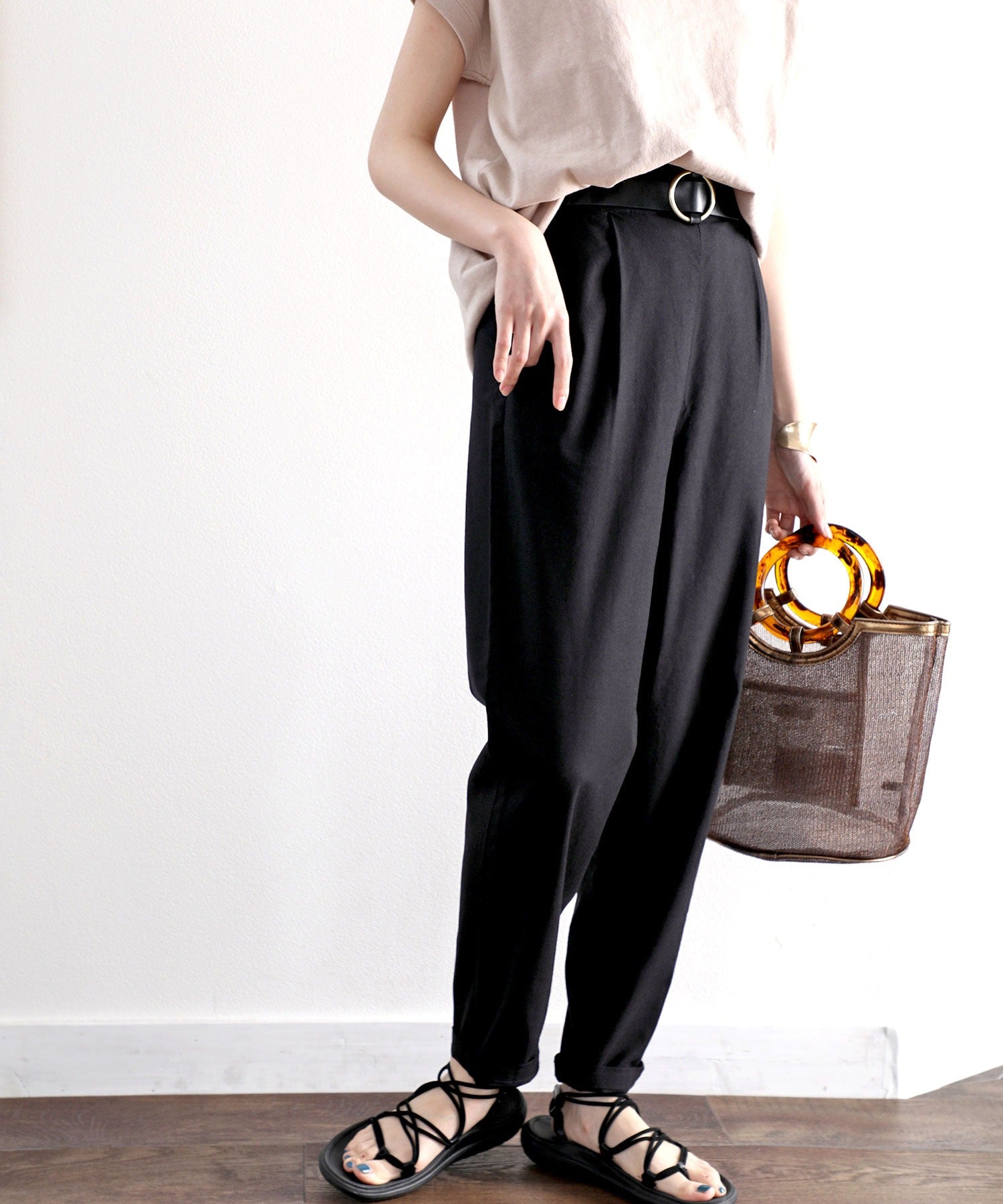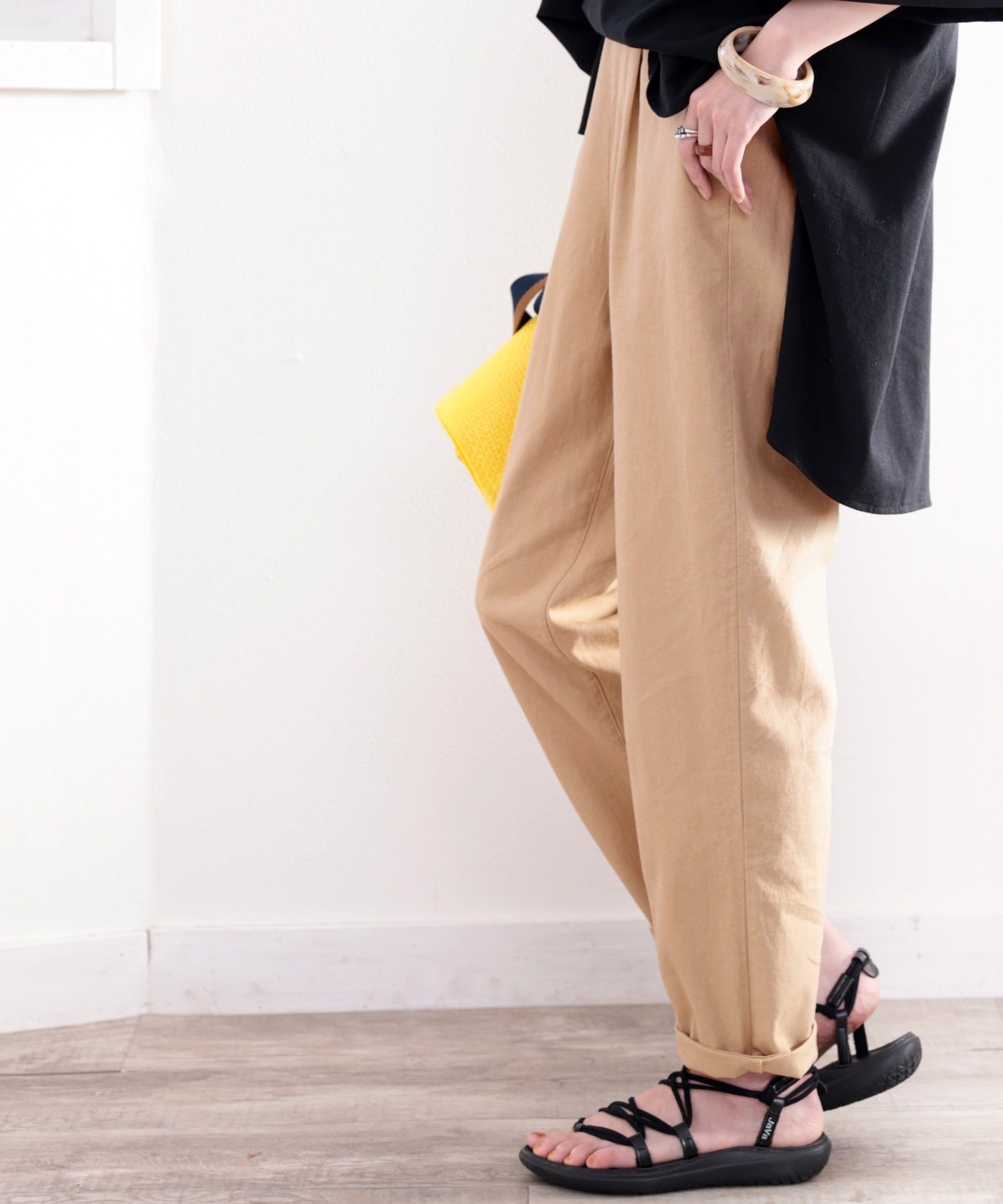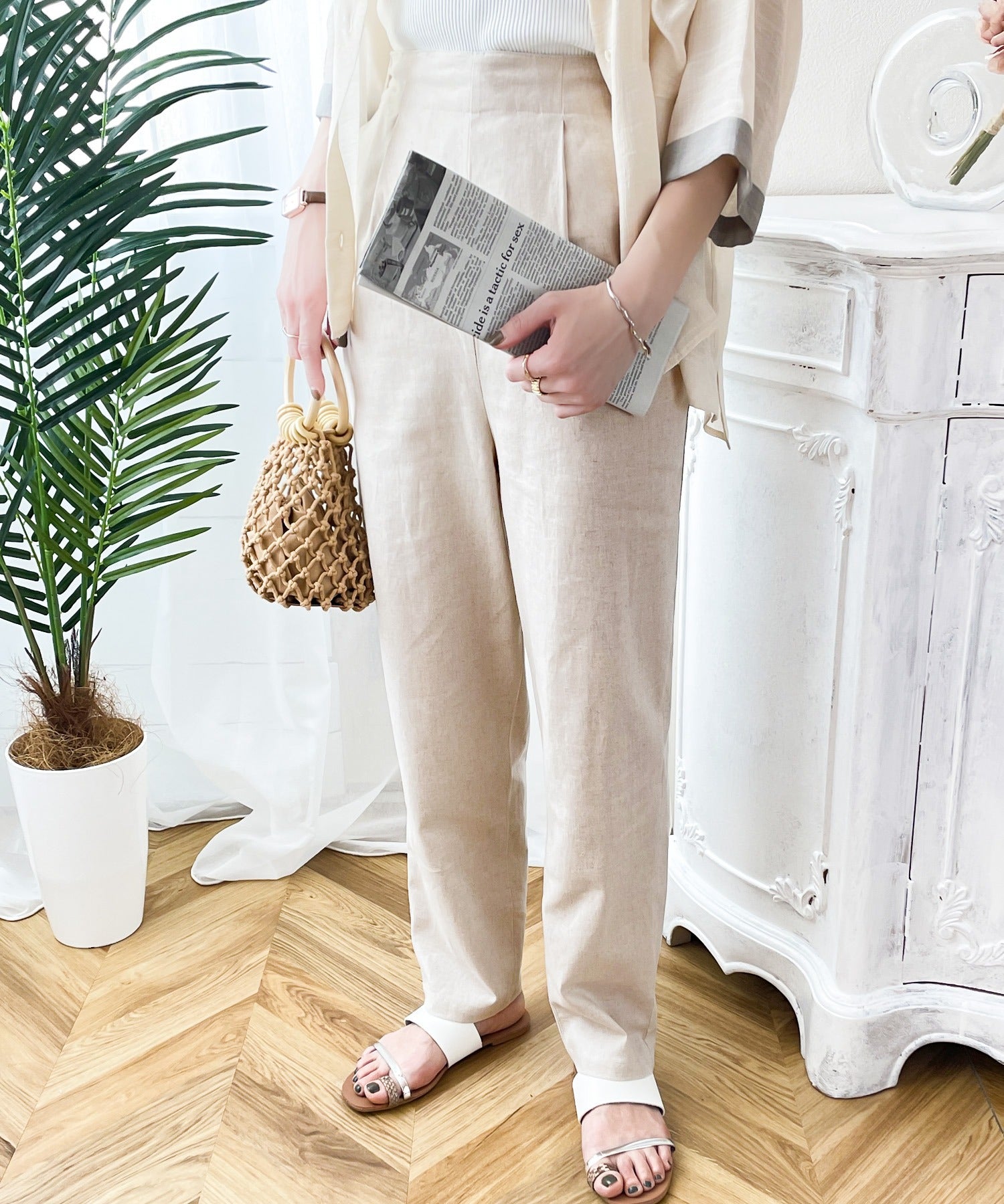 ナチュラルな風合いのリネンを使用したテーパードパンツ。
