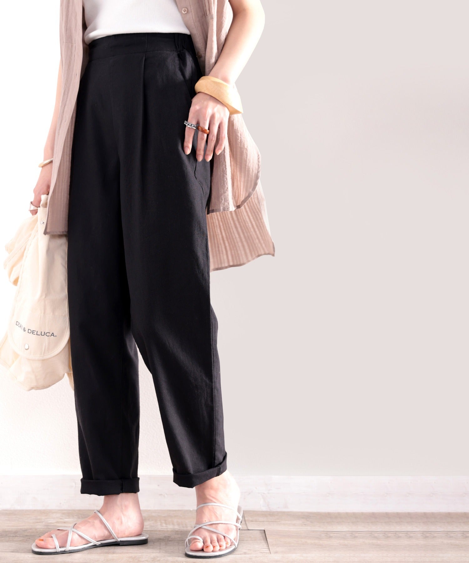 【family+】コットンリネン(綿麻)タック入りハイウエストテーパードパンツ(フルレングス) cl10041