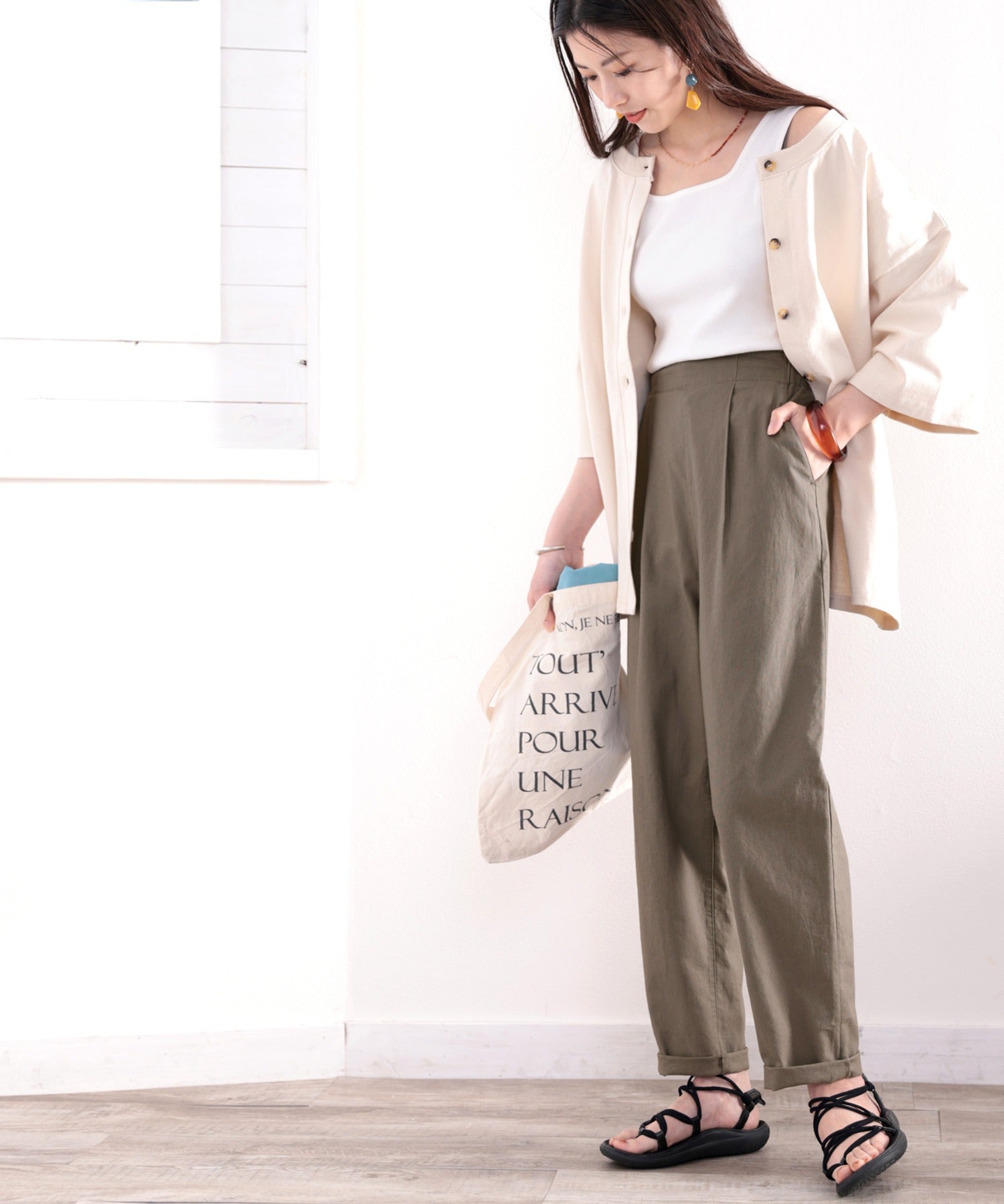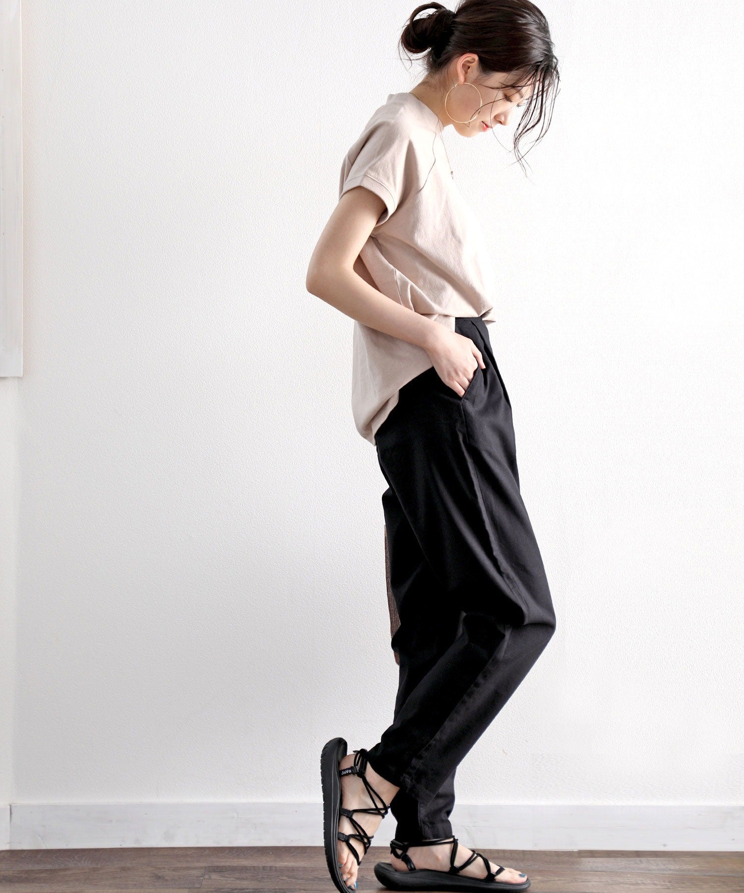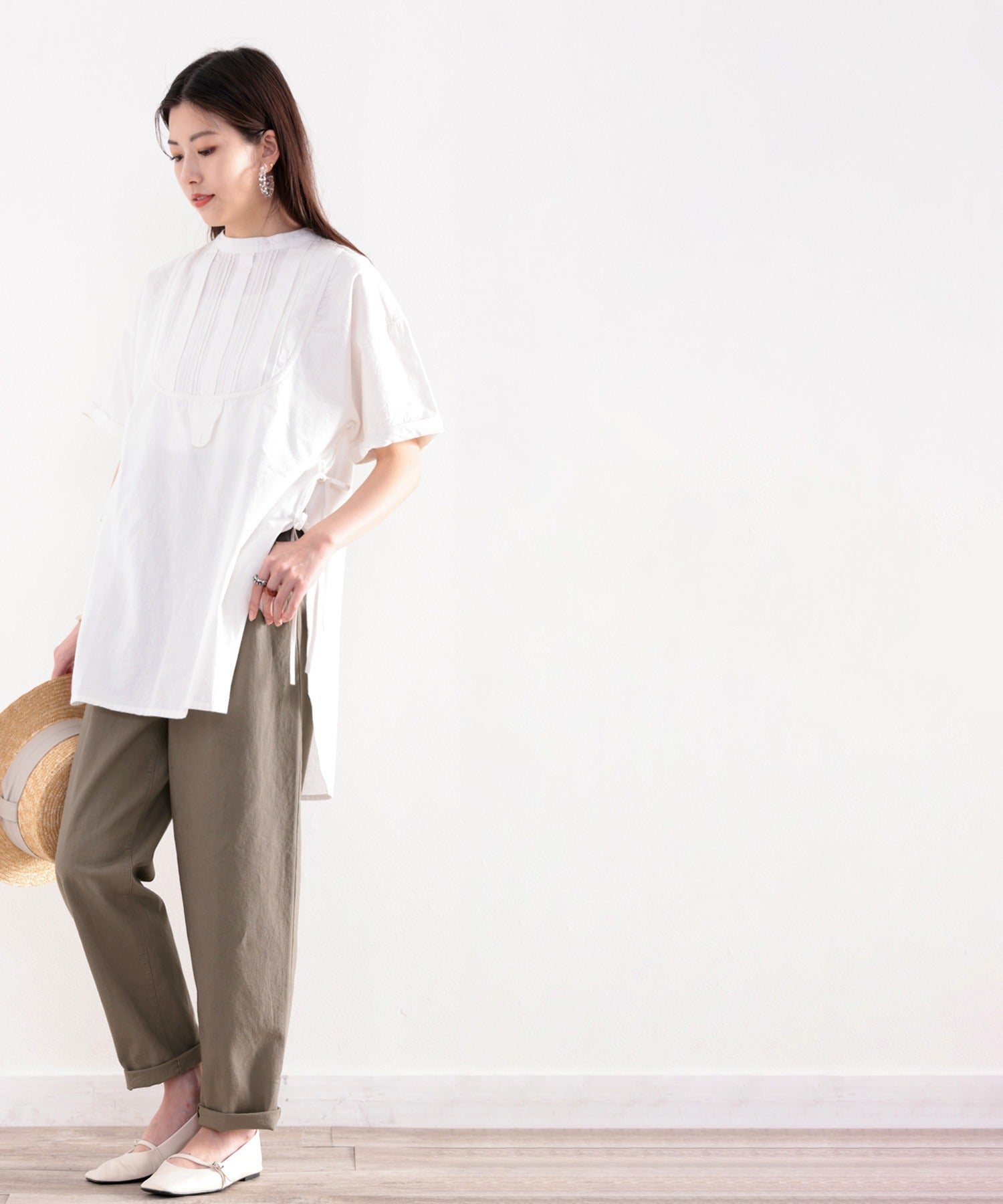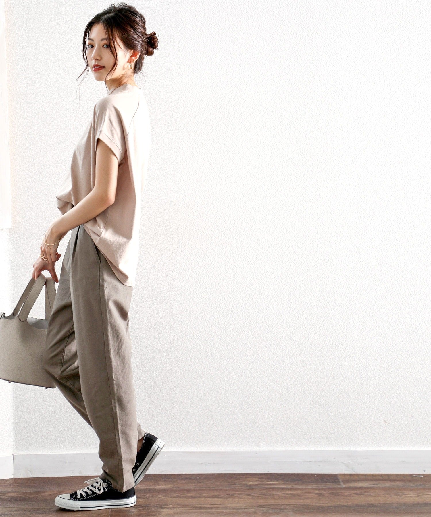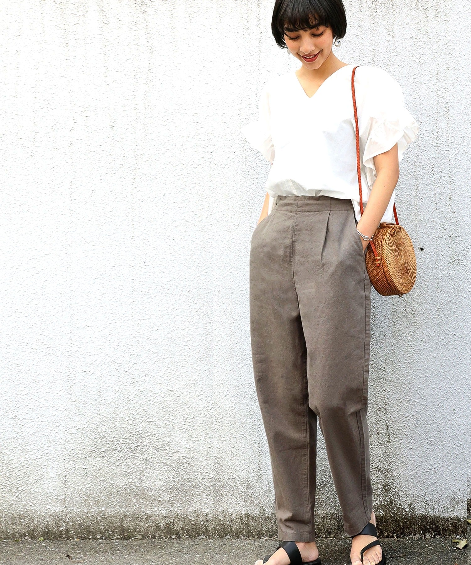 ややゆるっとしたルーズなワイドストレート風のテーパードはオフィスOKなきちんと感が魅力。