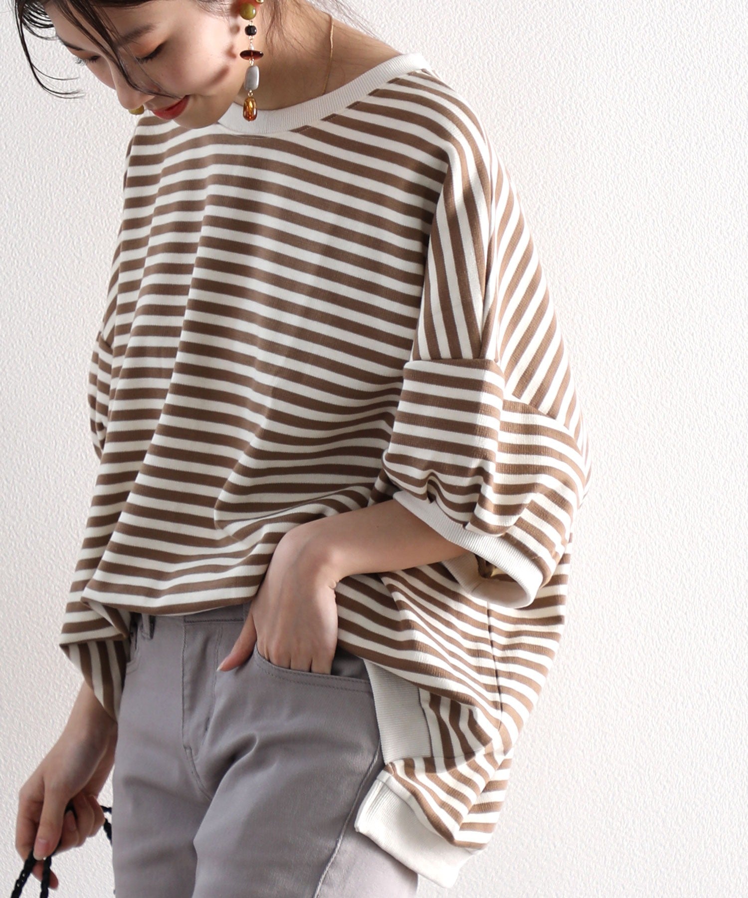 ビッグボーダー柄ミドル丈クルーネックカットソー(半袖) cl10047
