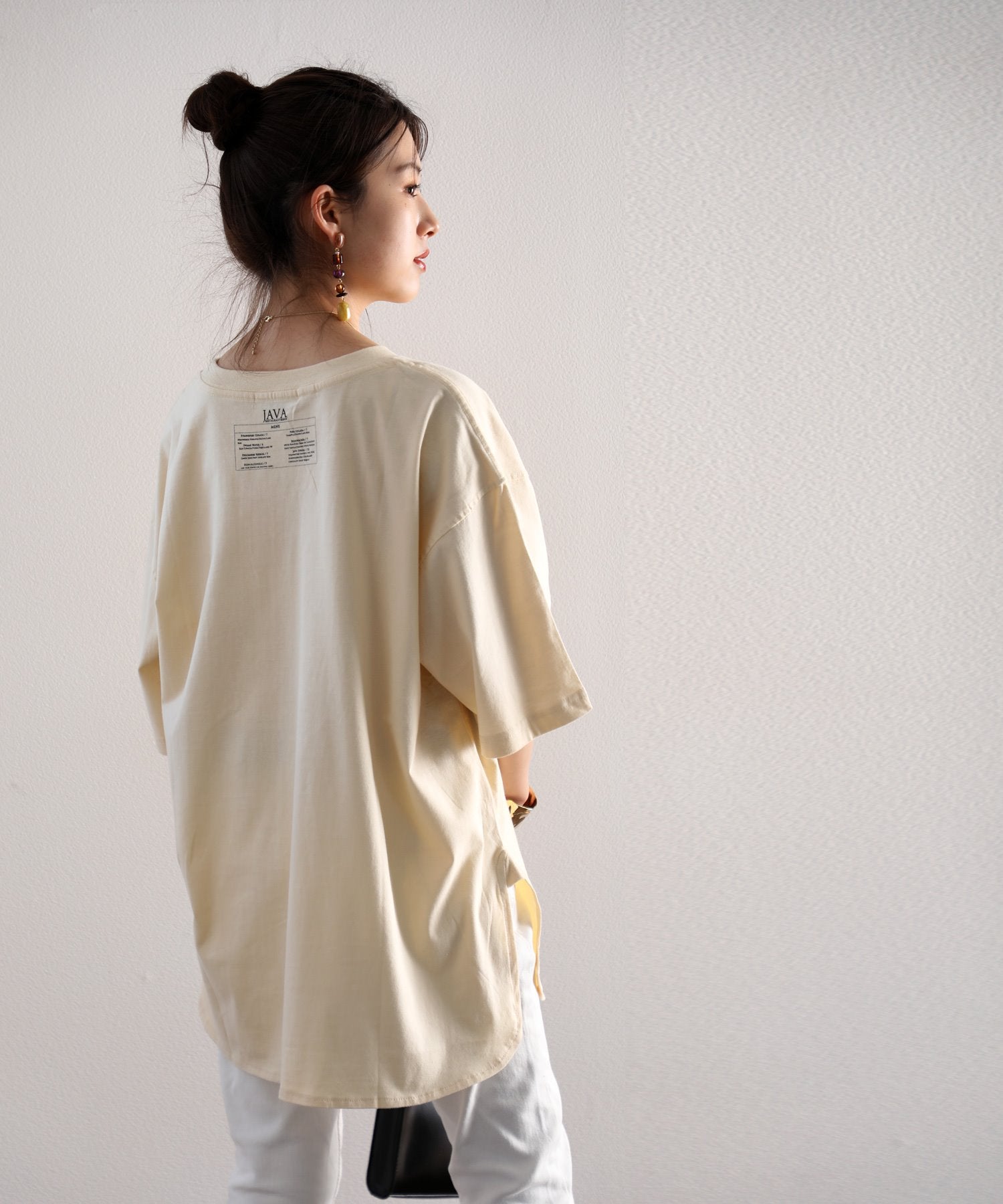 《Javaジャバ》シンプルロゴバックプリント ロング丈無地クルーネックサイドスリット入りビッグTシャツ(半端袖) cl3015