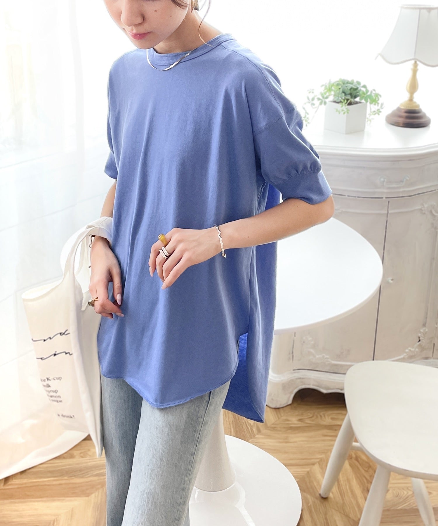 ラウンドシルエットと長めの後ろ丈が腰回り、お尻回りをさりげなく
