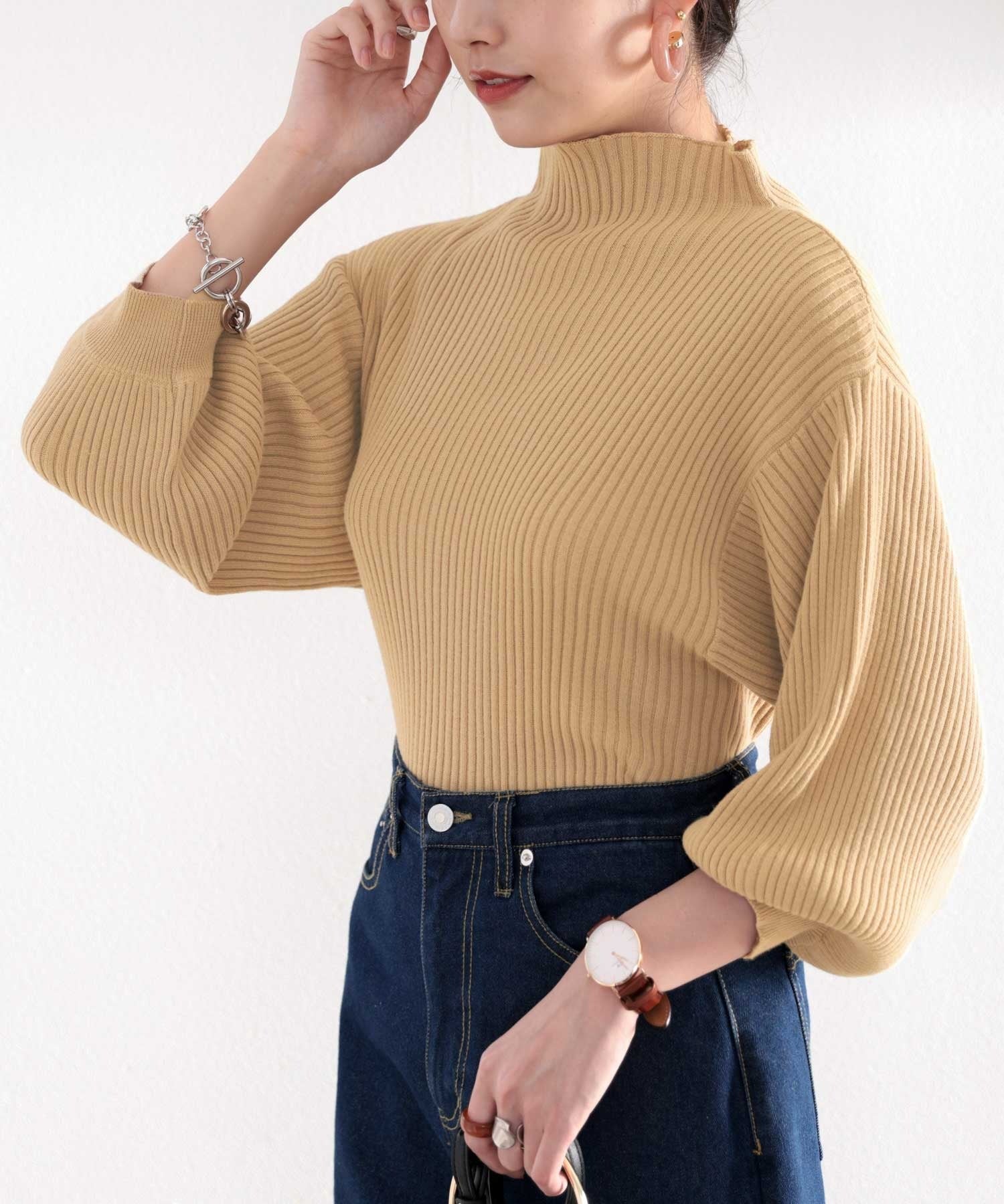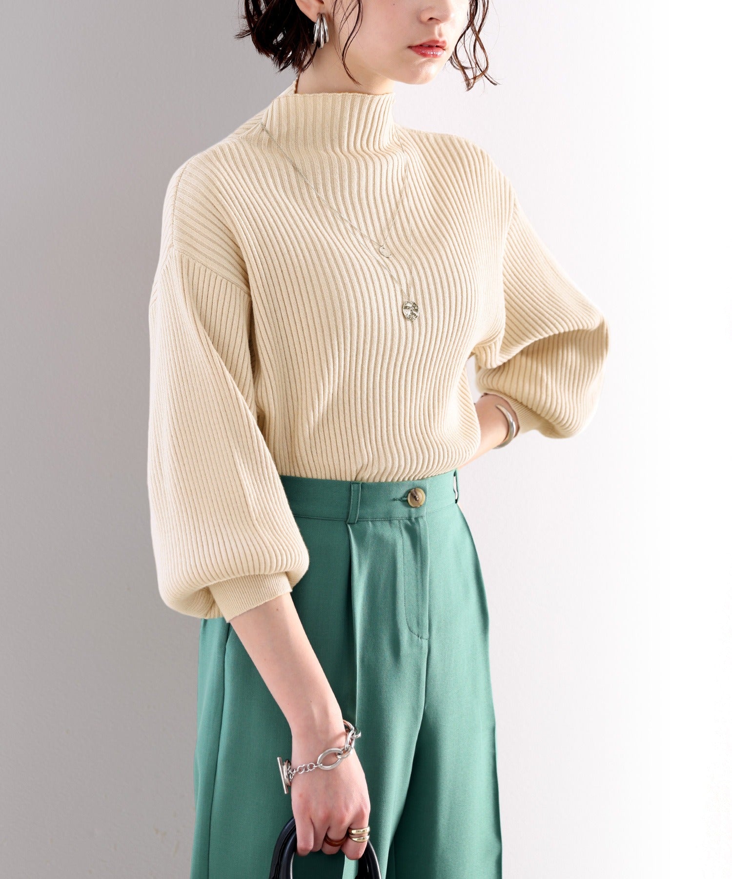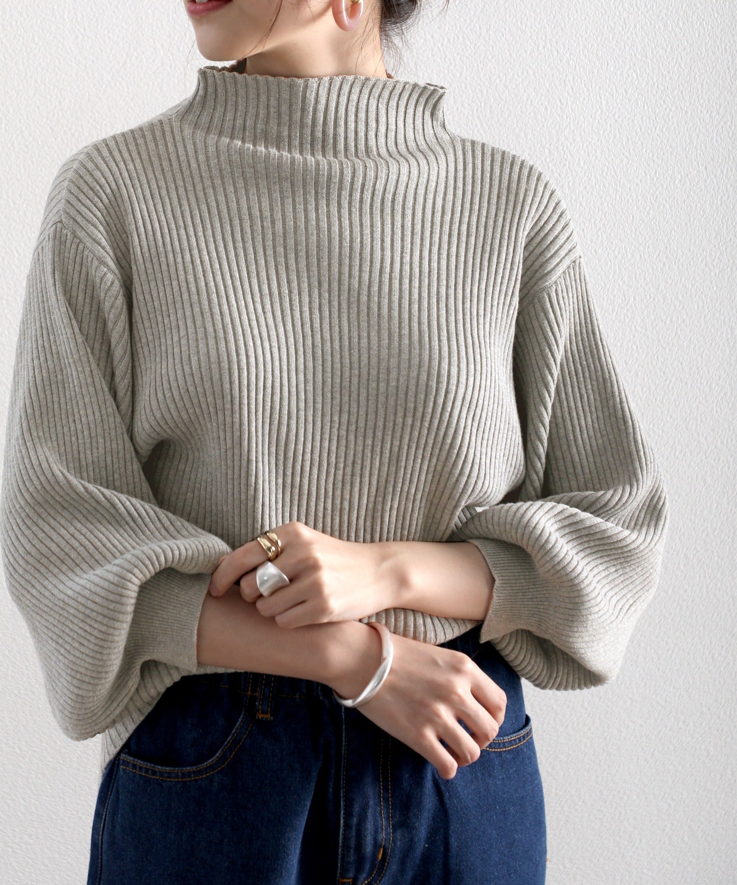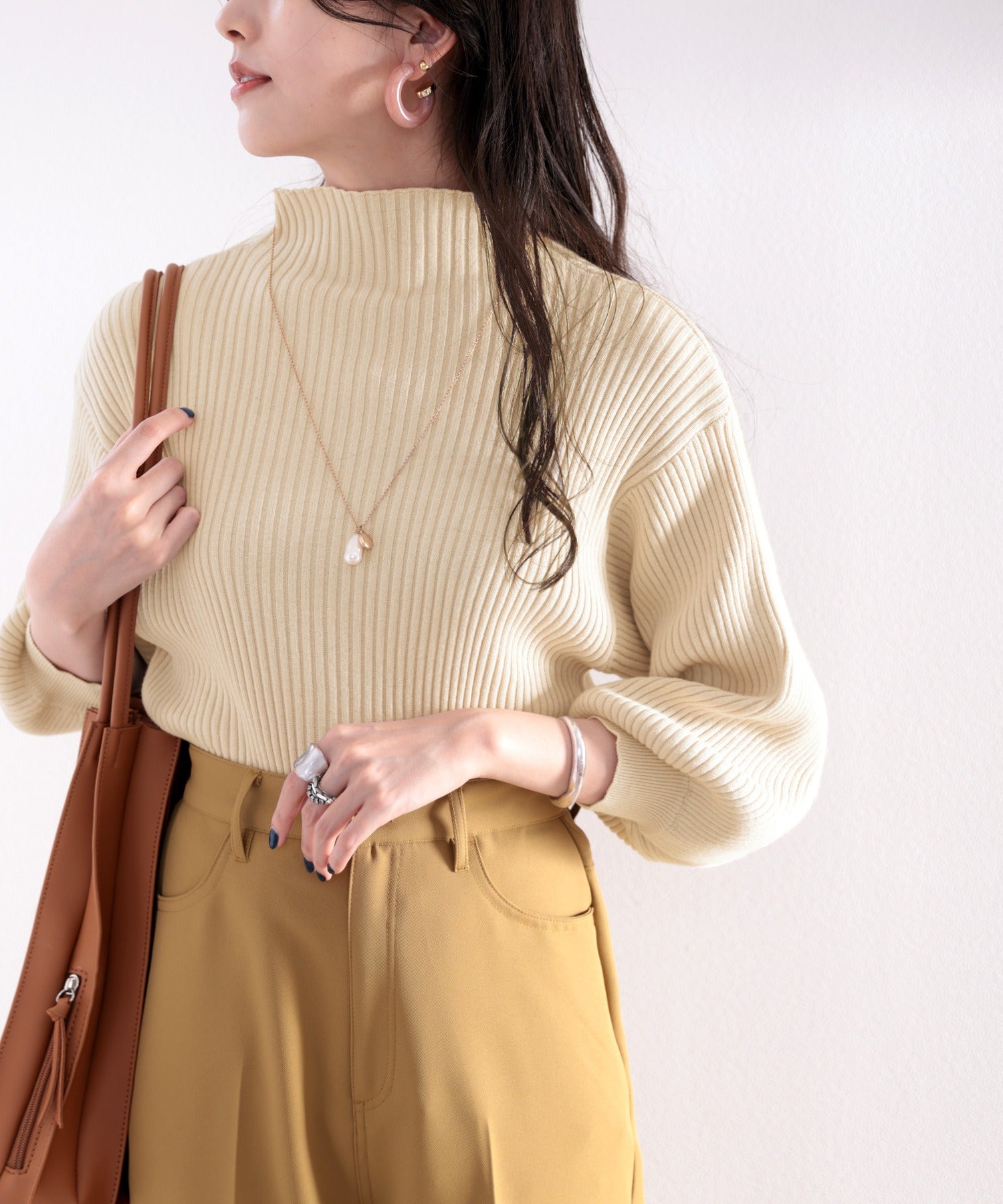 【family+】柔らか綿100%。袖ぽわん、ボトルネックリブニット cl7004
