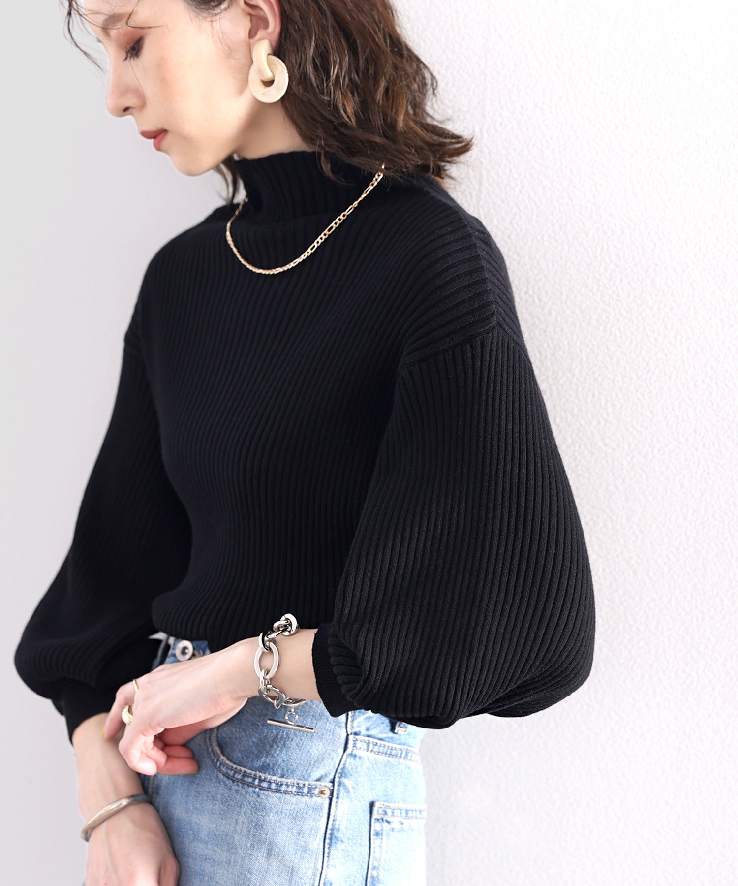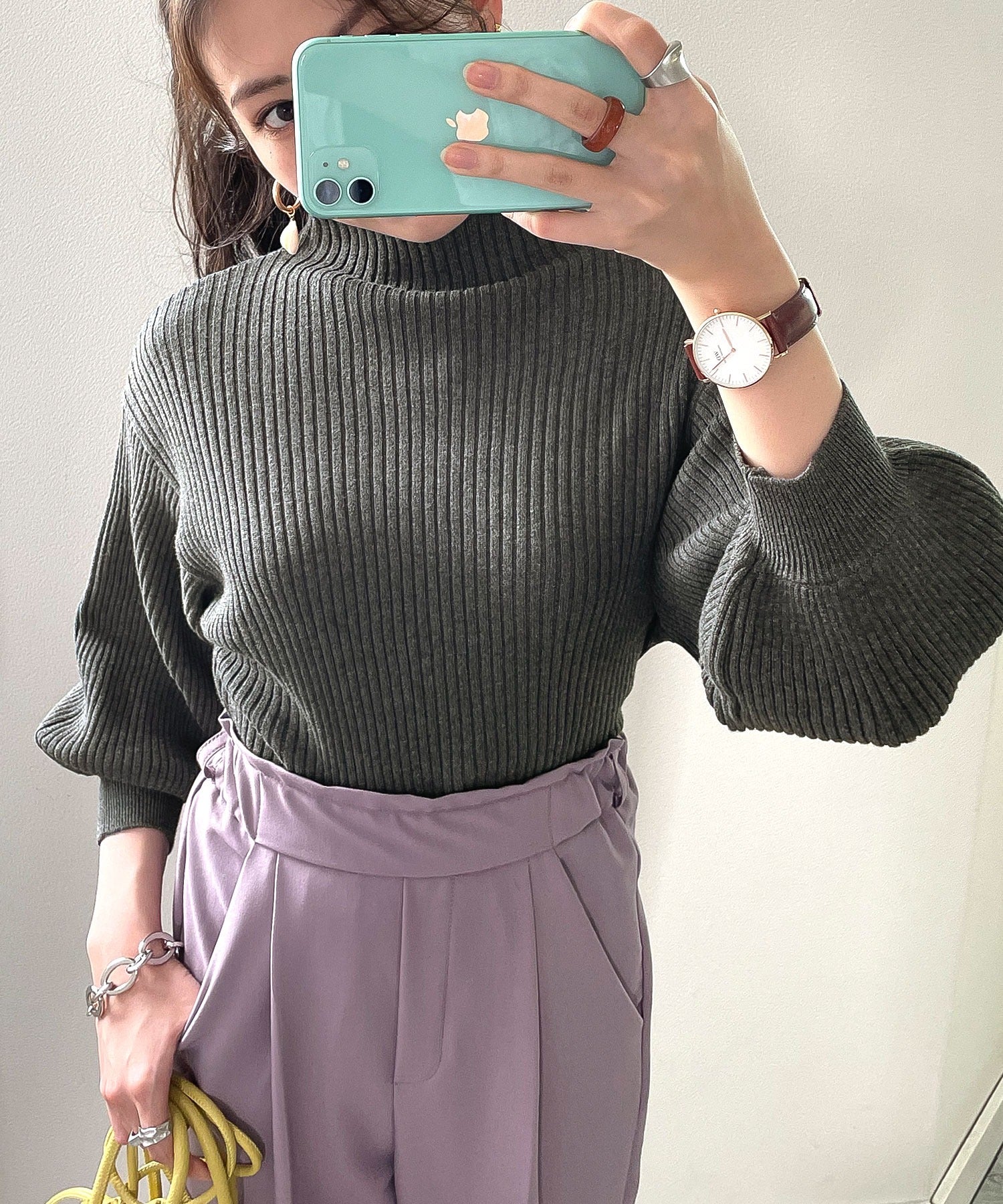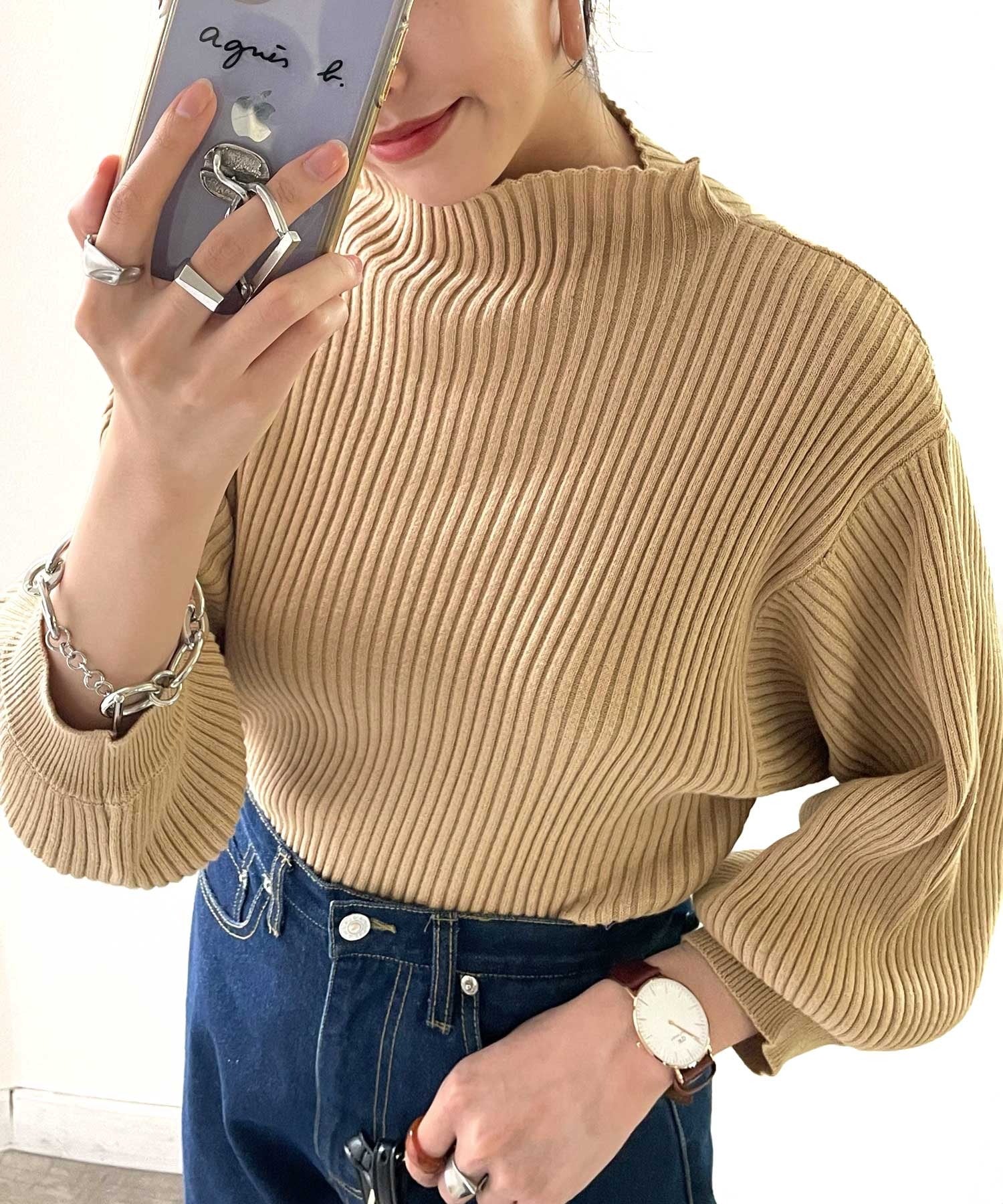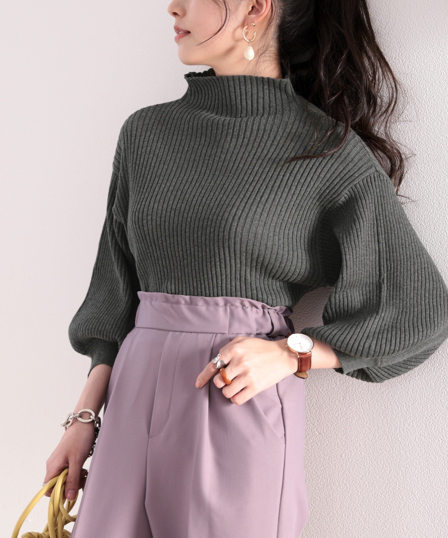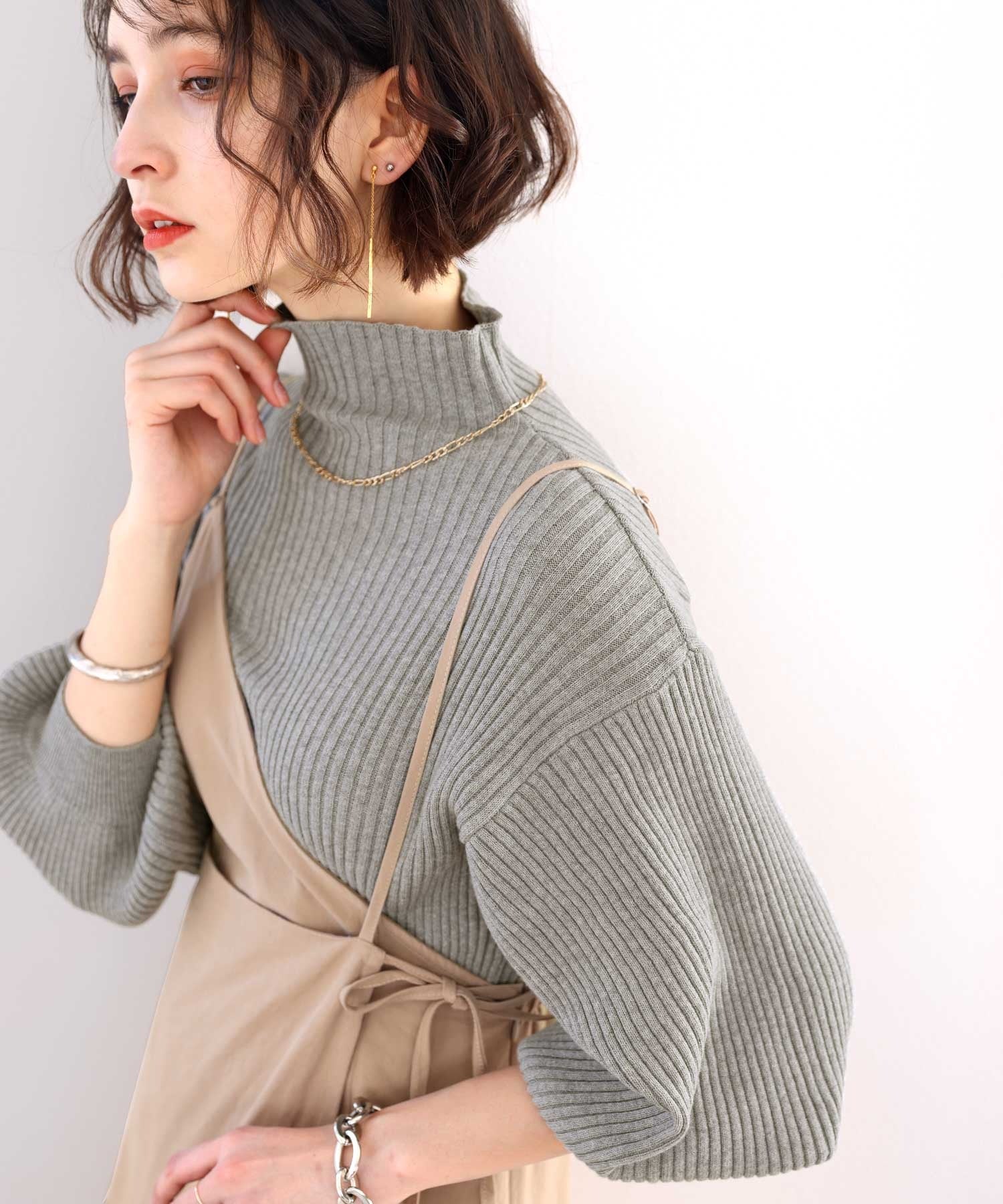 【family+】柔らか綿100%。袖ぽわん、ボトルネックリブニット cl7004