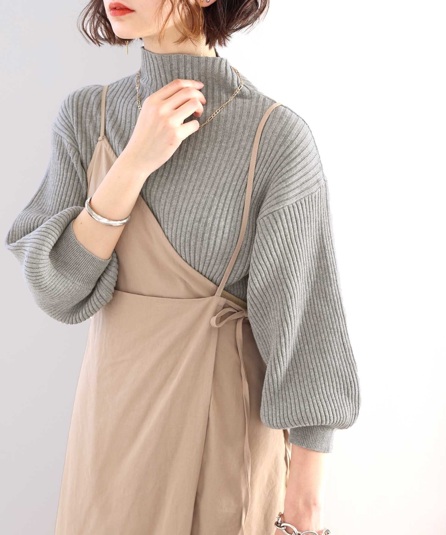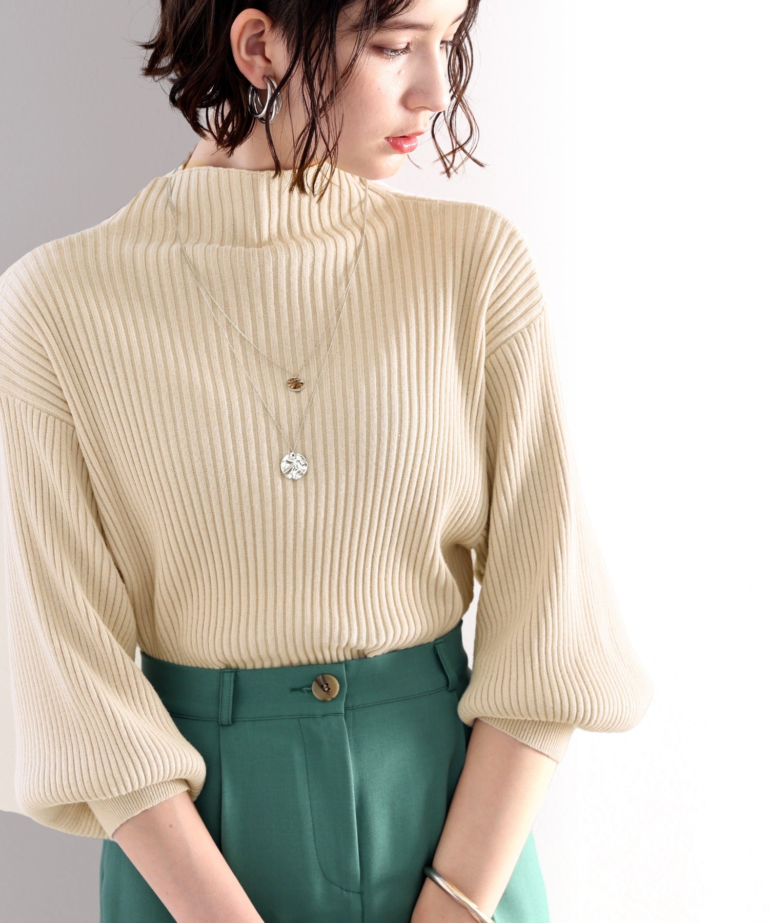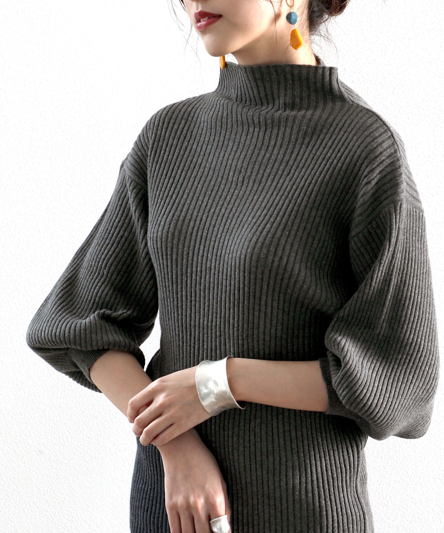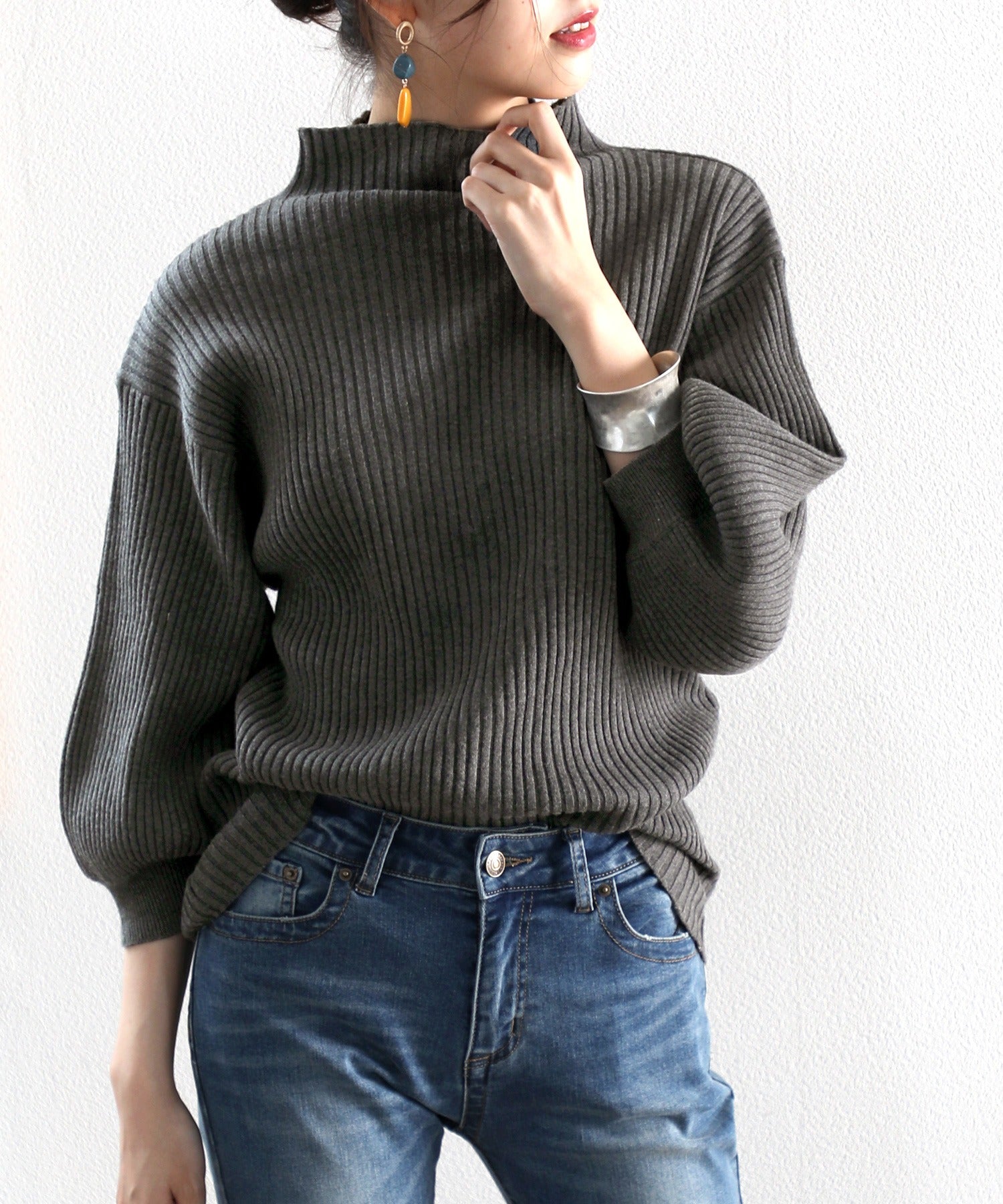 【family+】柔らか綿100%。袖ぽわん、ボトルネックリブニット cl7004