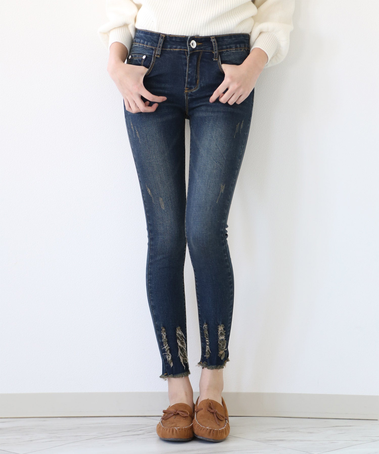 裾フリンジの美脚フレイドローライズスキニーデニム&チノパンツ(フルレングス) cla053