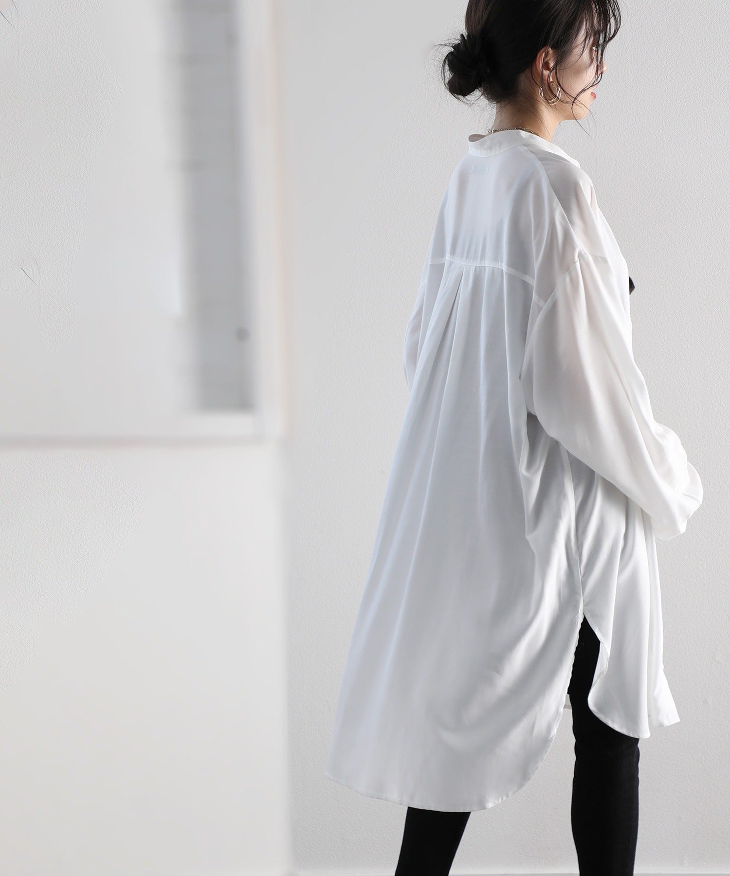 ★ロング丈バルーンスリーブ無地バンドカラーシャツワンピース(長袖)★