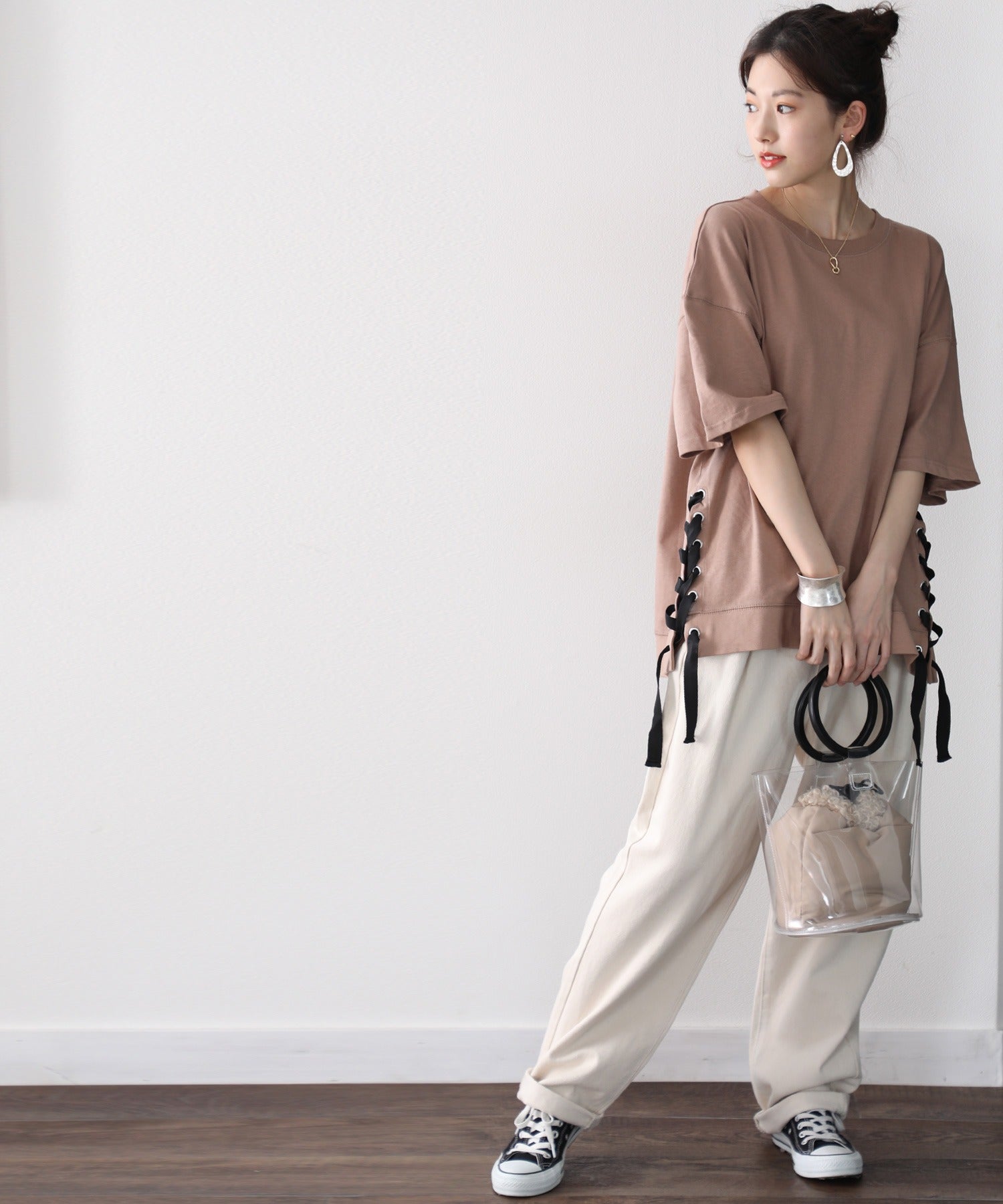 ★サイドレースアップTシャツ★ サイドのレースアップが印象的な ビッグシルエットTシャツ。 ブラックリボンでキュートさアップ? 女子っぽさをアップする ゆるっとシルエットが絶妙です。 リボンをゆるっと垂らして着れば シルエットに動きが出て シンプルコーデもワンランクアップ 一枚でゆるっとラクチン可愛い ビッグカットソーです。