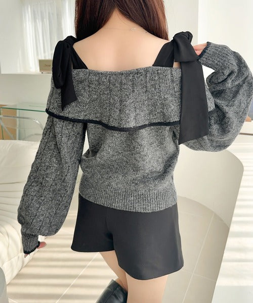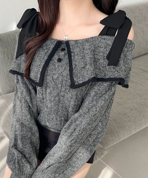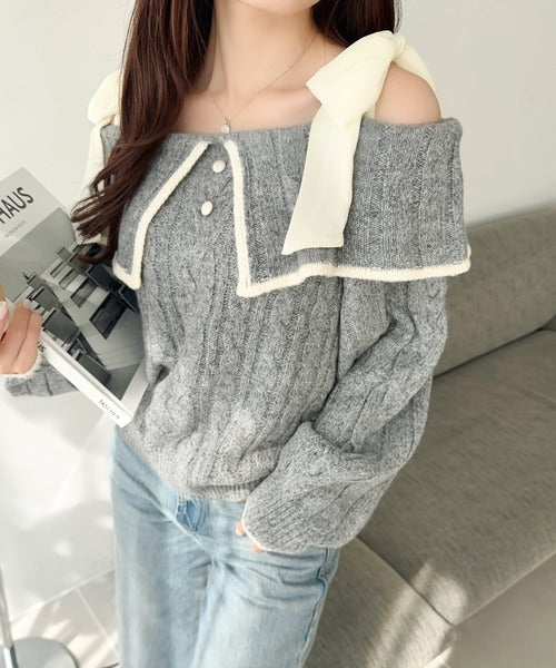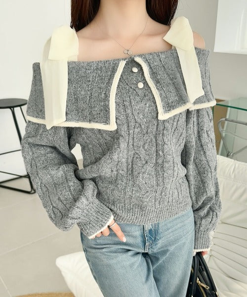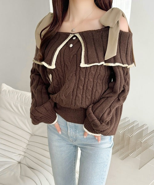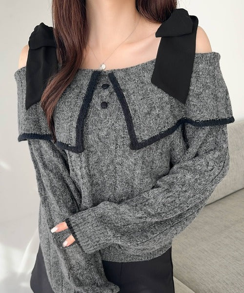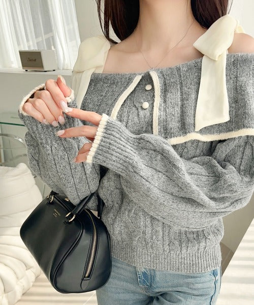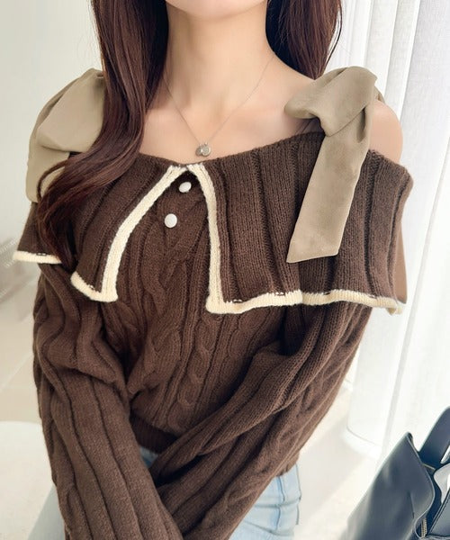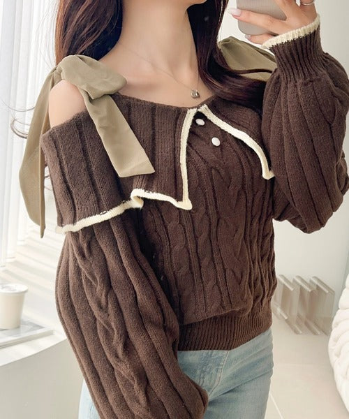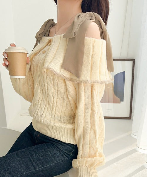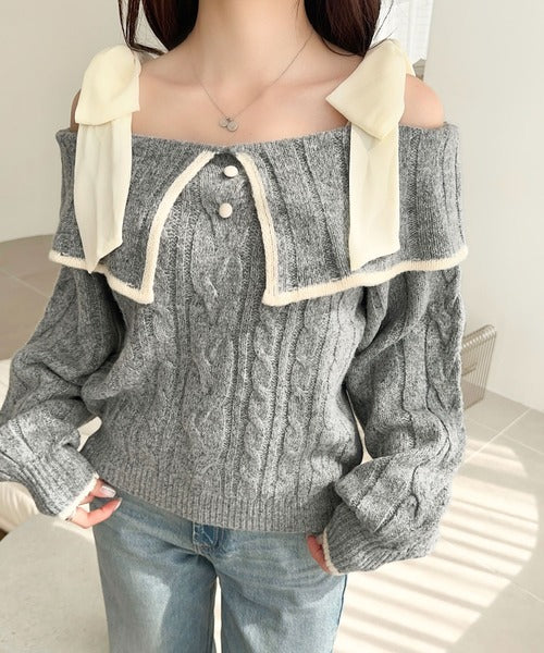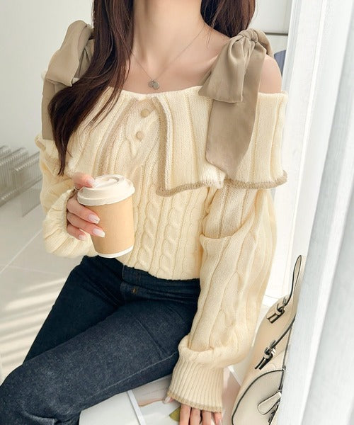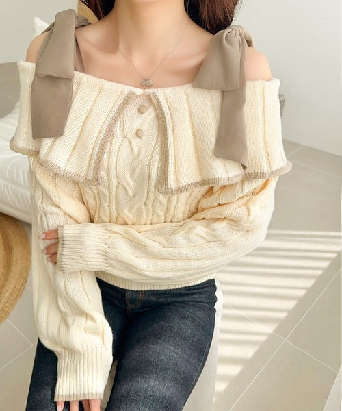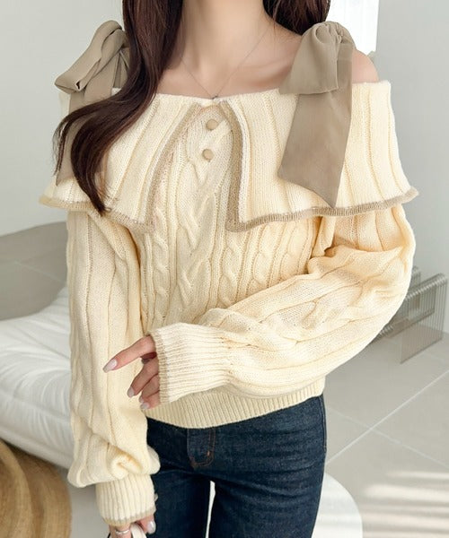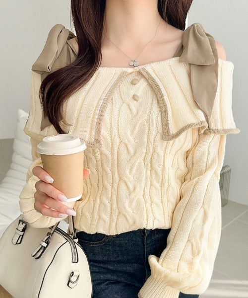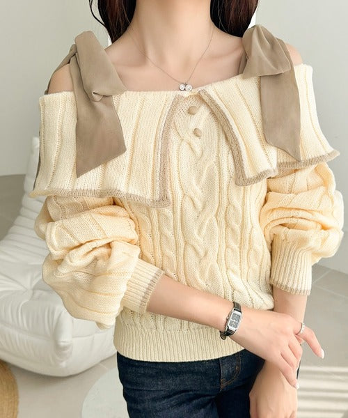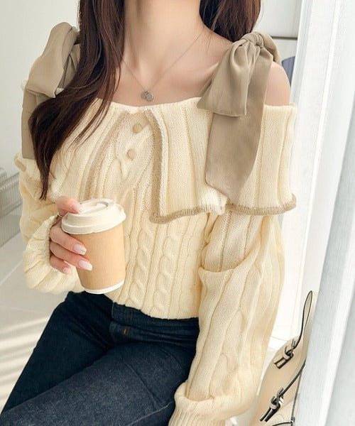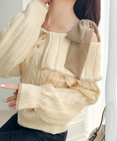 大きめリボンがアクセントのケーブルニットは、オフショルデザインで女性らしさを引き立てます。