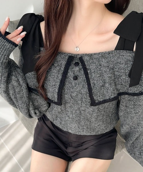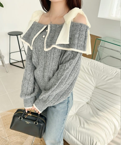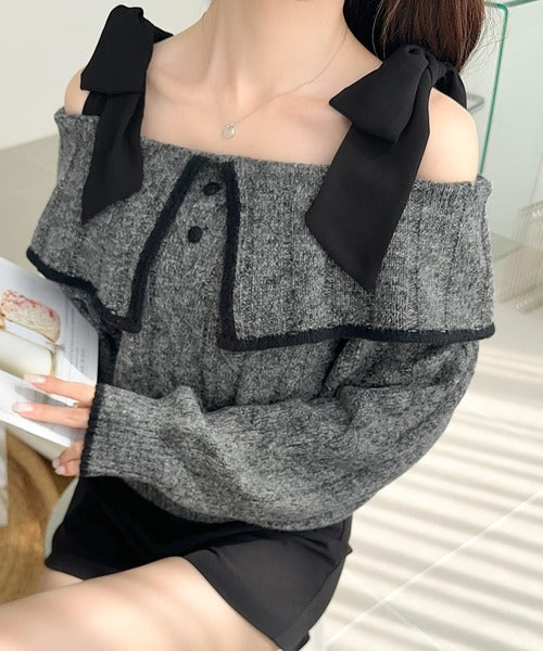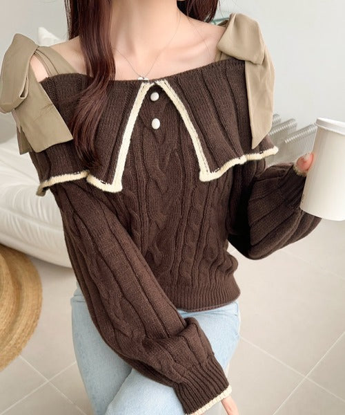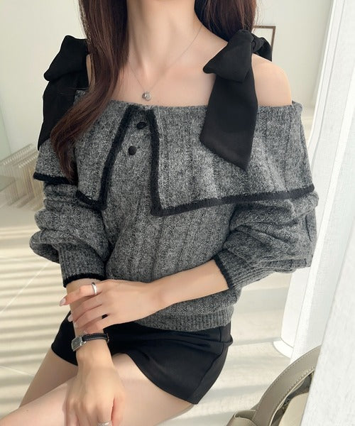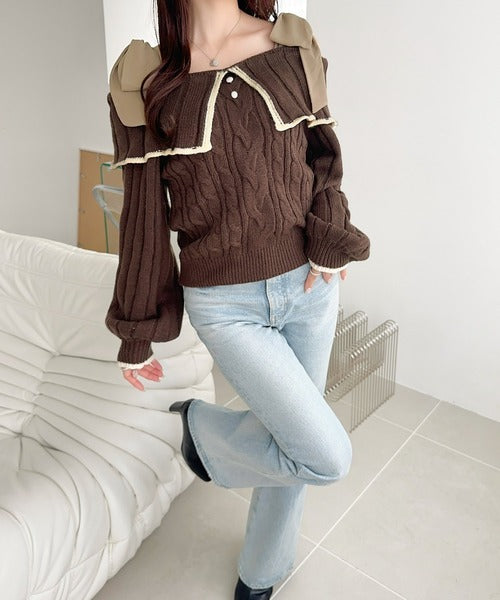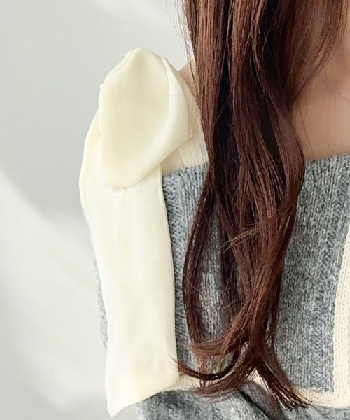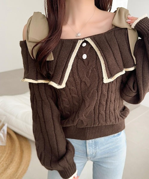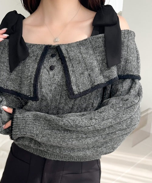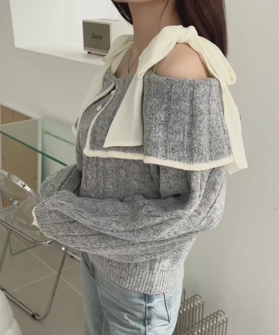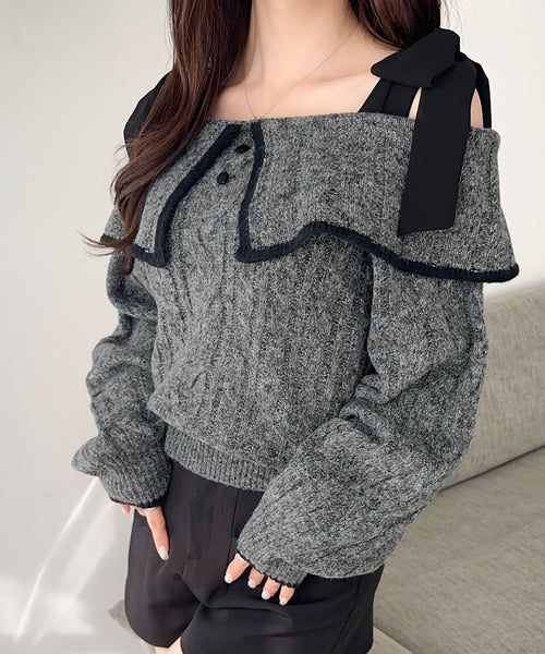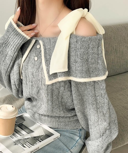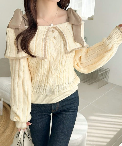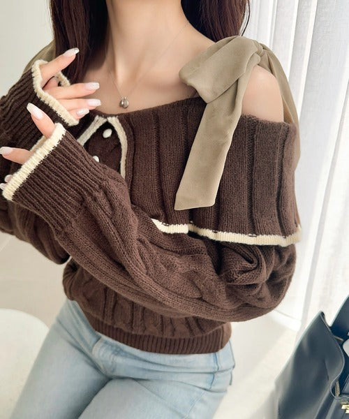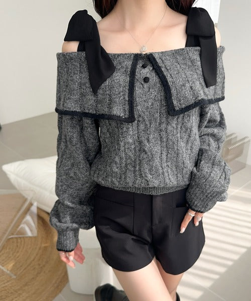 大きめリボンがアクセントのケーブルニットは、オフショルデザインで女性らしさを引き立てます。