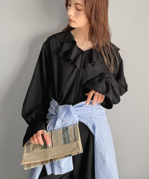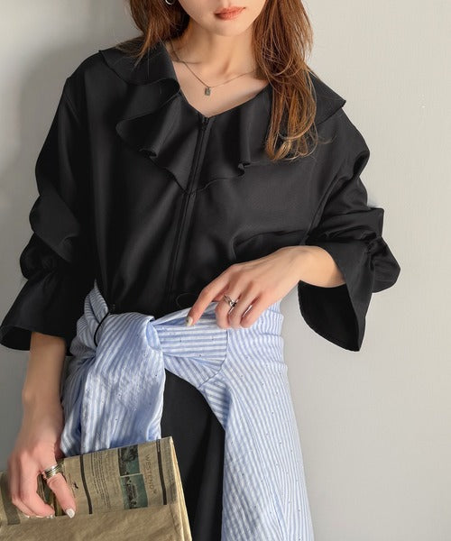 Vネックデザインが首元をすっきり見せ、フリルデザインが華やかさと小顔効果も◎