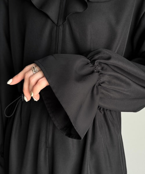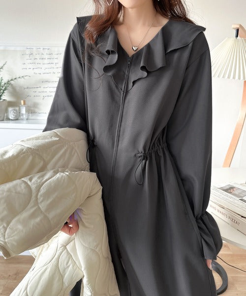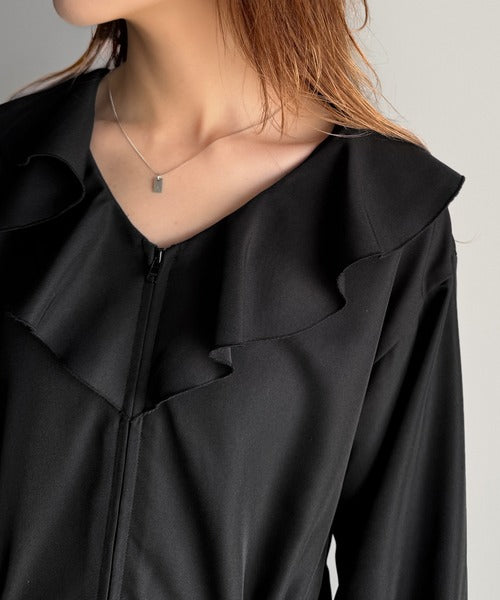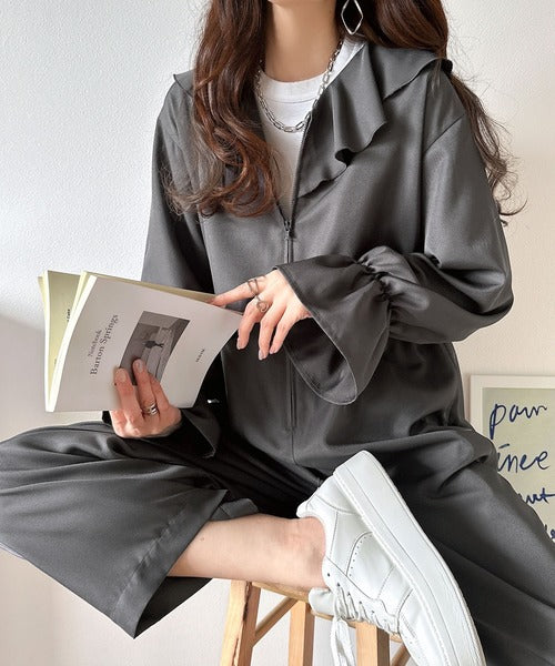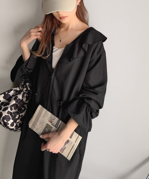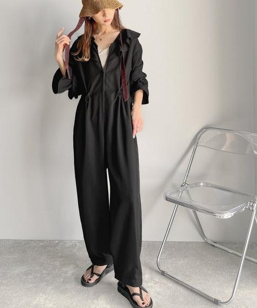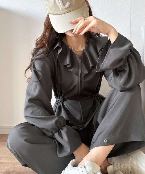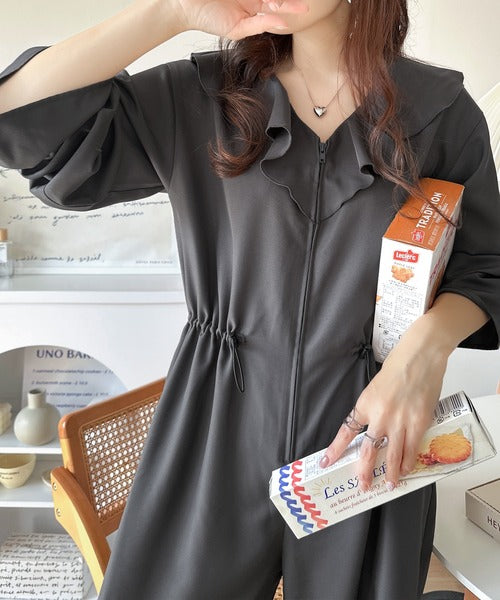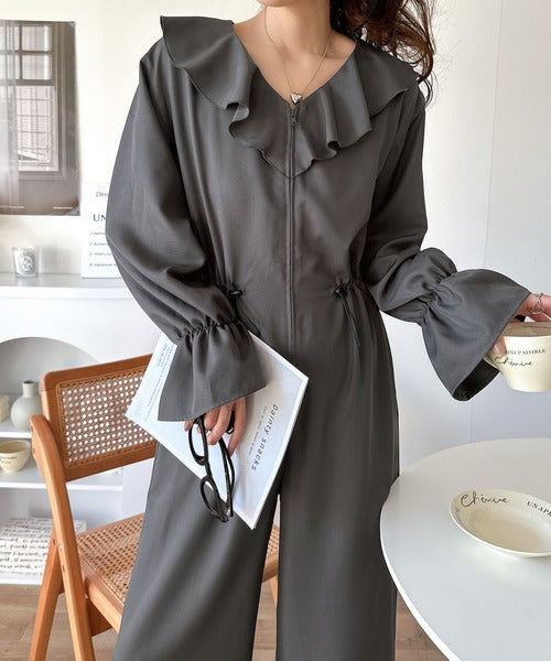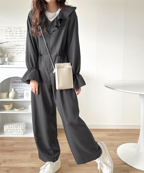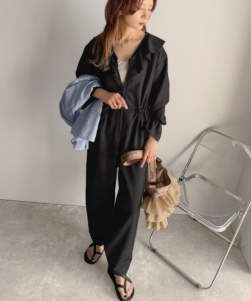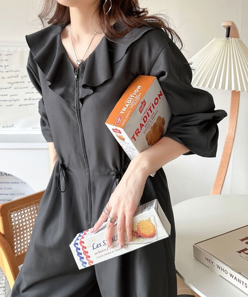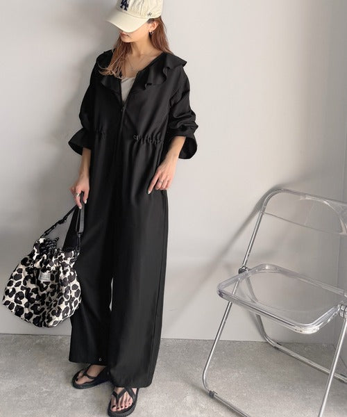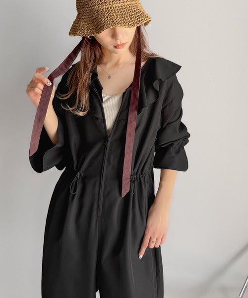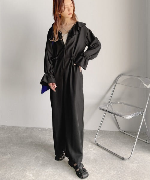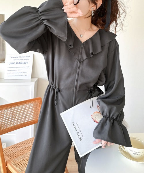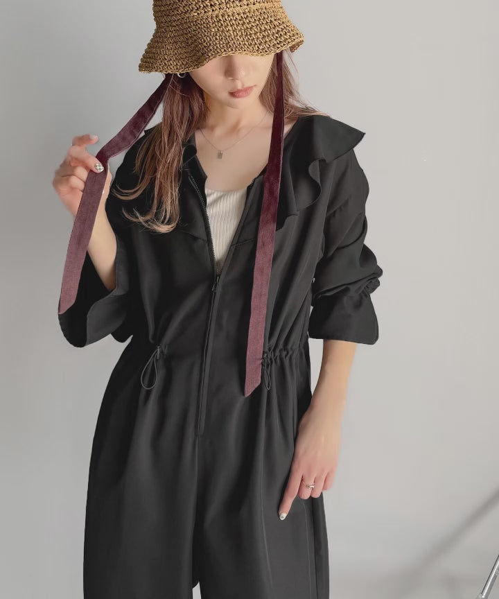 大人のこなれたリラクシー。裾2wayフリルフロントファスナードロストオールインワン(長袖) ce1025001