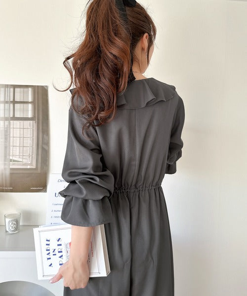 フリル衿がポイントの一枚で着ても存在感のあるオールインワンですが、