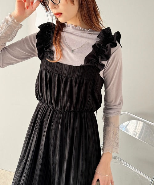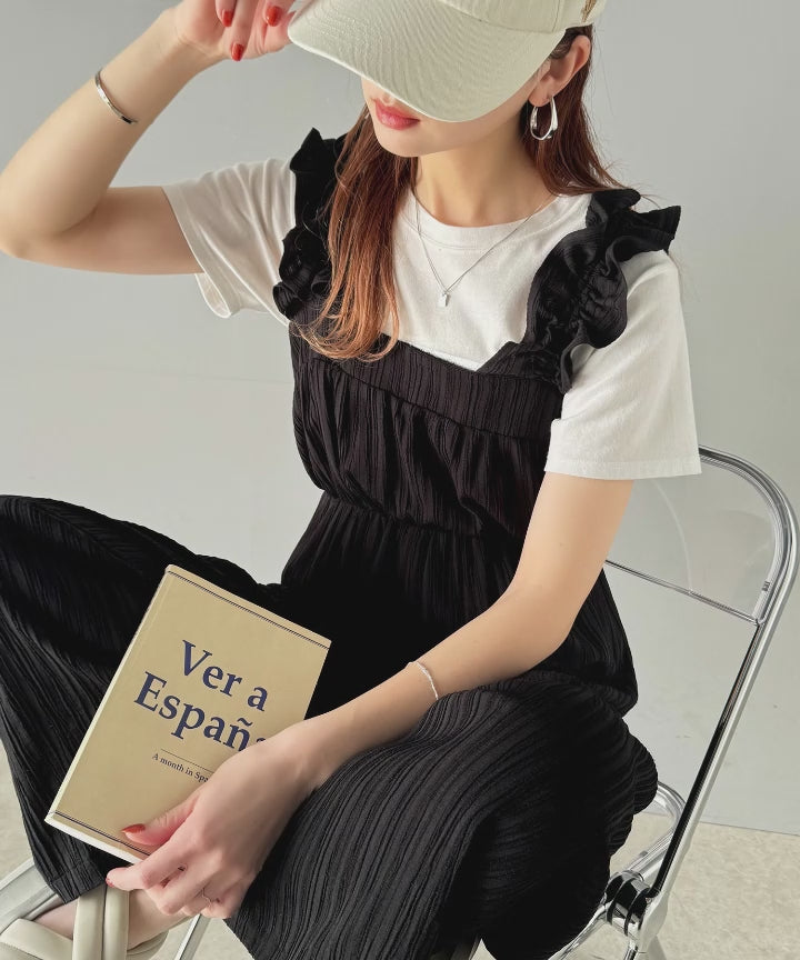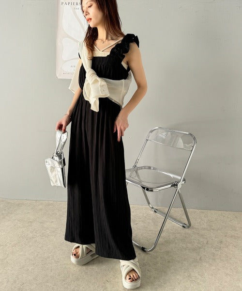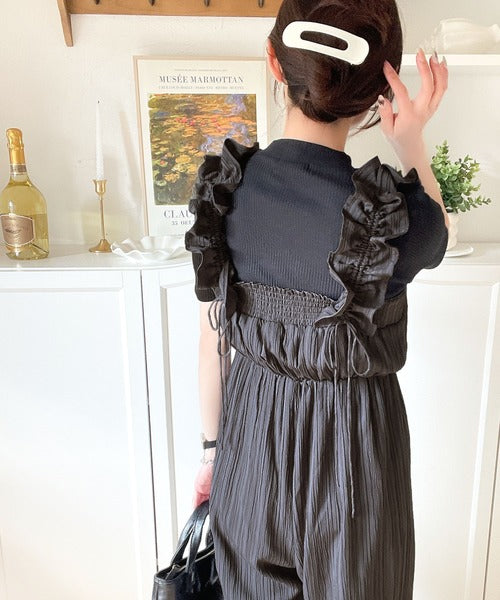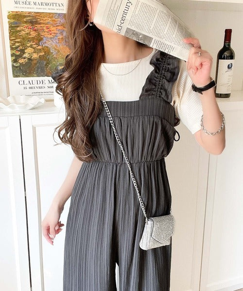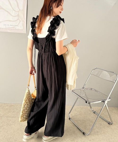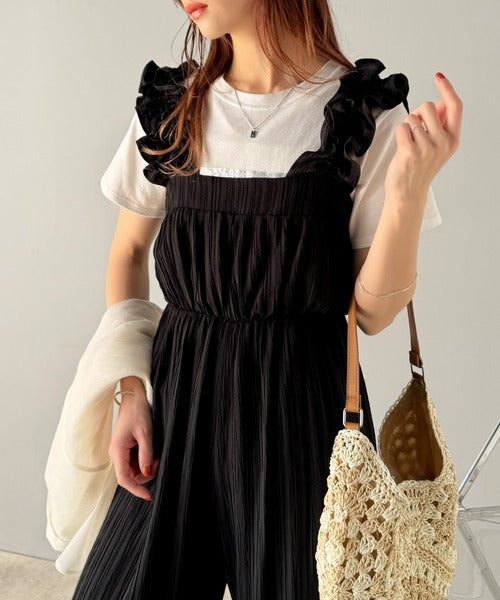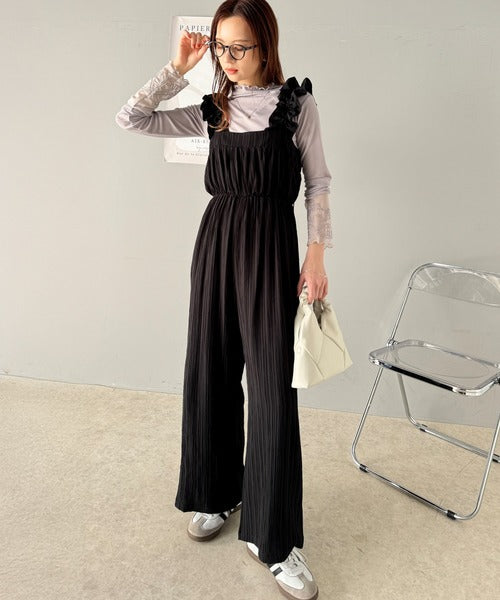 フリルギャザーが女性らしさを引き立てるオールインワン。