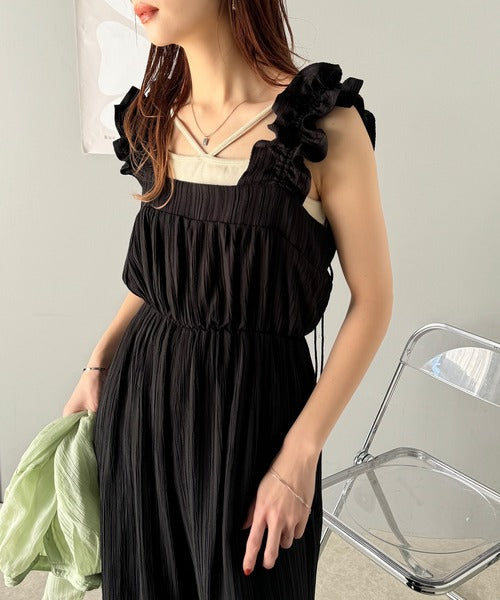 大人っぽ可愛いを叶える!楊柳ストライプ素材フリルギャザーショルダー オールインワンサロペット ce1070142