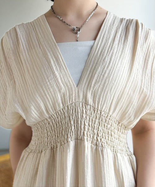 前後深めのVネックラインが、顔周りをすっきり魅せ。
