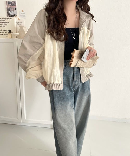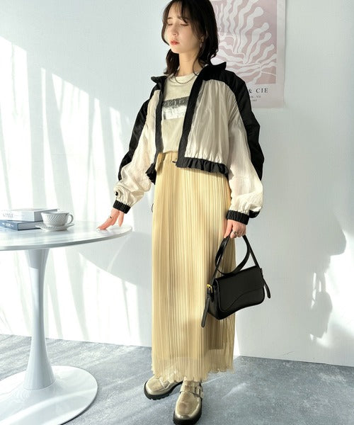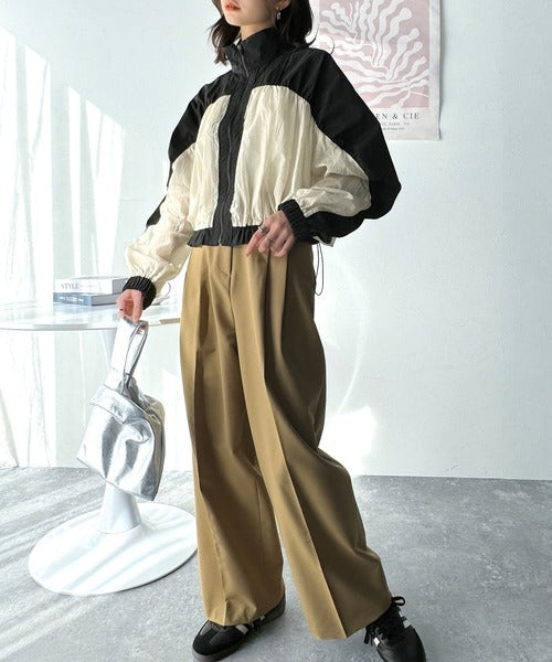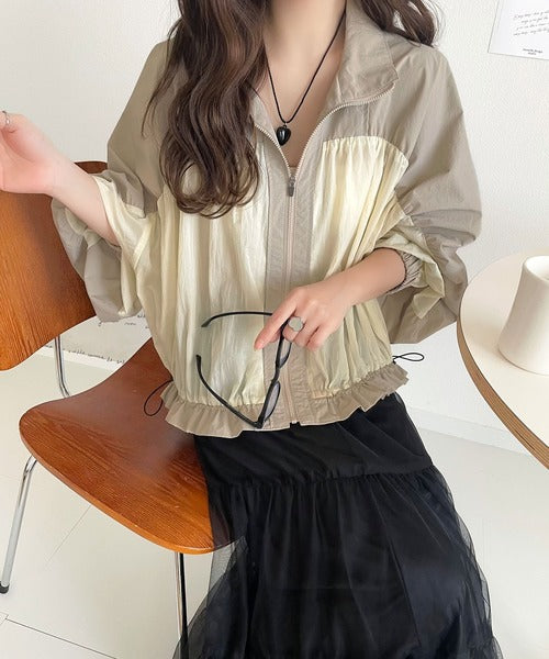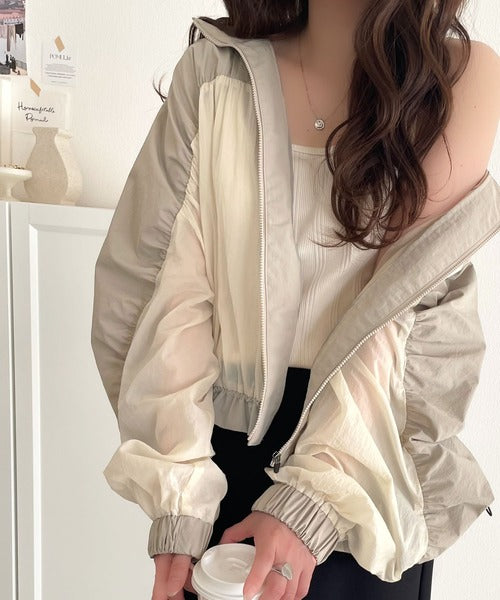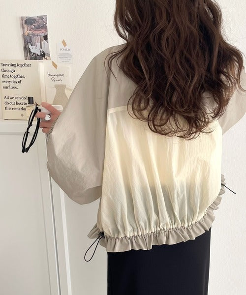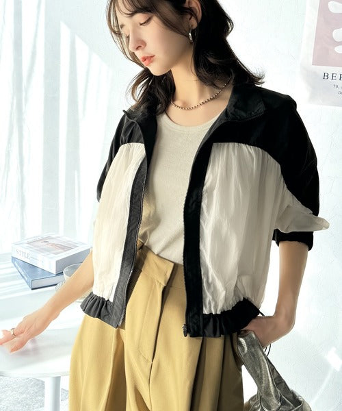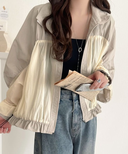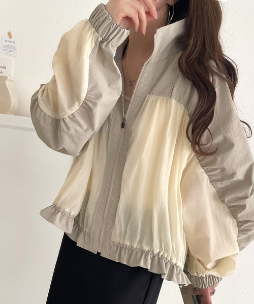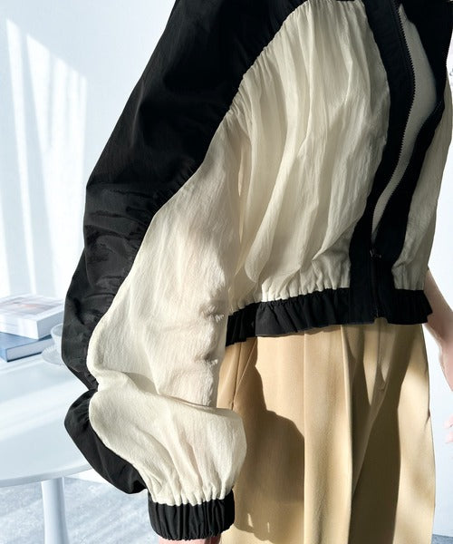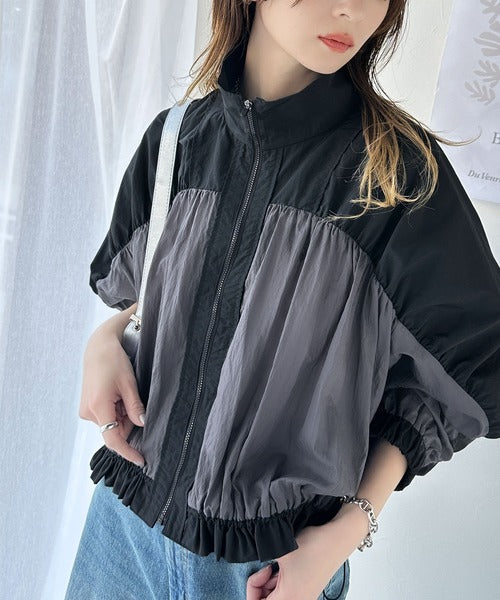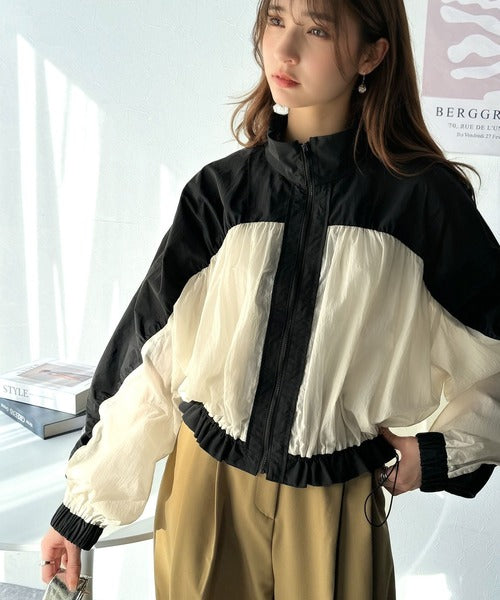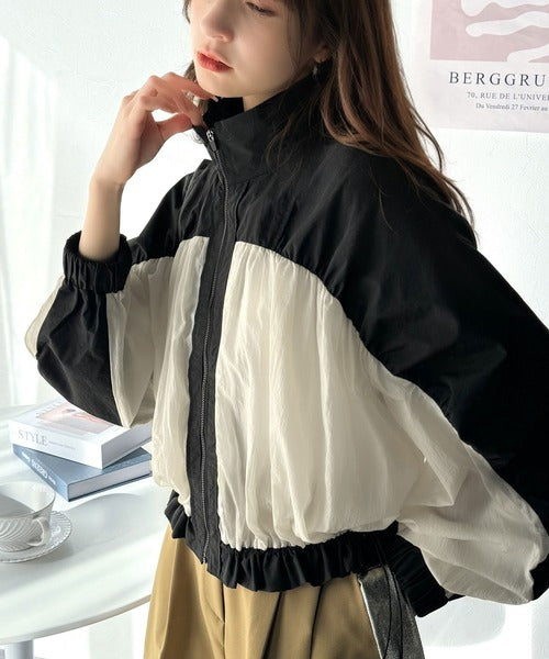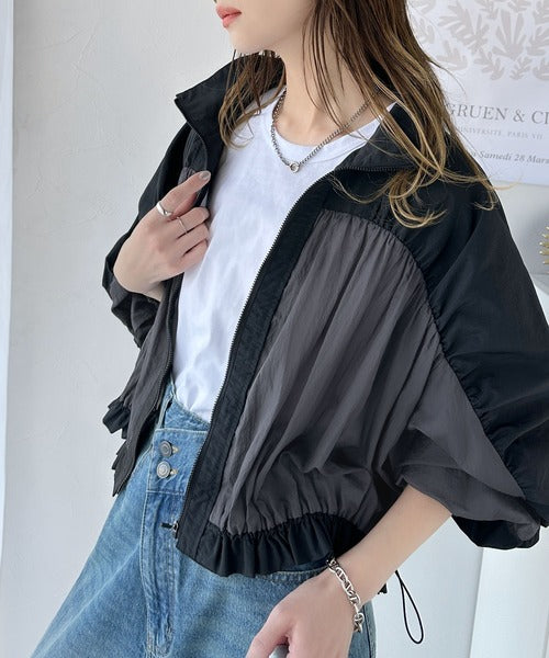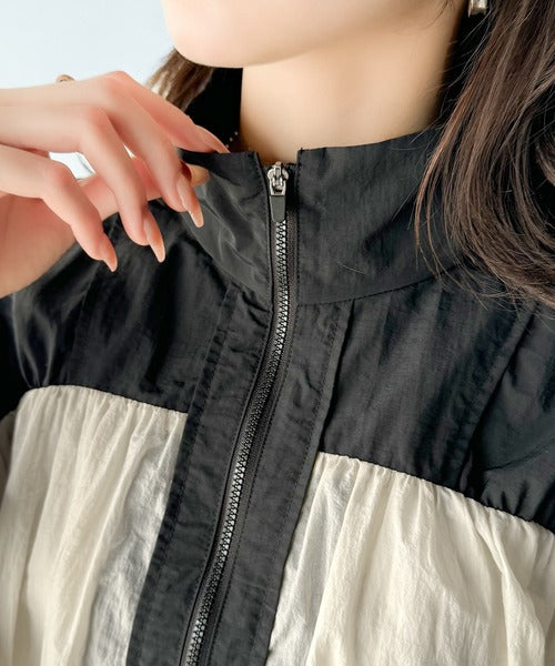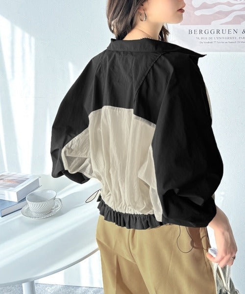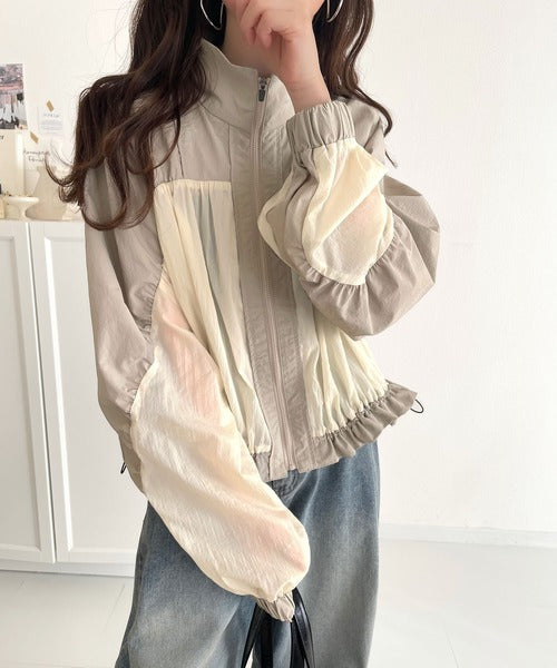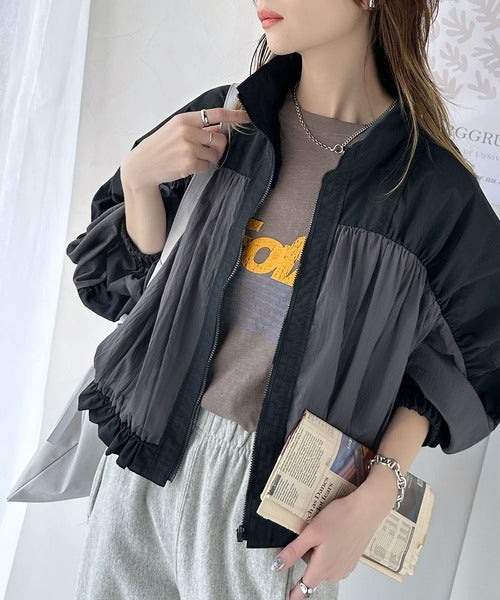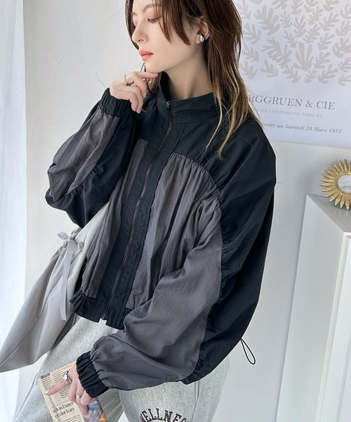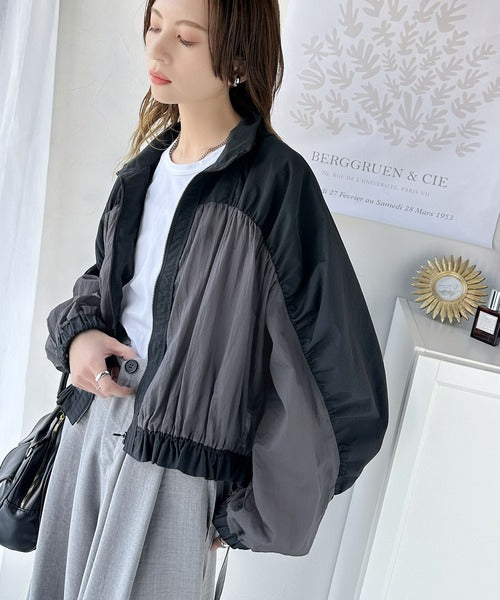 柔らかなシアーが魅力。軽量ナイロン異素材ドッキングギャザー使いスタンドカラーブルゾン ce1020207