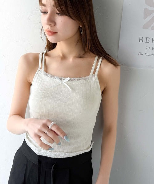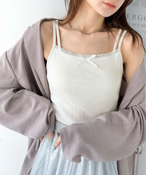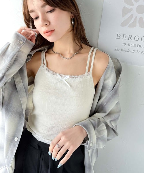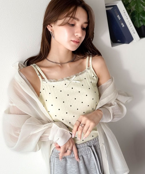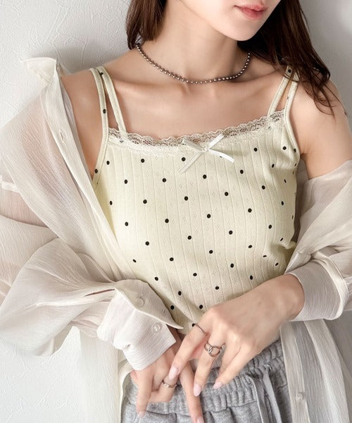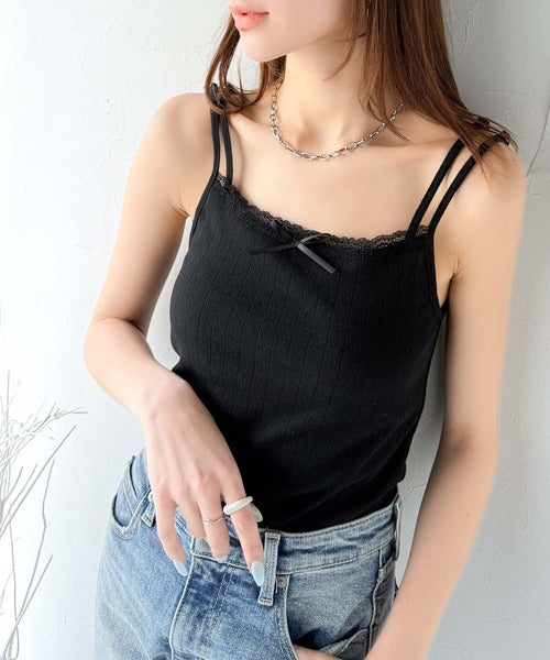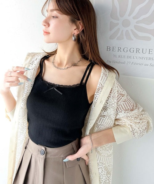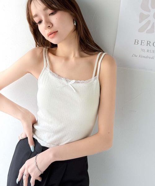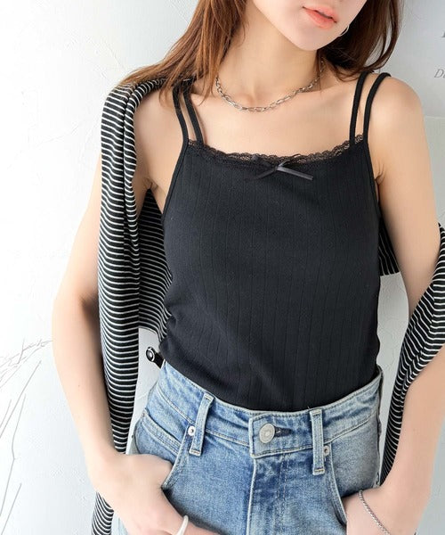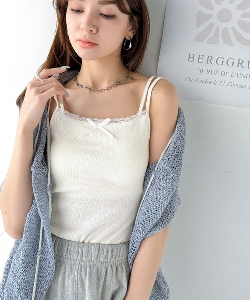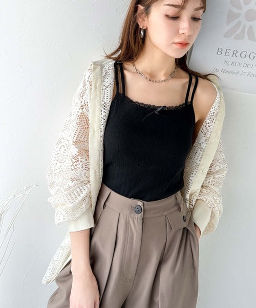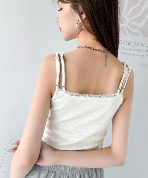 針抜き柄のリブにダブルストラップがオシャレなカップ付きキャミソール。