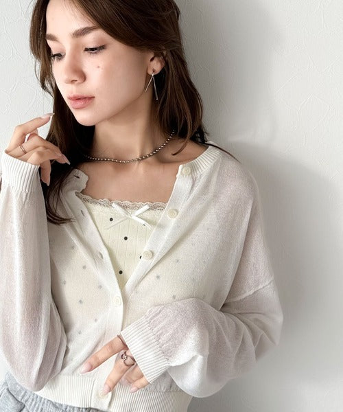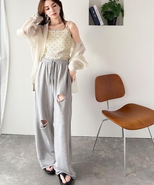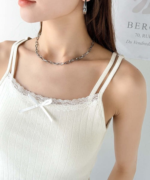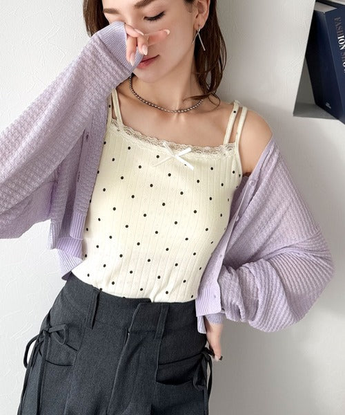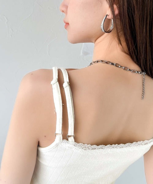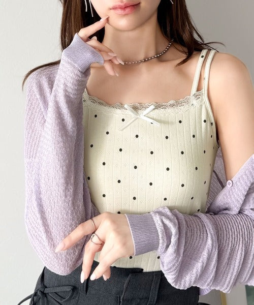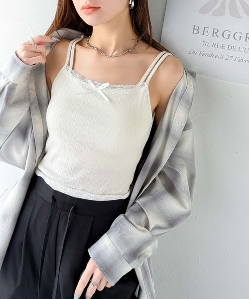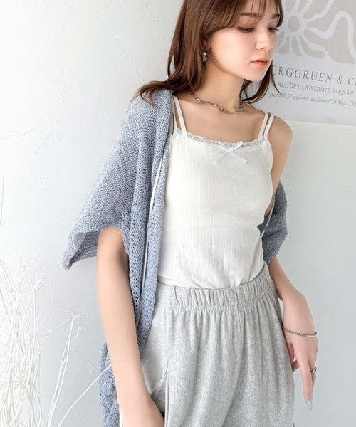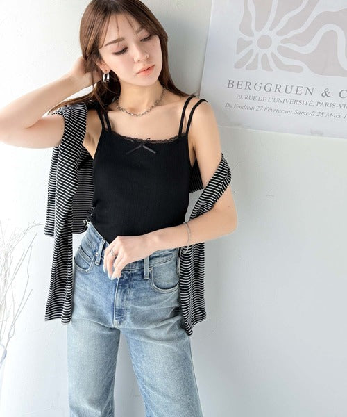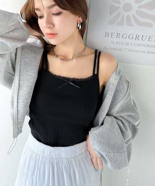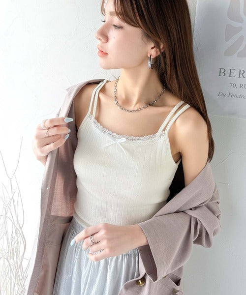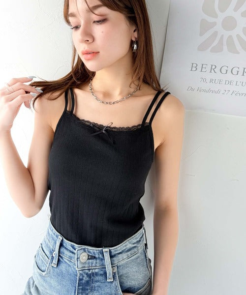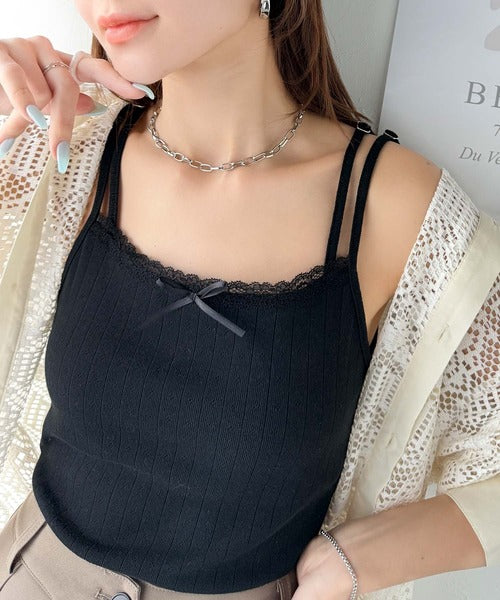 針抜き柄のリブにダブルストラップがオシャレなカップ付きキャミソール。