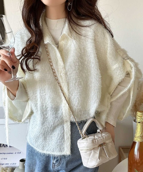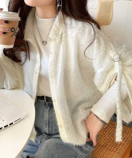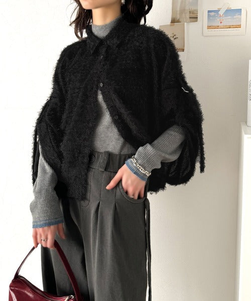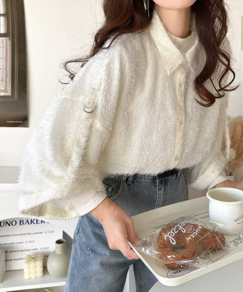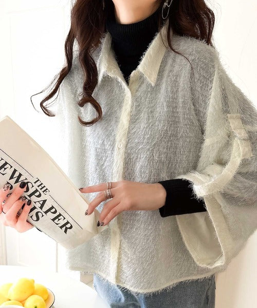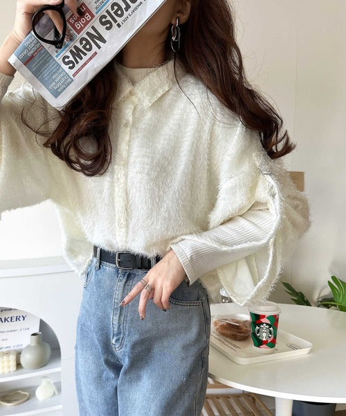 ふわっと軽やかなフェザー素材を使用した、ゆったりとしたオーバーサイズのシャツカーディガンアイテムです。