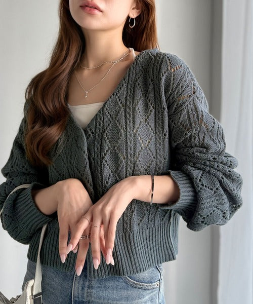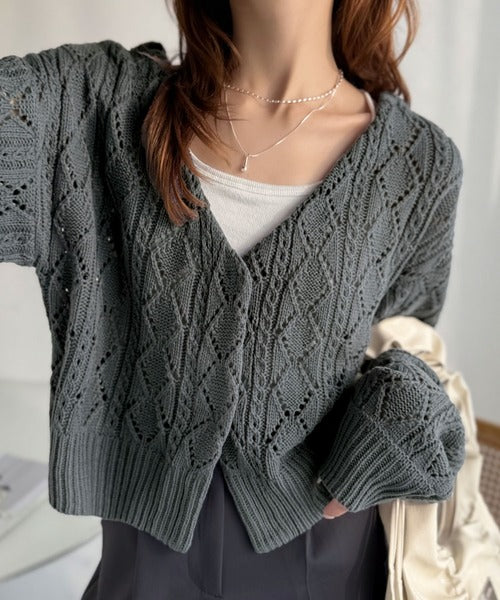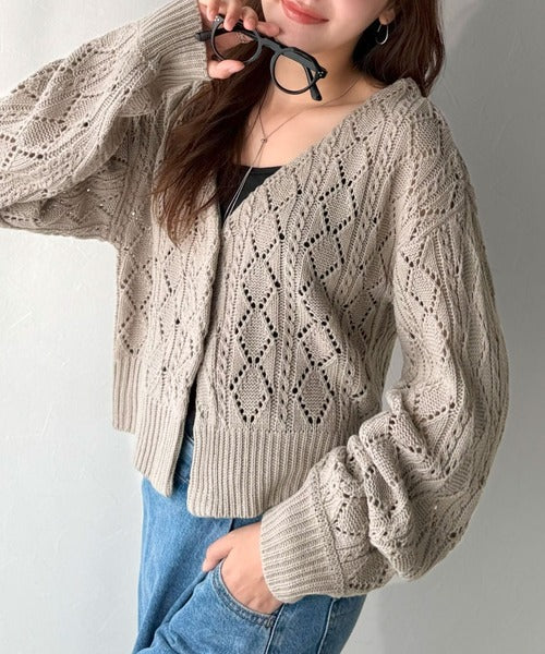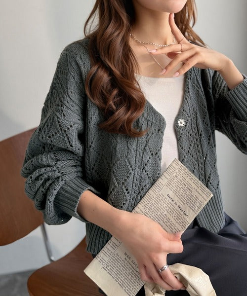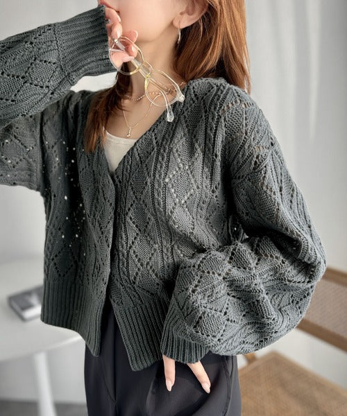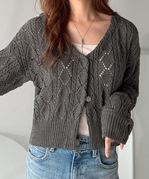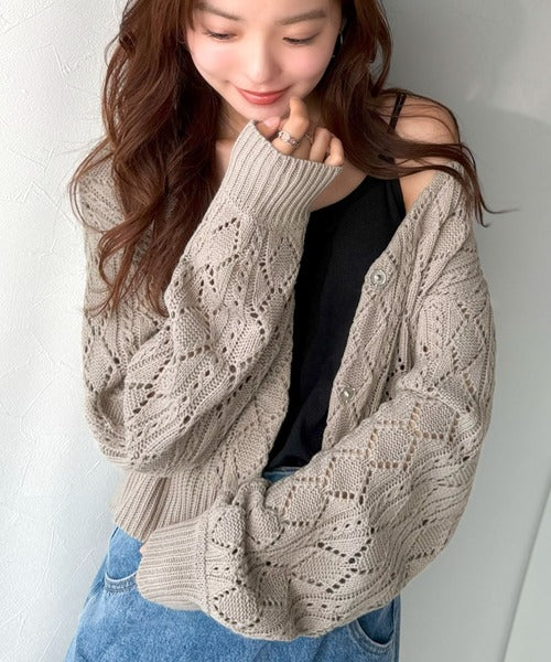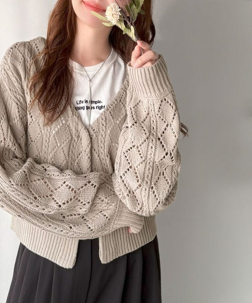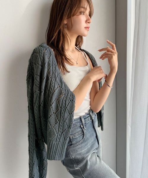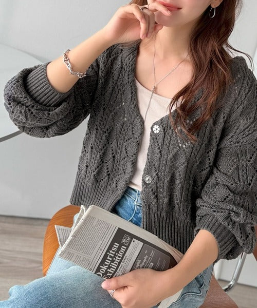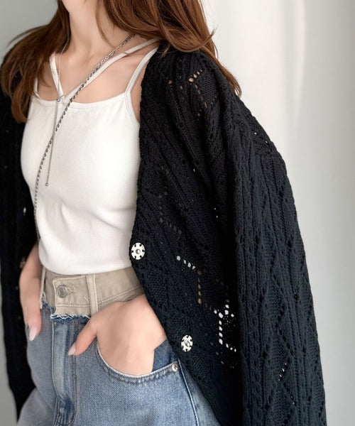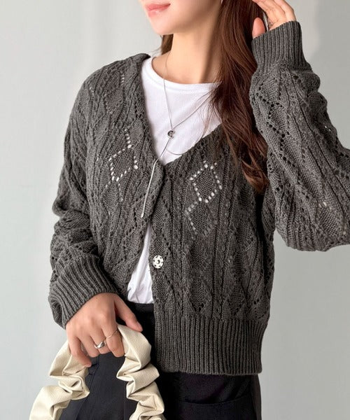 ふわっと軽い着心地が魅力の、格子柄の透かし編みニットカーデ。