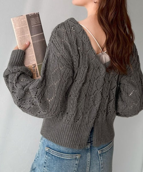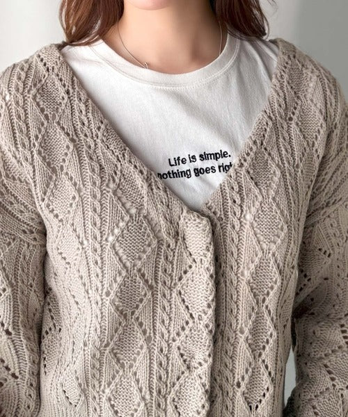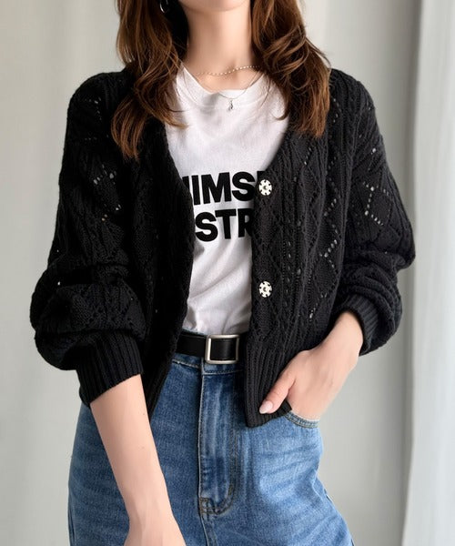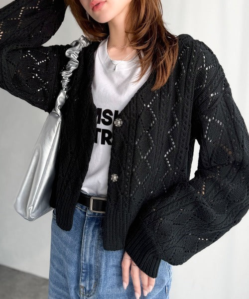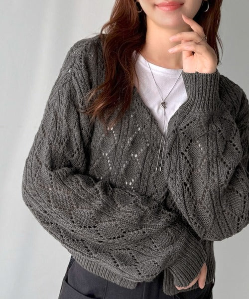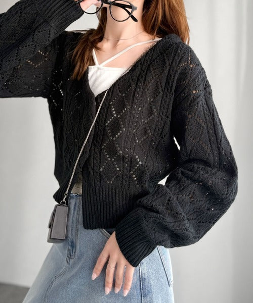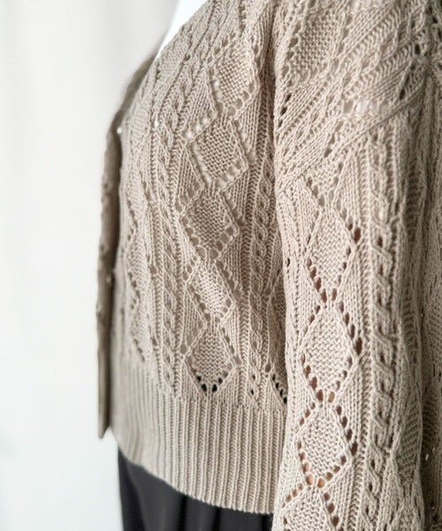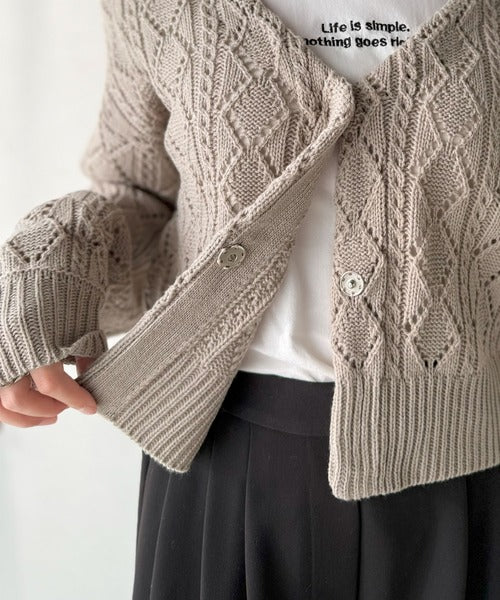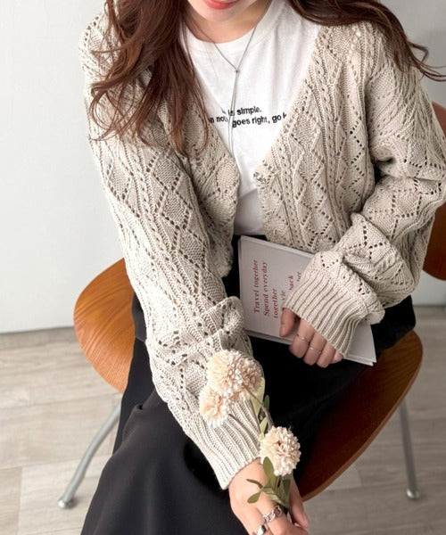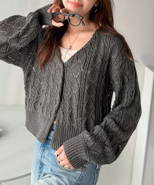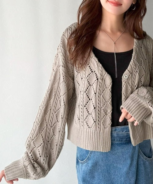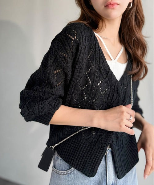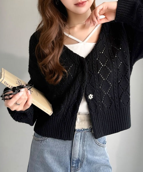 ふわっと軽い着心地が魅力の、格子柄の透かし編みニットカーデ。