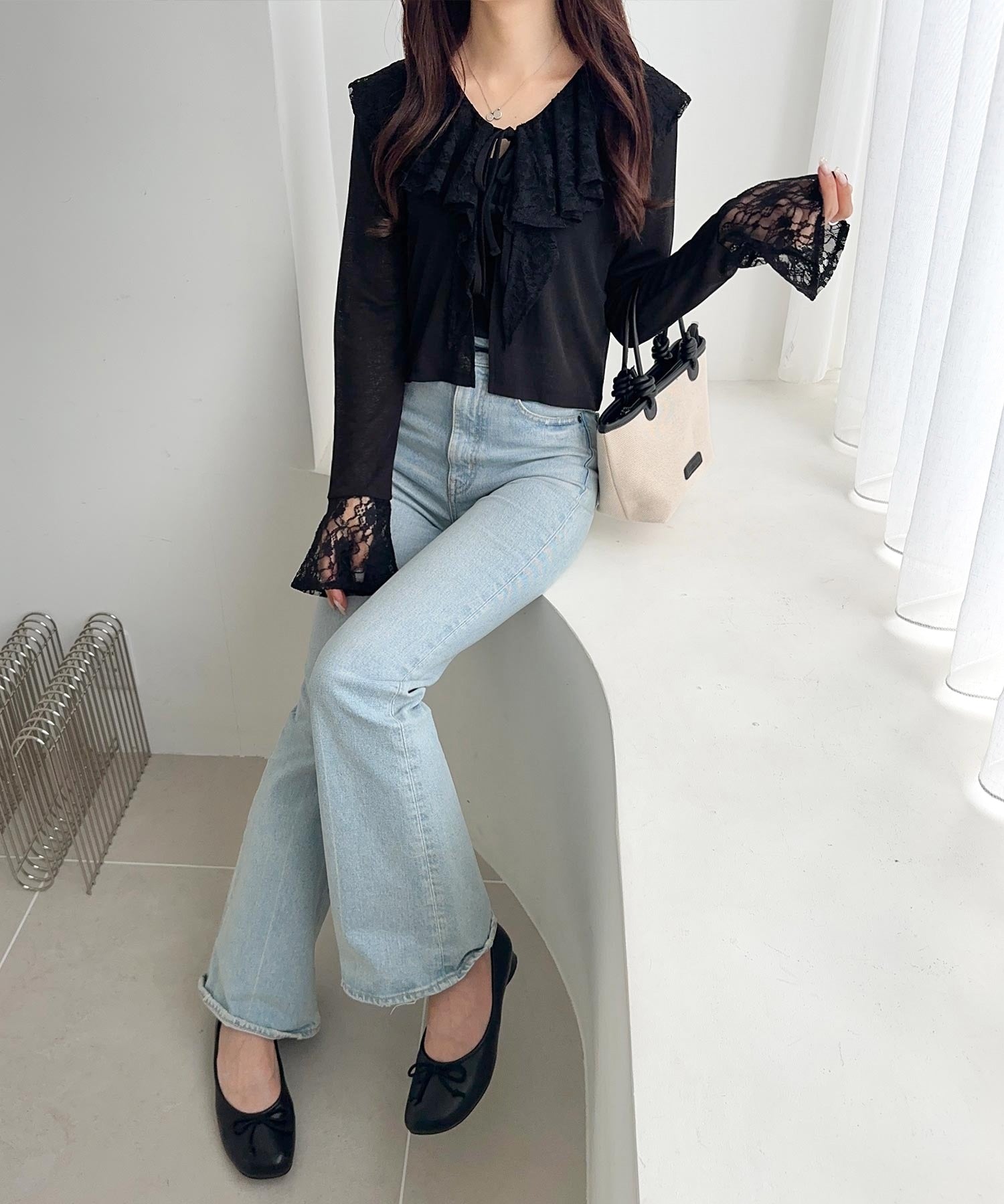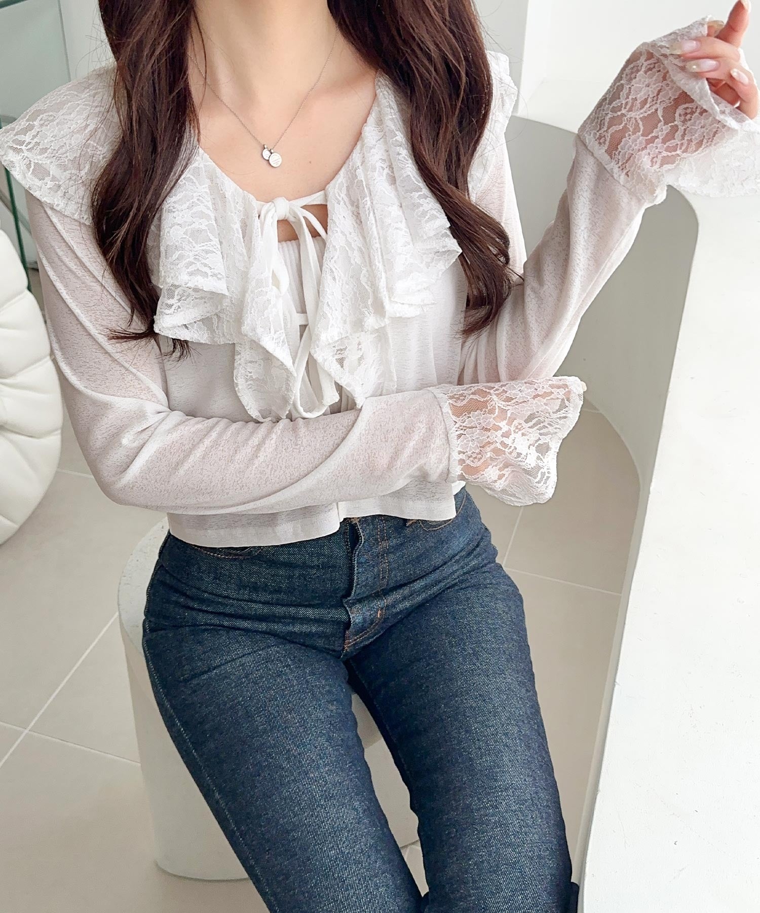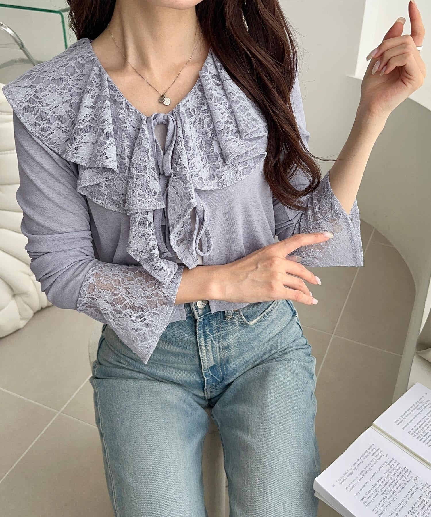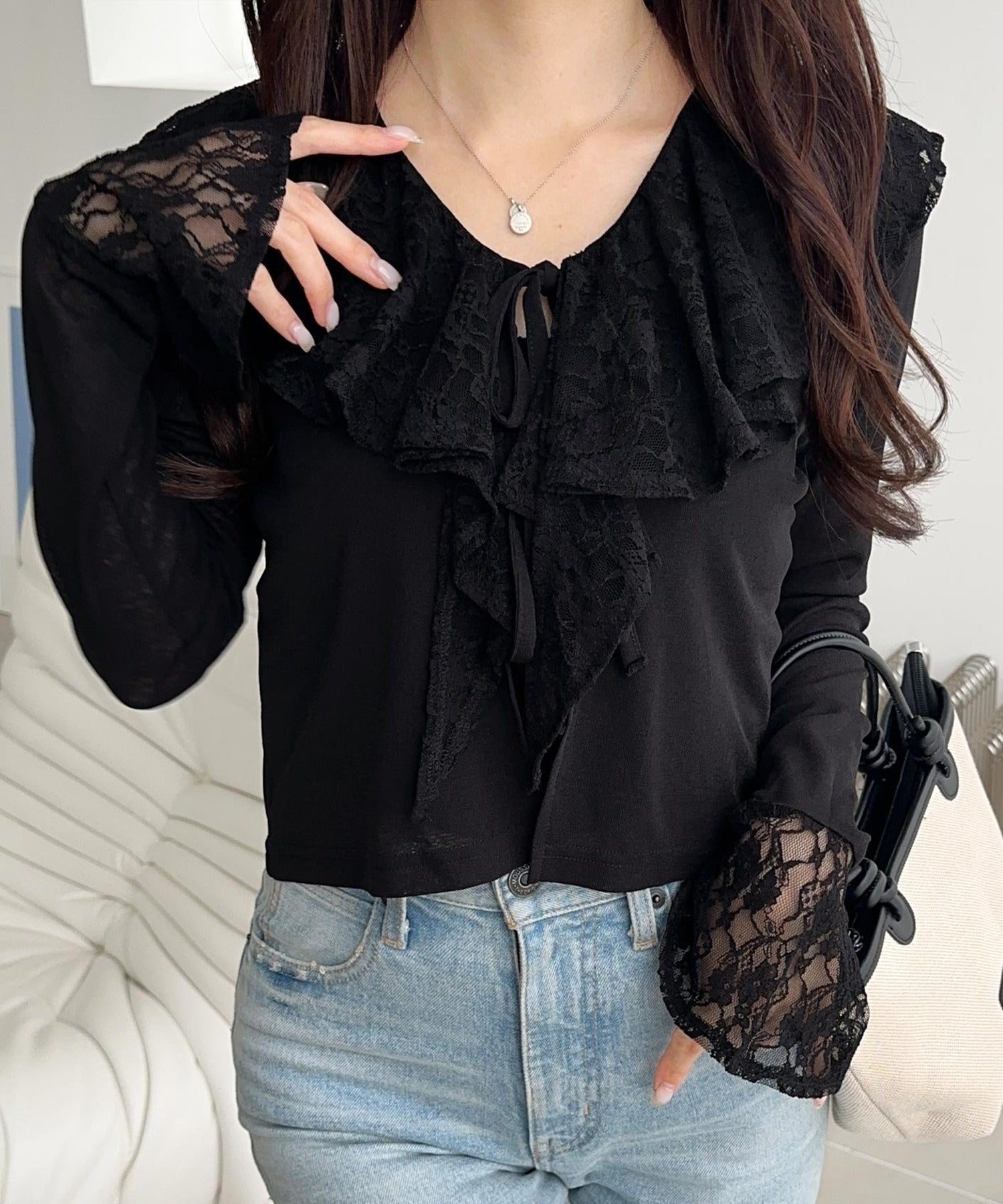 襟元には繊細なリボンディテールを施し、フェミニンさをプラス◎