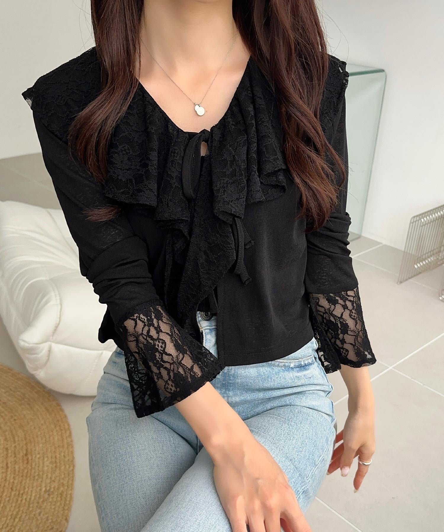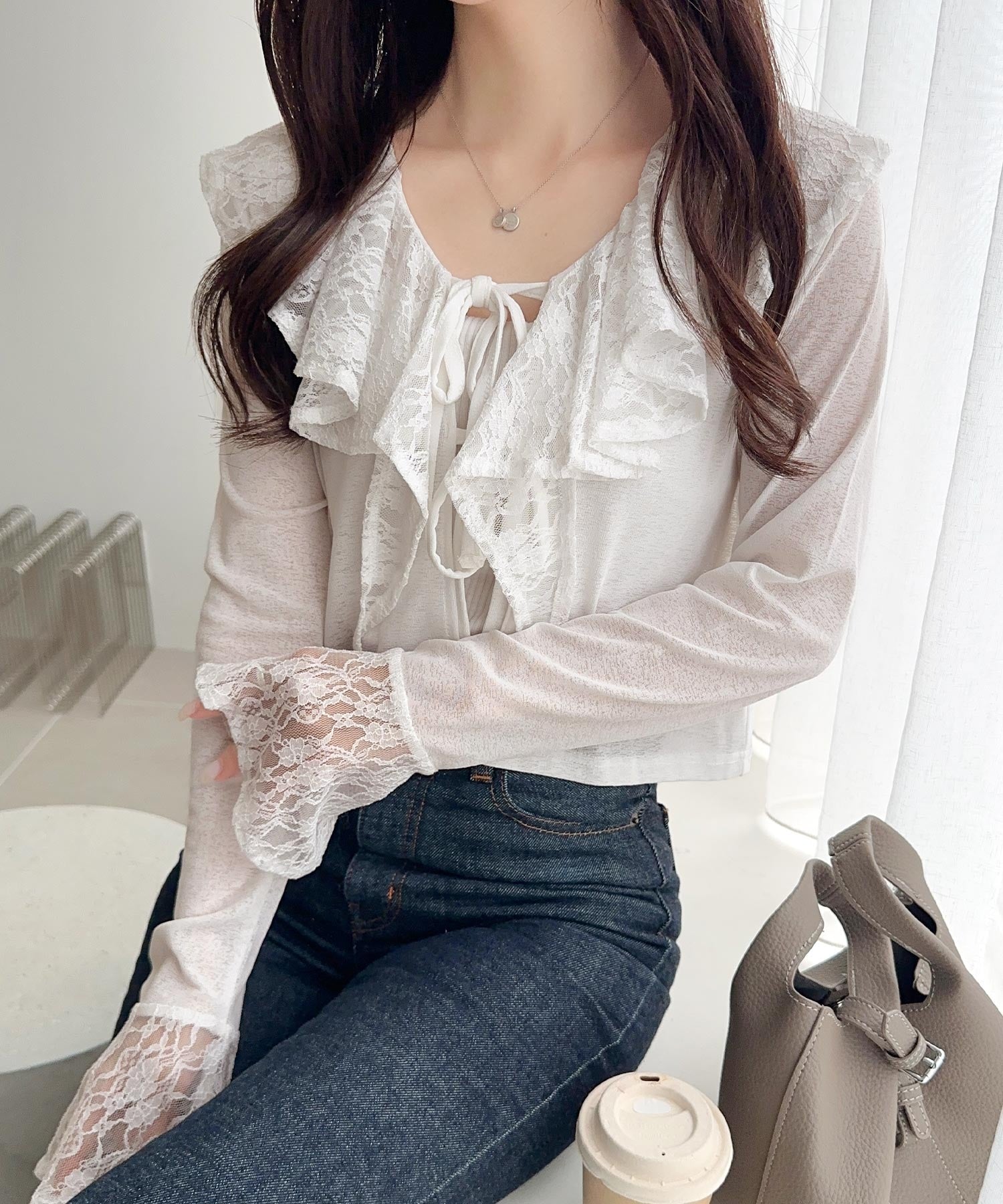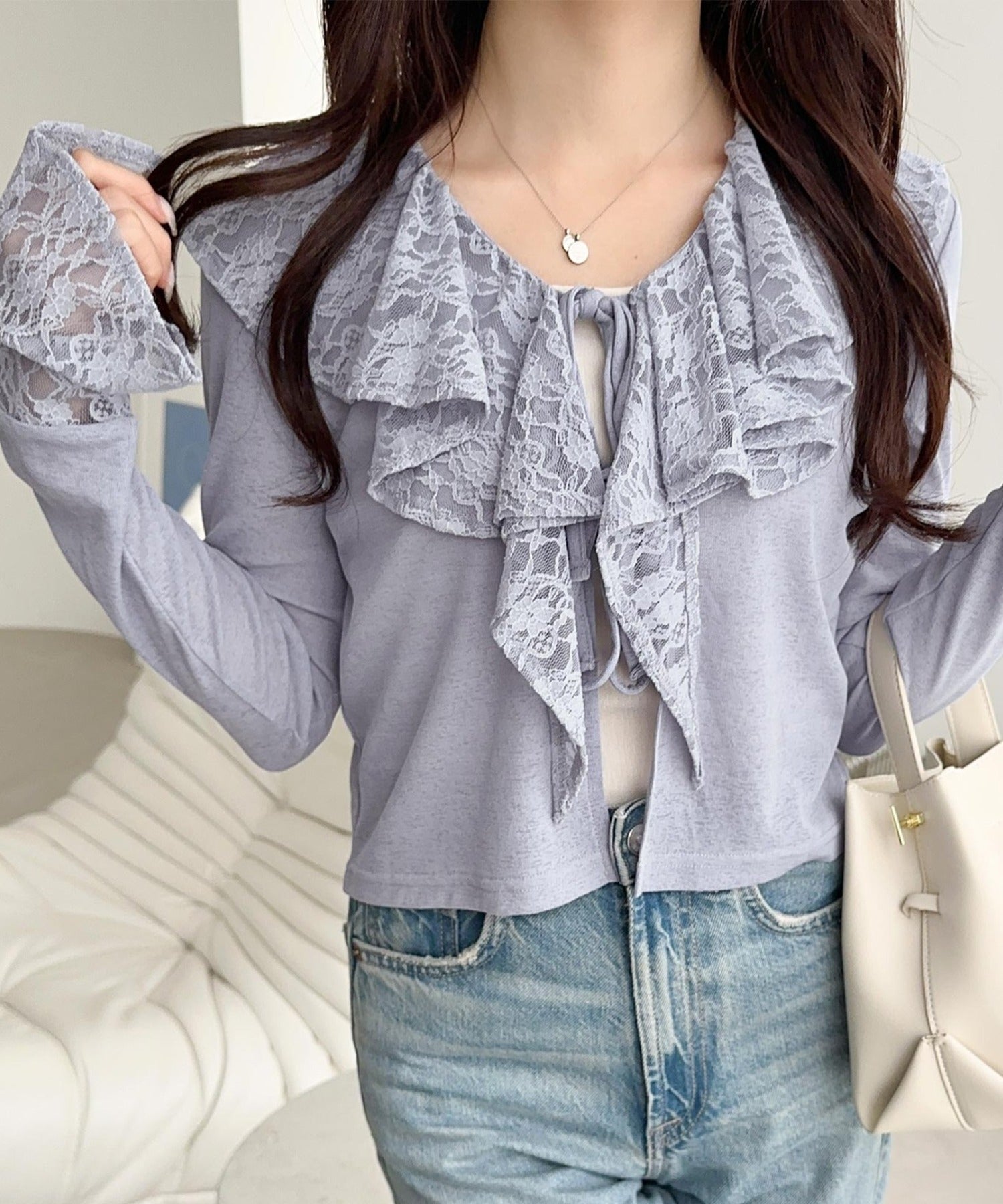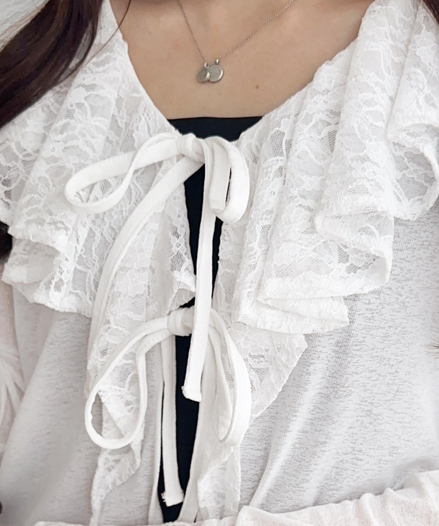 1枚で女性らしさを引き立てるフリルカーディガンは