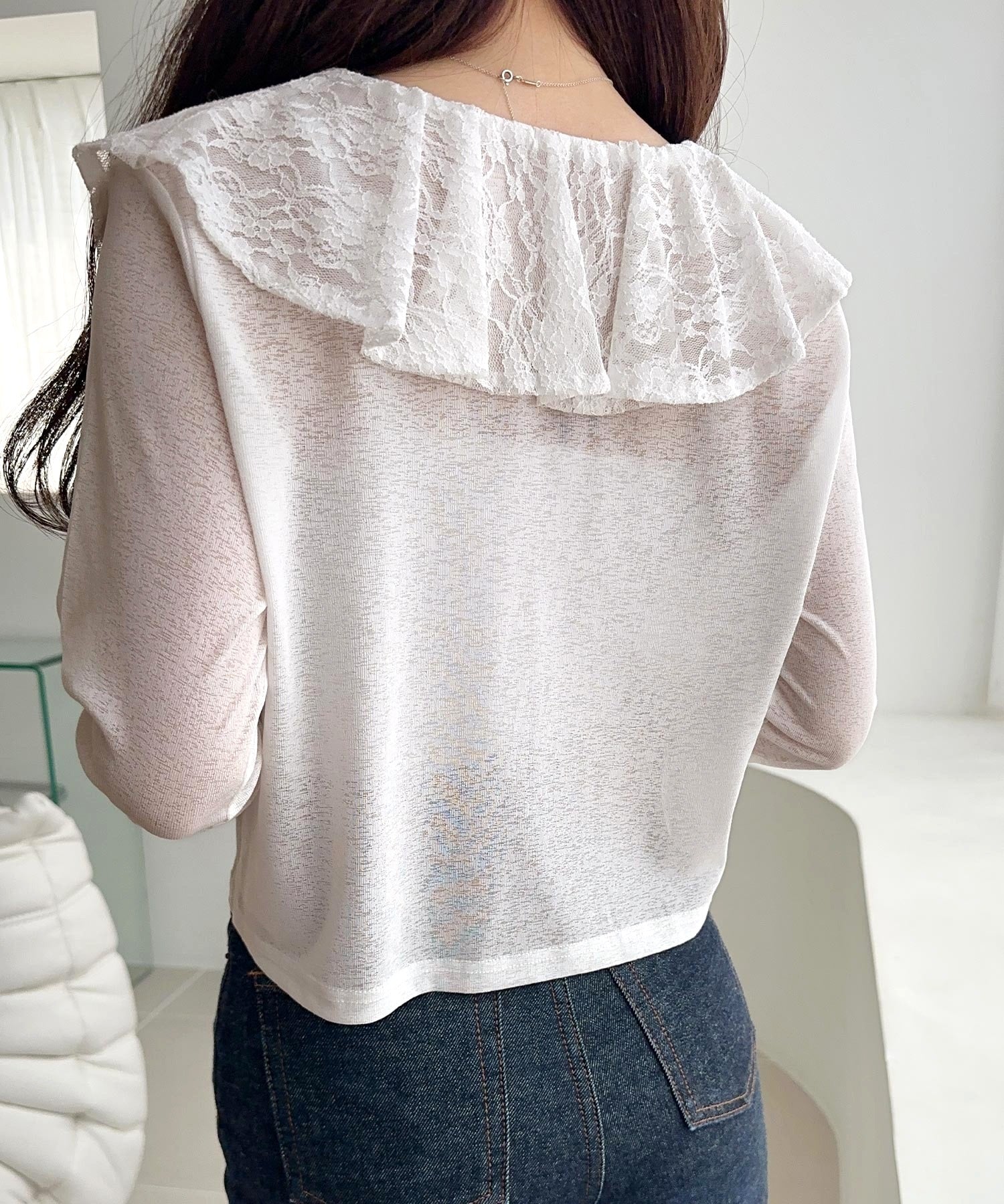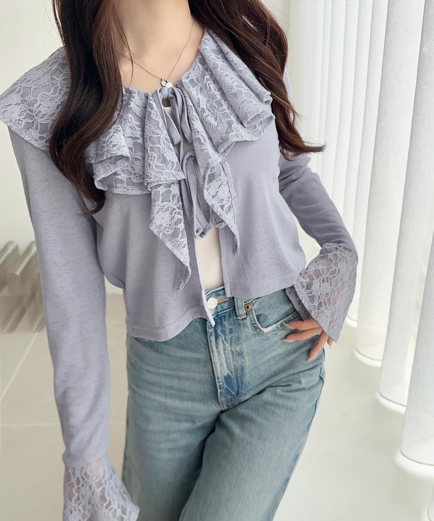 【mily bilet】揺れるフリルで大人フェミニン♪レース襟使いスラブシアーカーディガン mi1019101