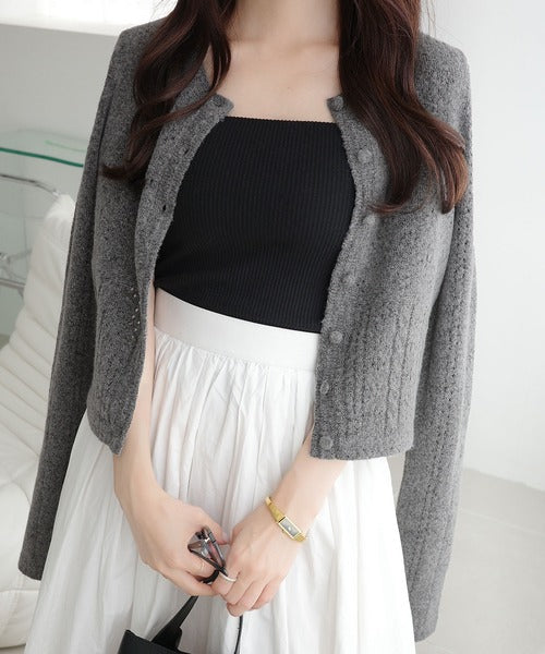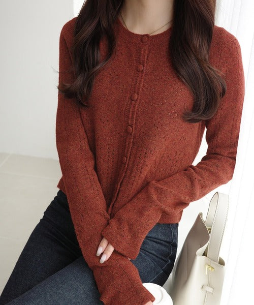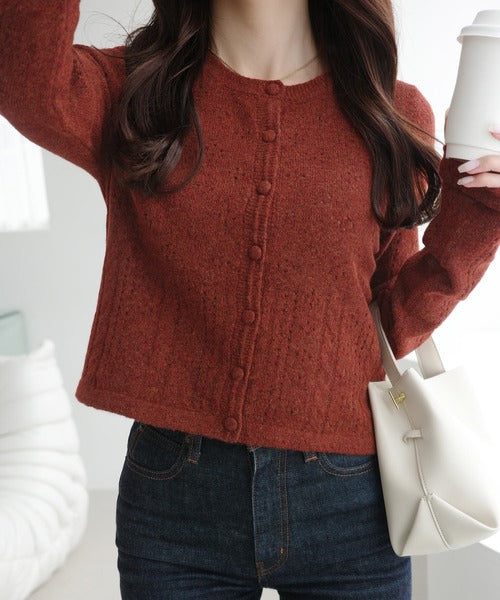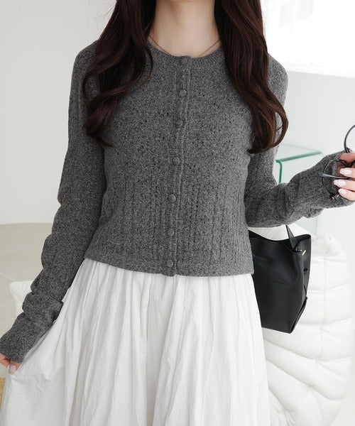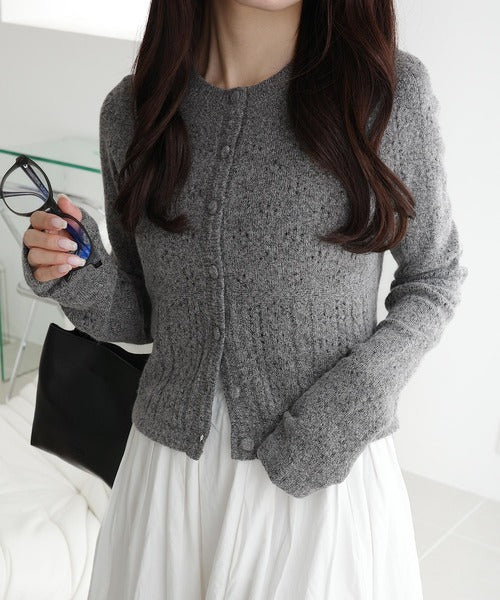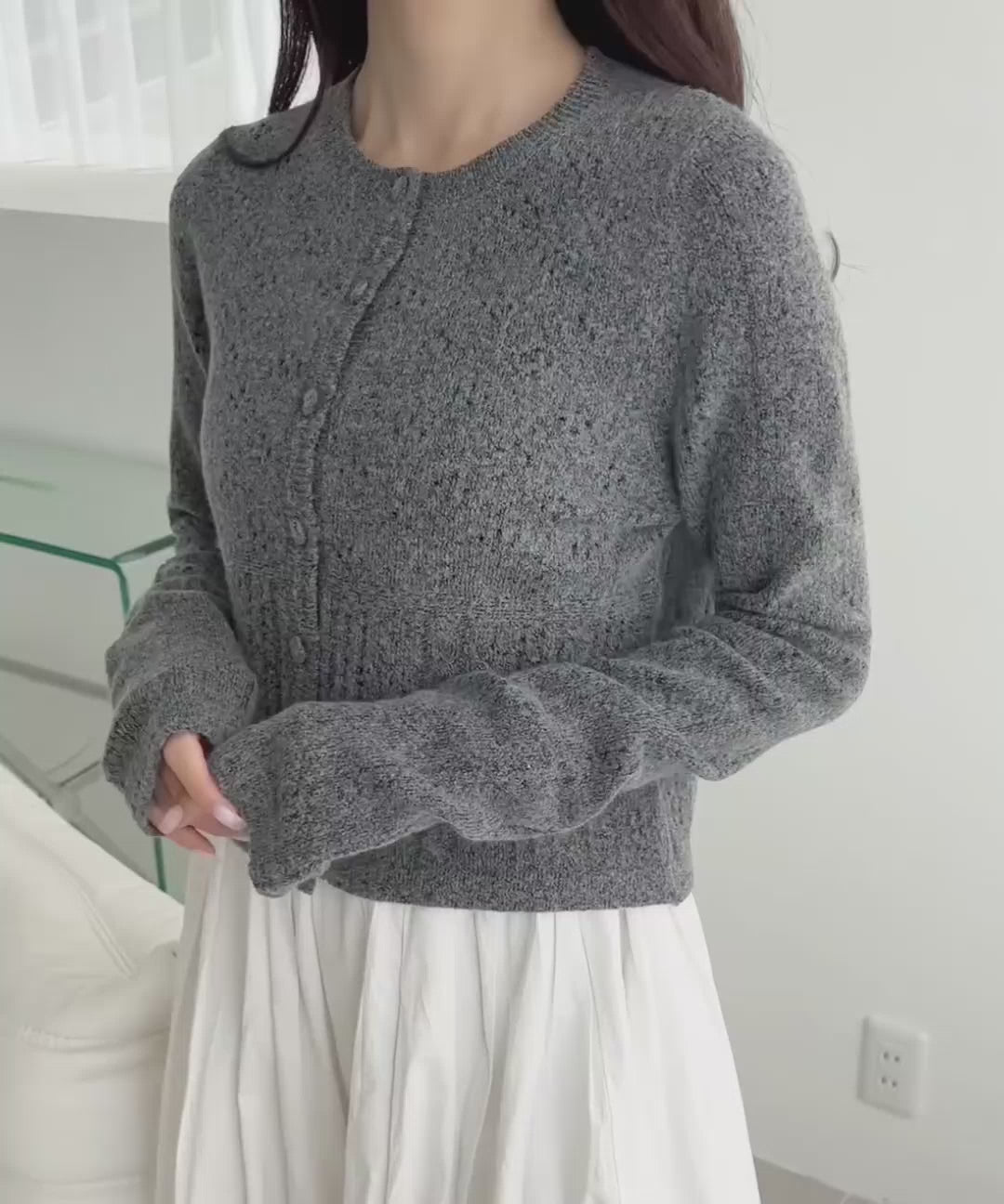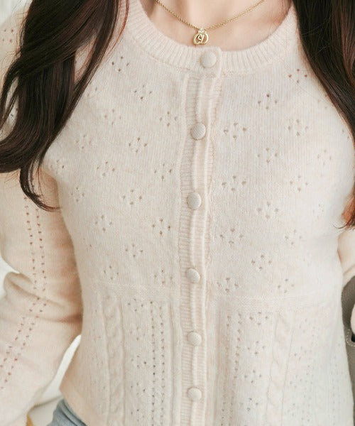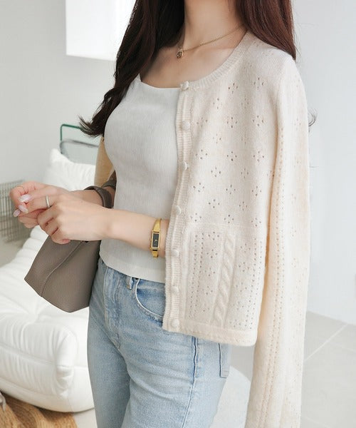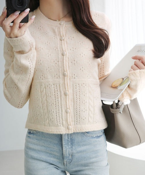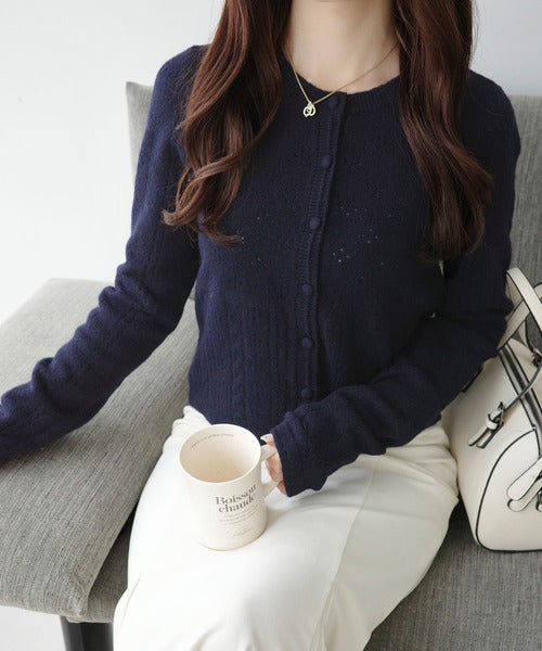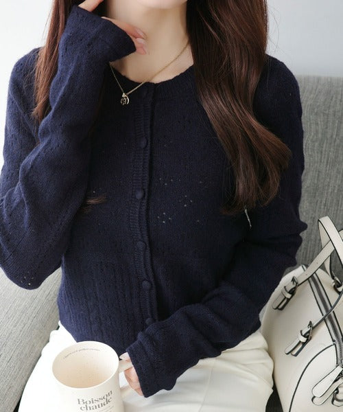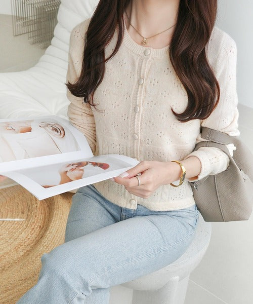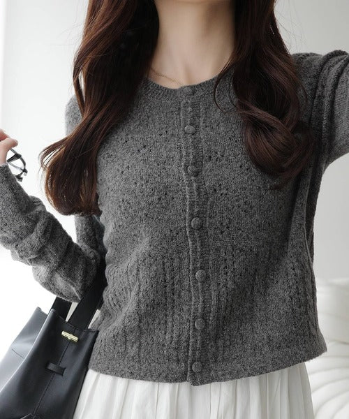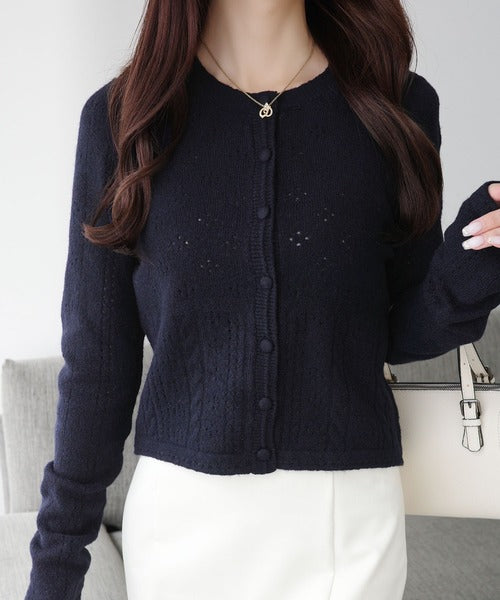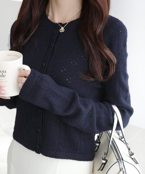 上品さと快適さを兼ね備えた、アイレット柄のニットカーディガン。