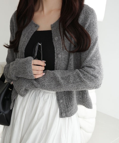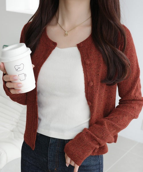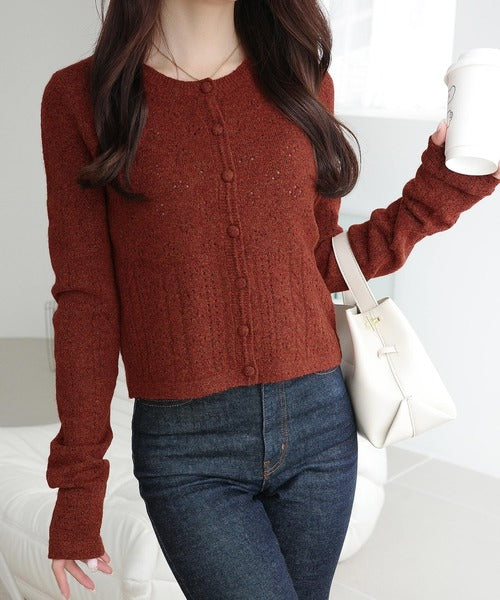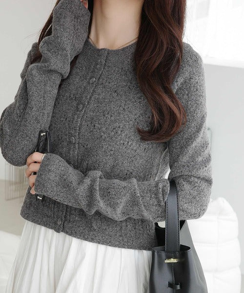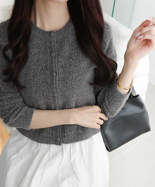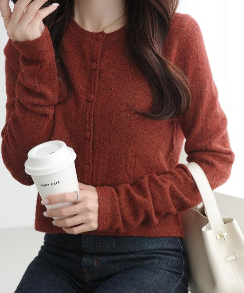 肌触りの良いふわもち素材を使用した、アイレット柄のくるみボタンニットカーディガン。