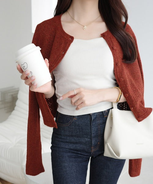 これからのシーズンに大活躍するアイレット柄のニットカーディガン。