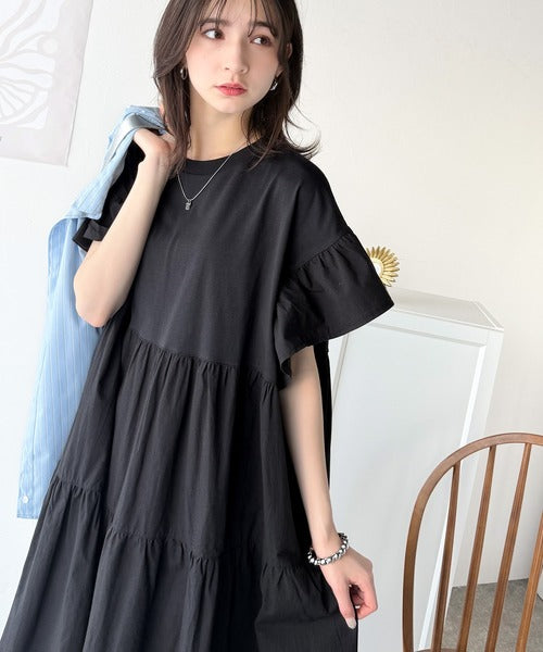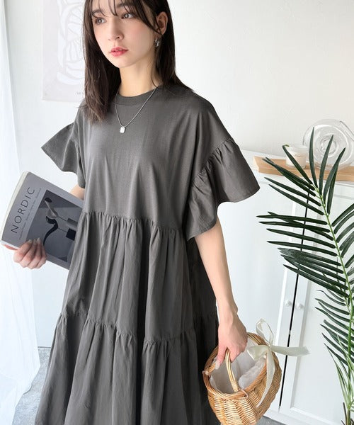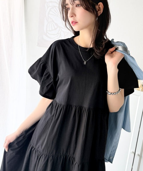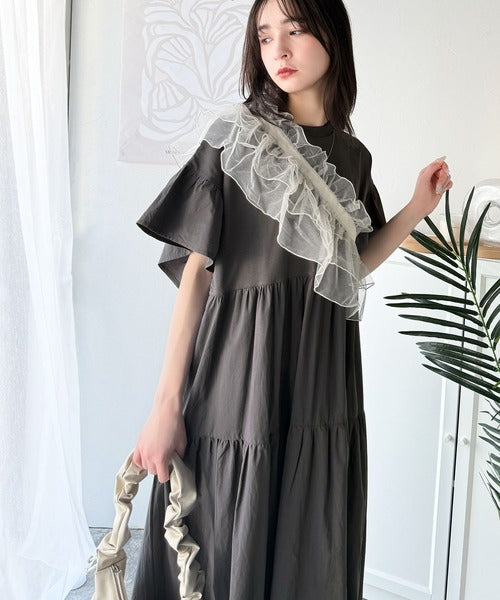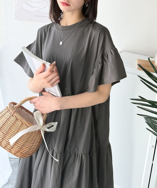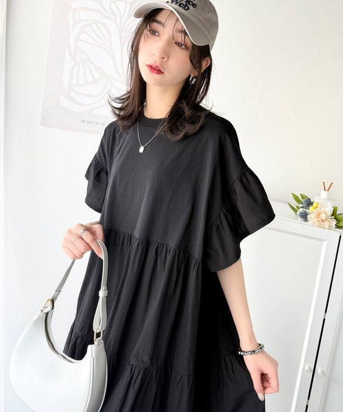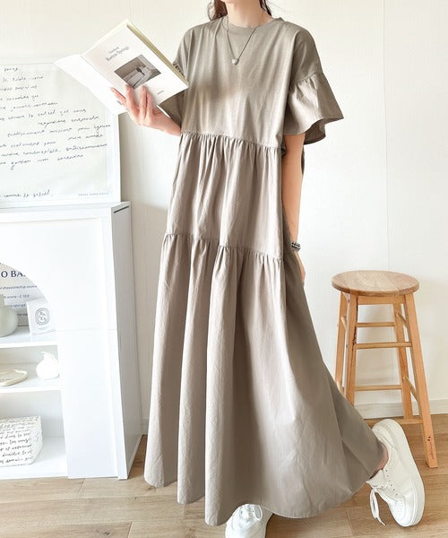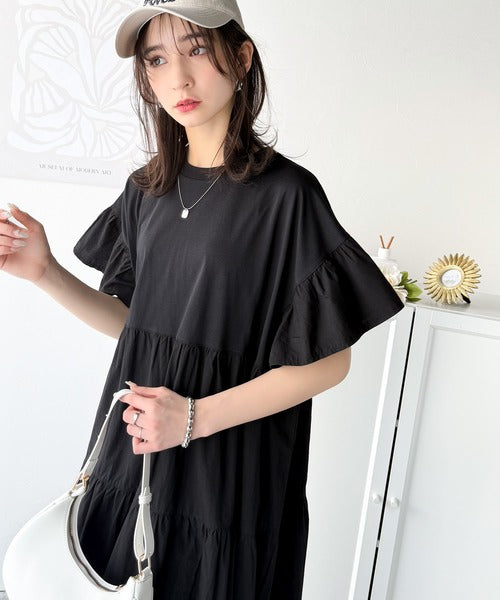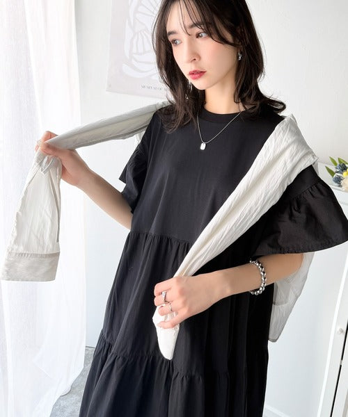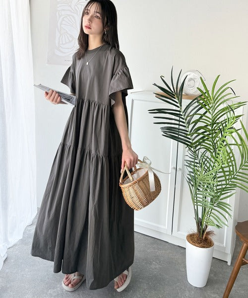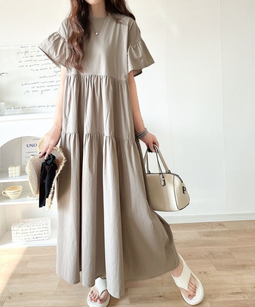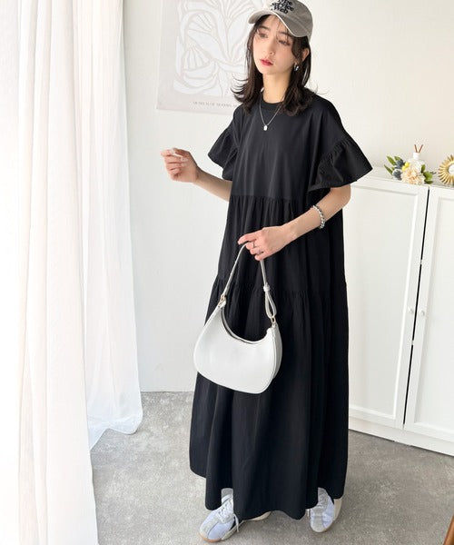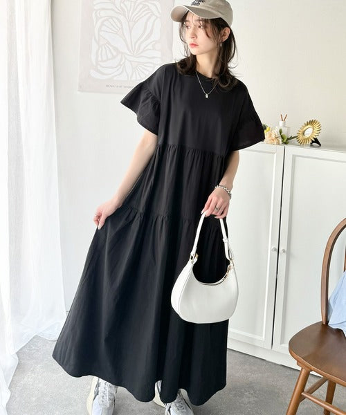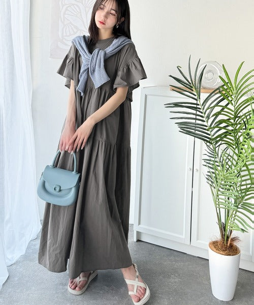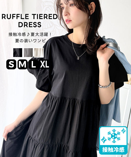 接触冷感♪涼しげフリルで夏の装い。布帛ドッキング袖フリルティアードワンピース(ロング丈) ce1050293