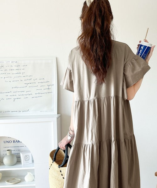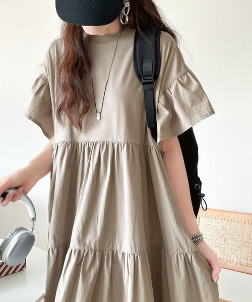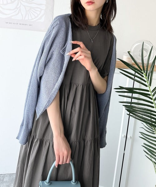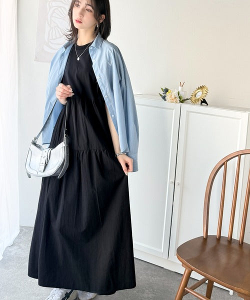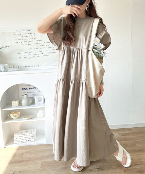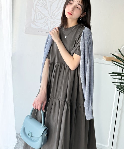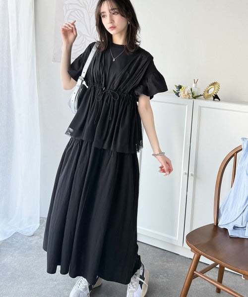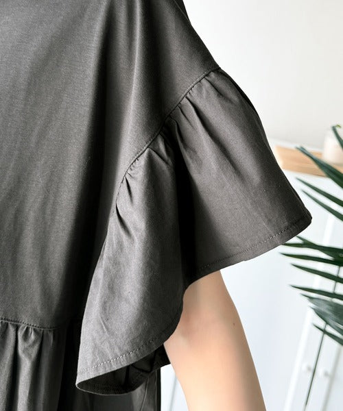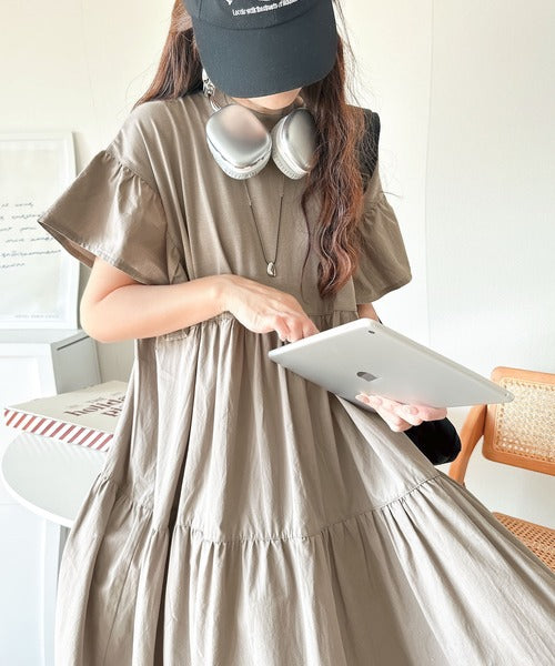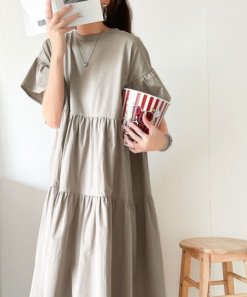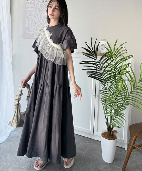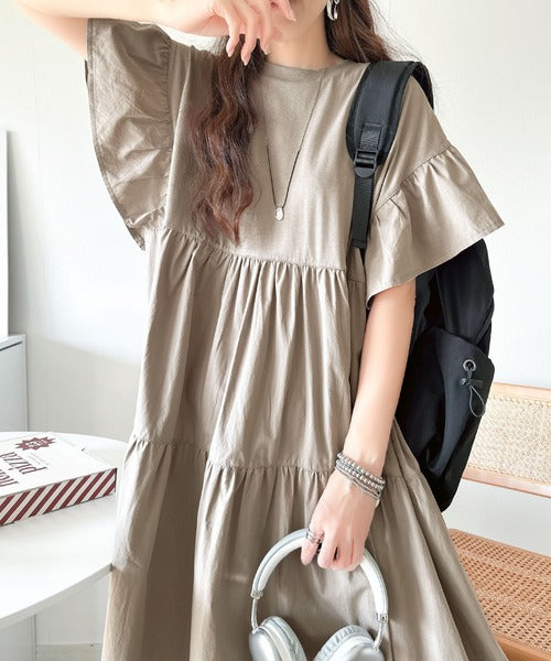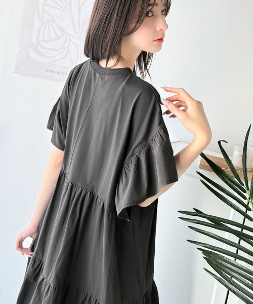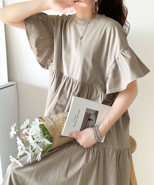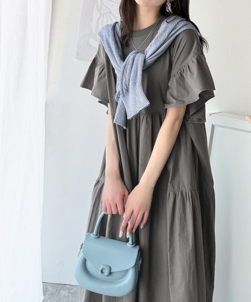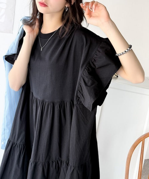 接触冷感♪涼しげフリルで夏の装い。布帛ドッキング袖フリルティアードワンピース(ロング丈) ce1050293