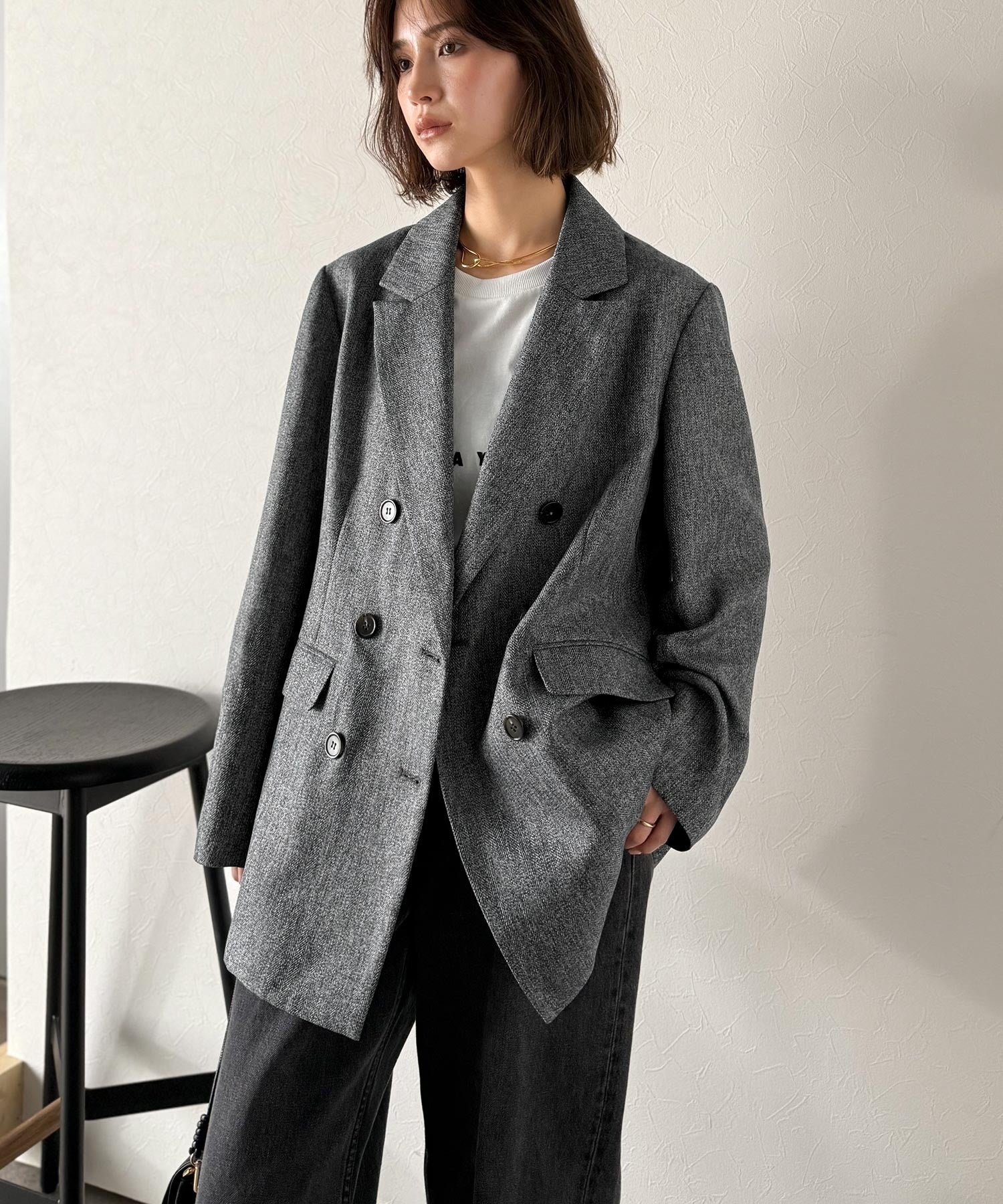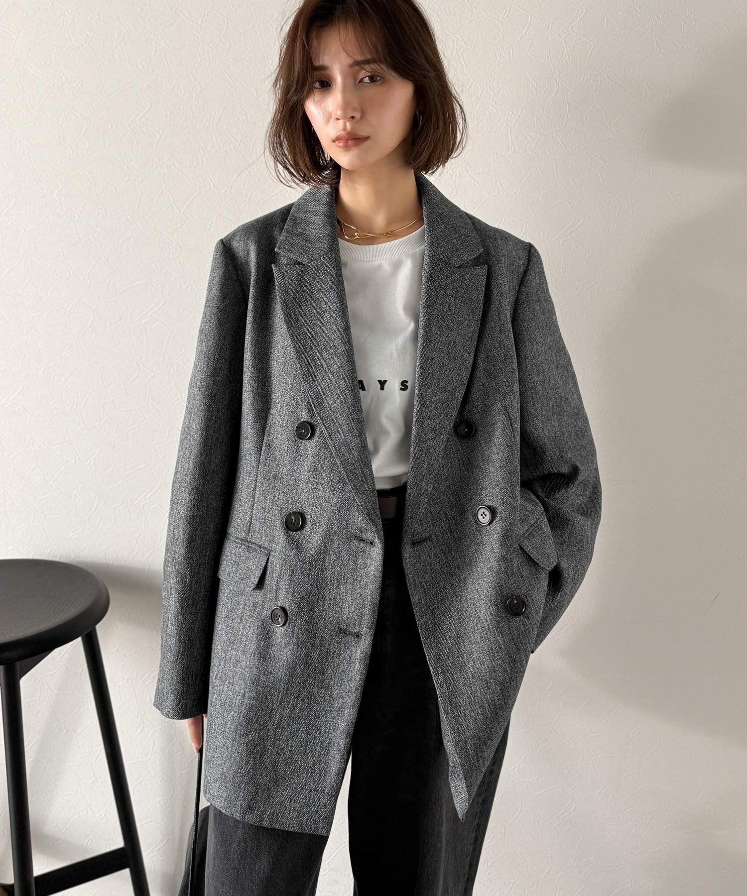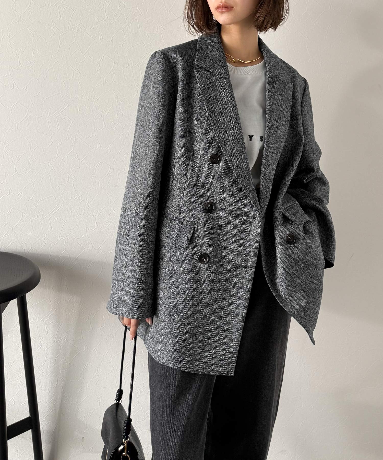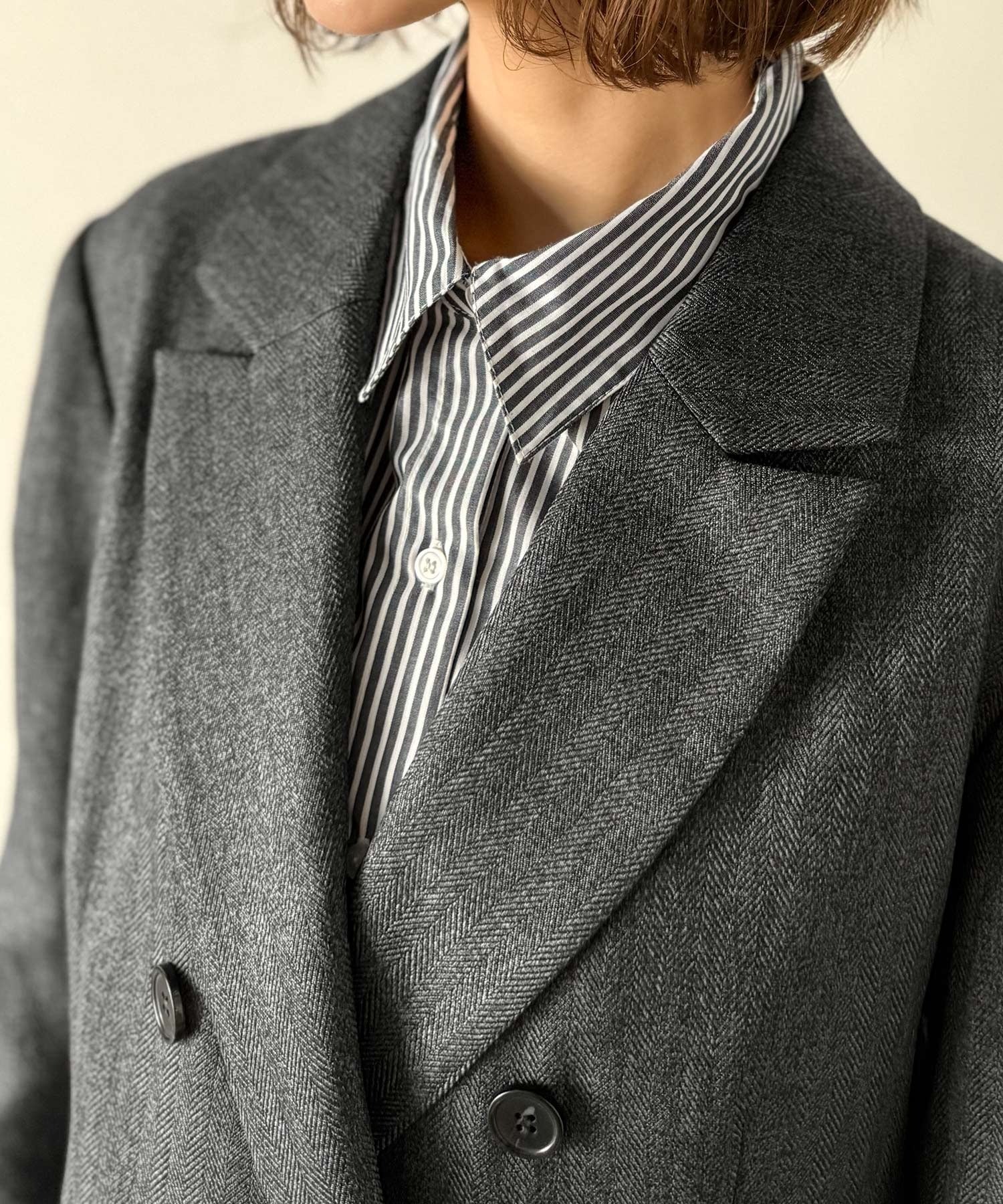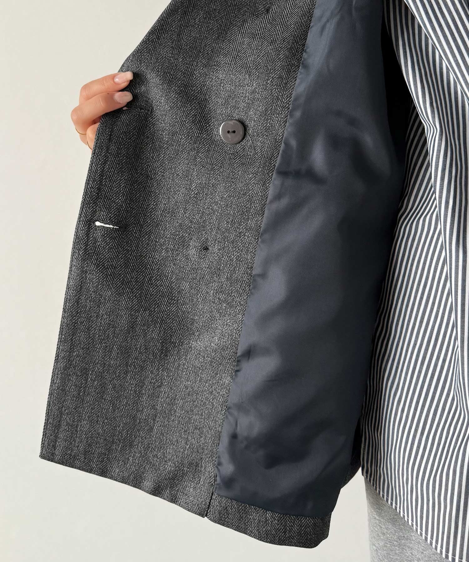 シックなヘリンボーン素材を活かした、3段ボタンダブルジャケット。