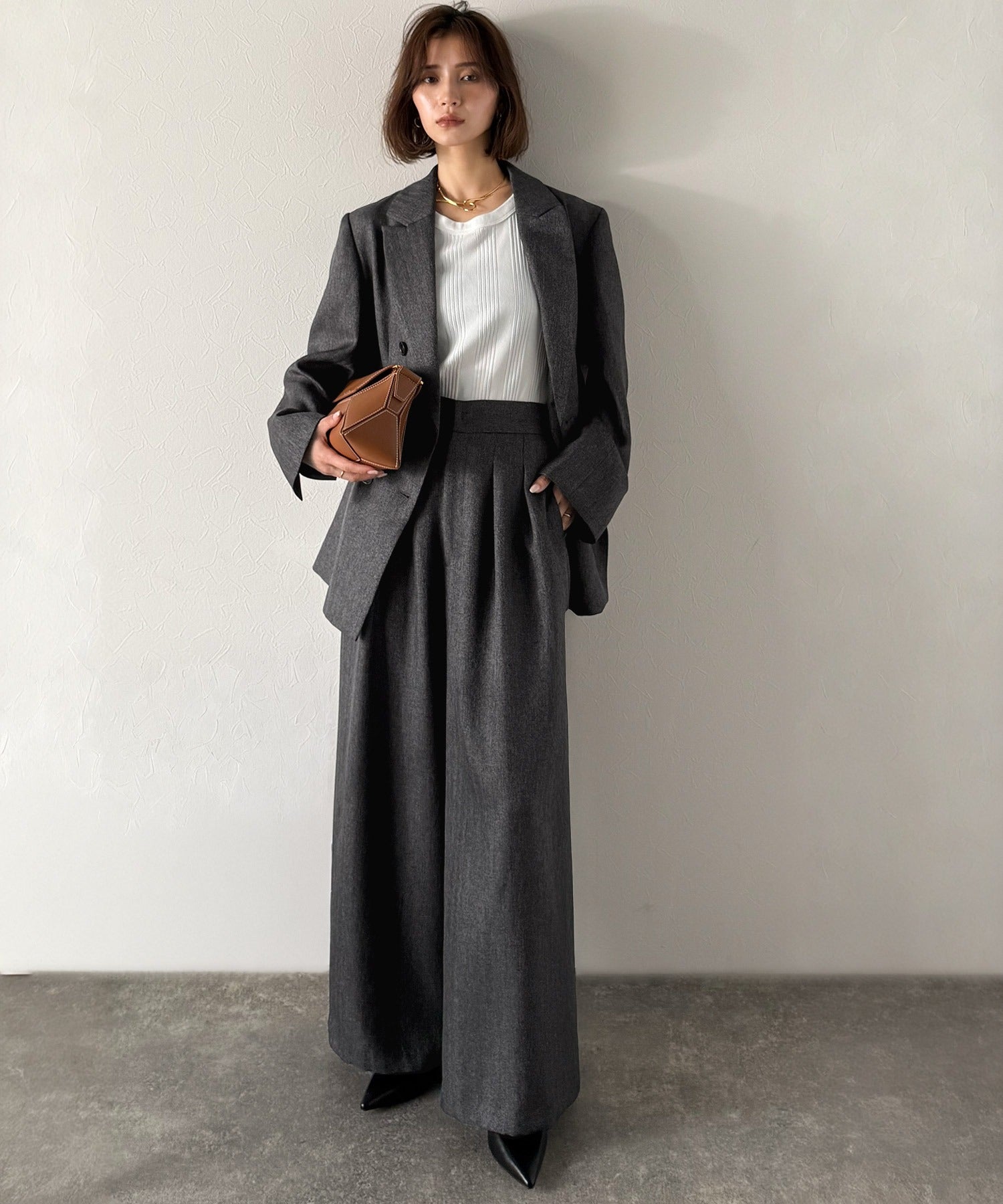 同素材のパンツと合わせれば、秋冬に映える上品なセットアップスタイルが完成します。