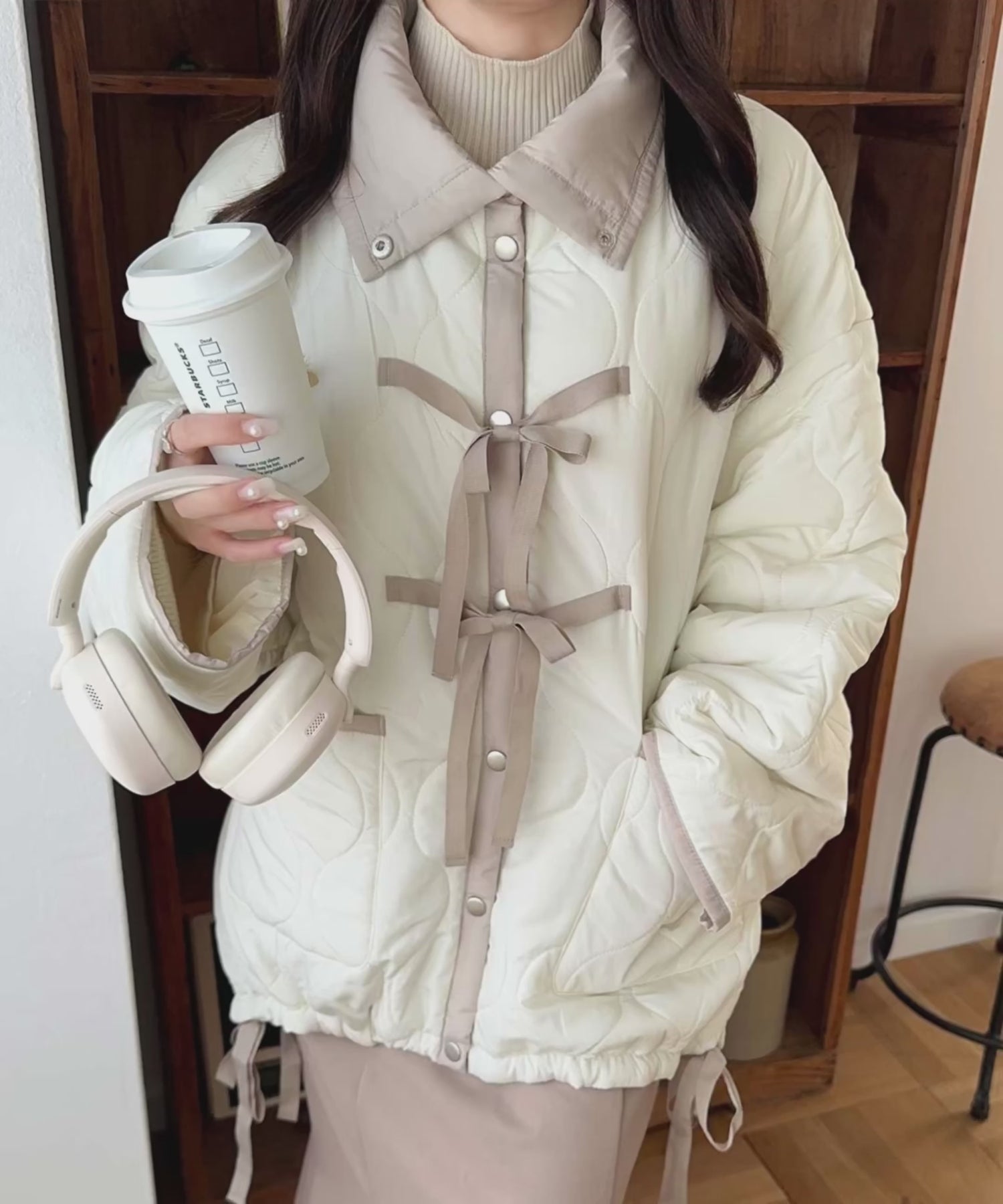 【mily bilet】フェミニンに着こなせる秋冬アウター。リボン使いパイピング配色キルティングモンスターコート mi1019060